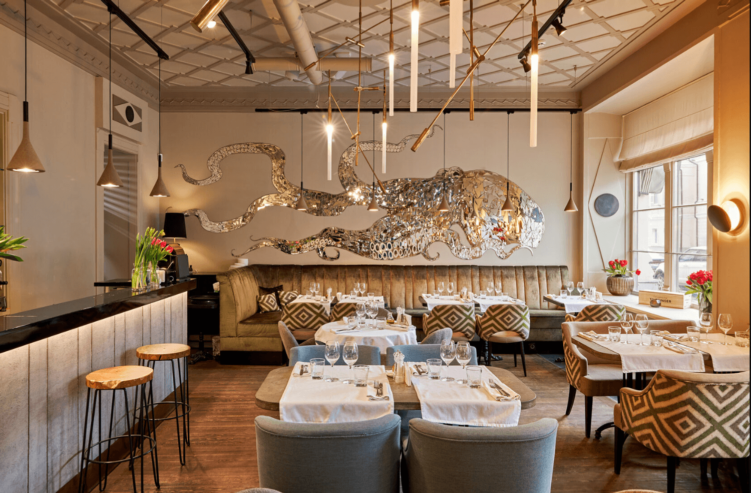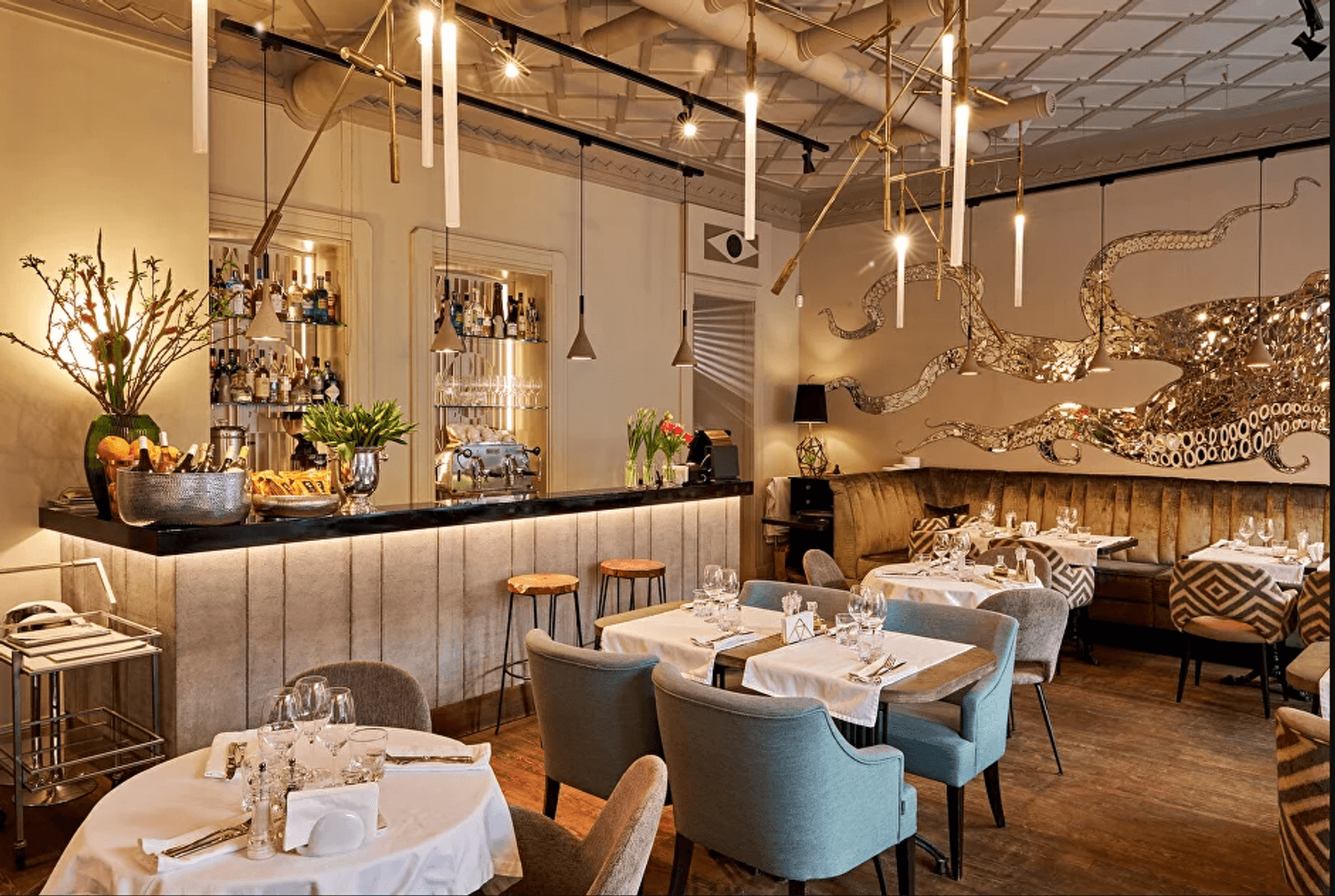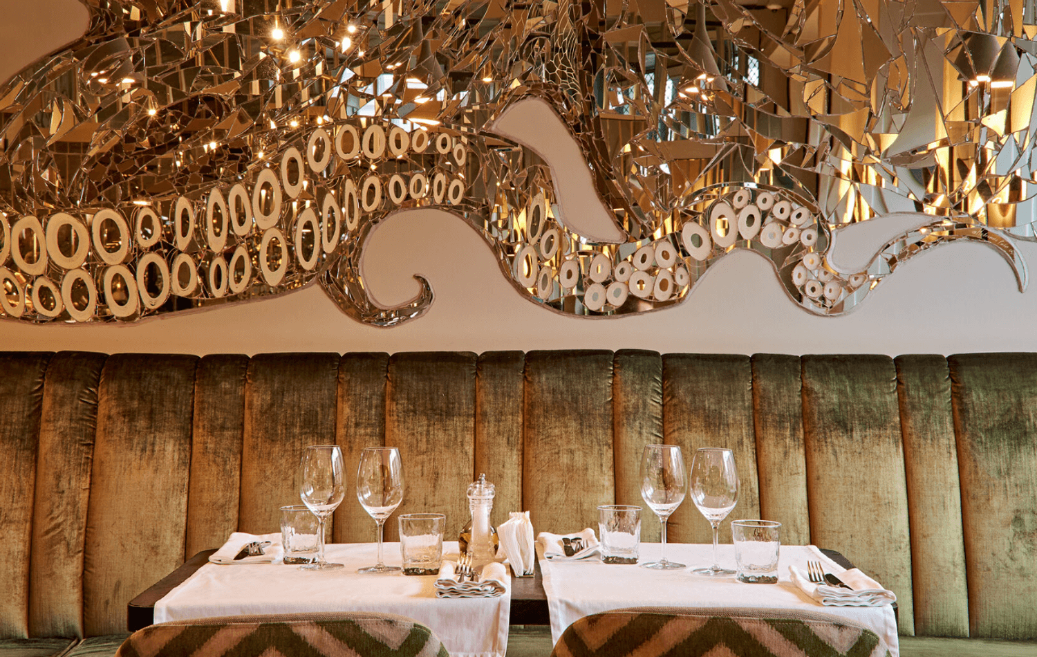 Атмосфера. На первом этаже — светлая молочно-бежевая гамма с золотым изображением осьминога, в подвале — атмосферный бар с цветастым ковром и серебряным драконом на черной стене. Зеркала, бархатные портьеры и округлые светильники создают многослойный интерьер, где каждая деталь становится частью художественного замысла.