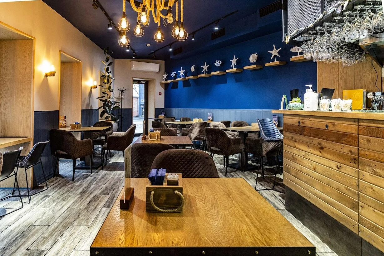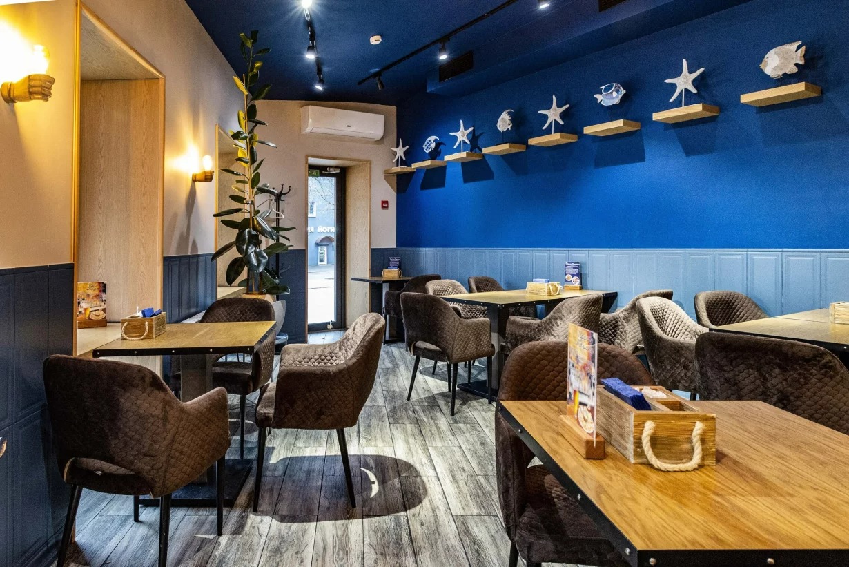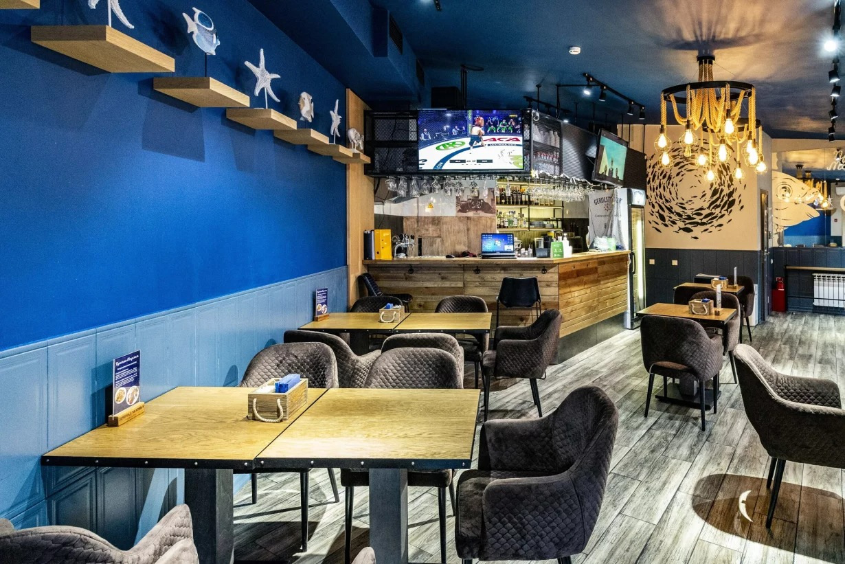 Атмосфера. Внутри морская эстетика: стены в спокойных синих тонах с изображениями рыб, люстры из плетеных канатов. Такая обстановка отражает стиль прибрежного гриль-бара.