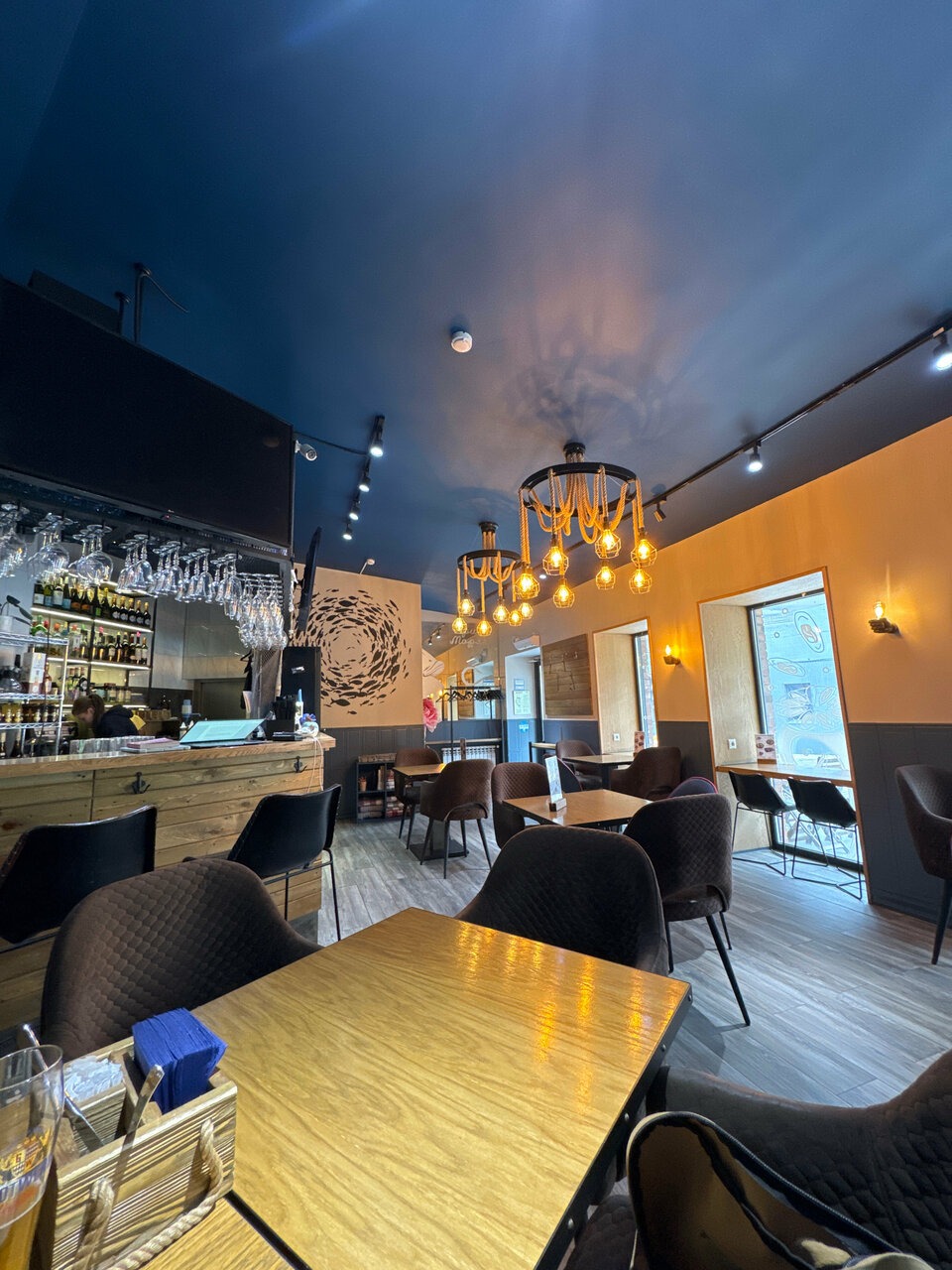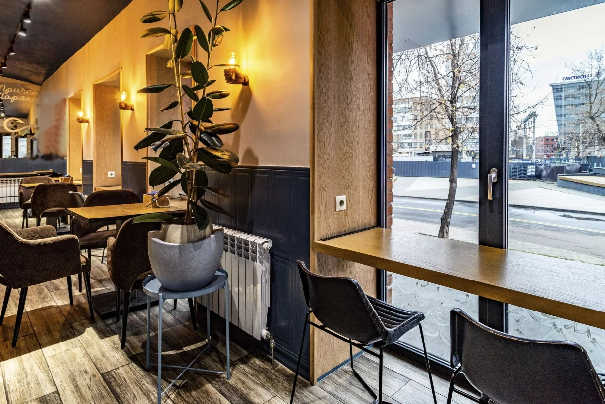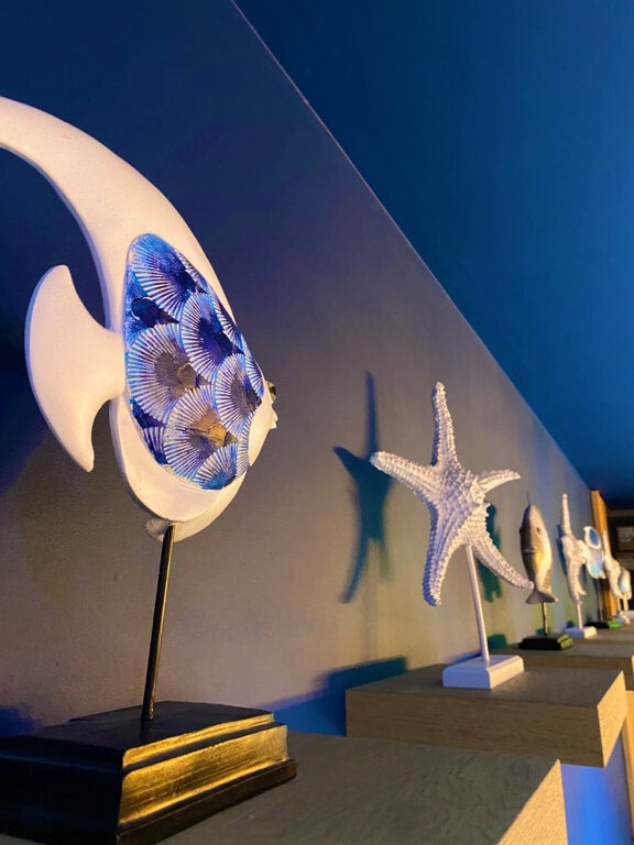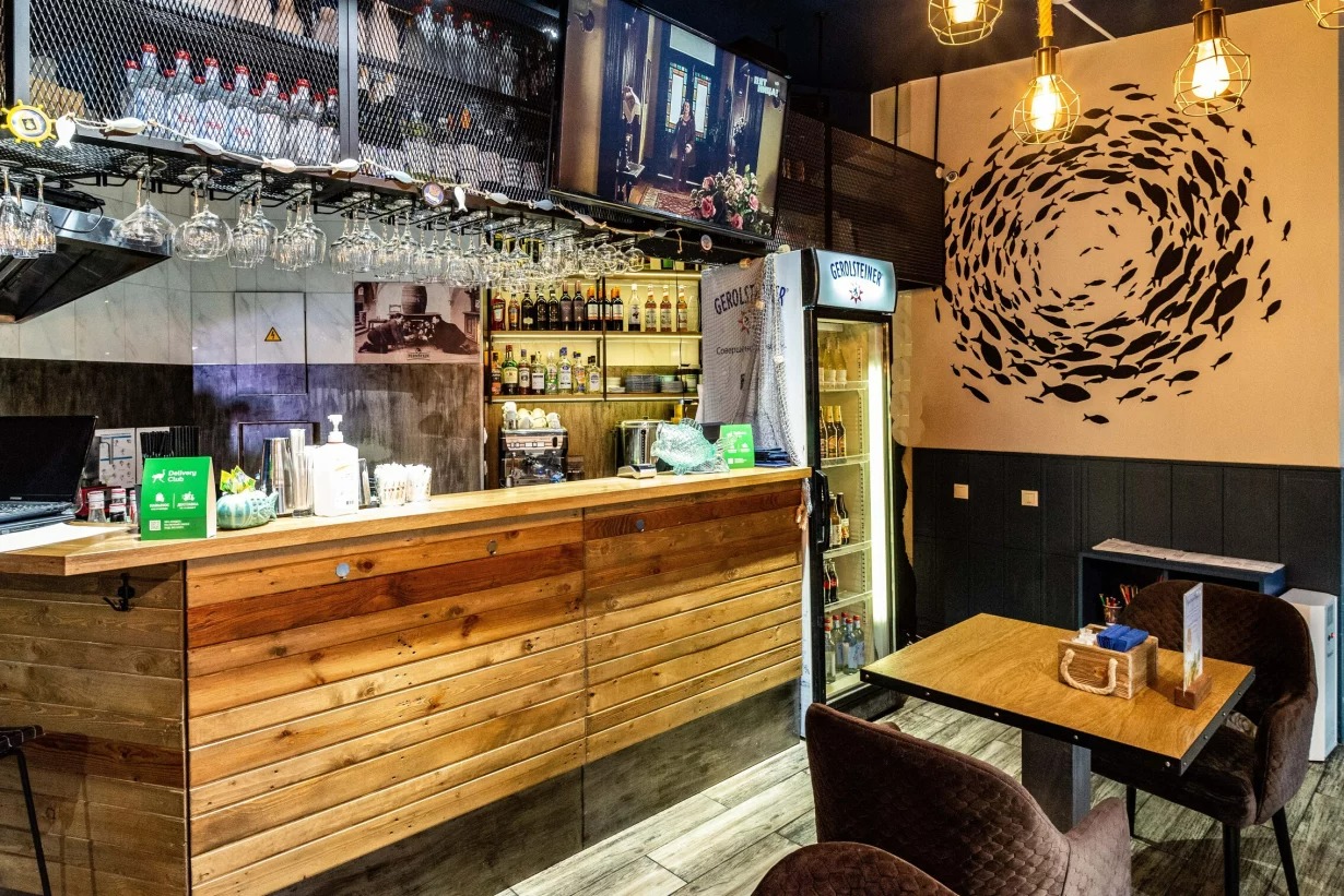 Атмосфера. Внутри морская эстетика: стены в спокойных синих тонах с изображениями рыб, люстры из плетеных канатов. Такая обстановка отражает стиль прибрежного гриль-бара.