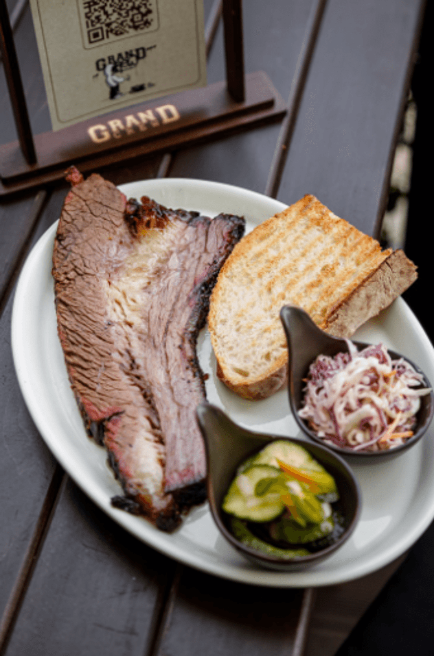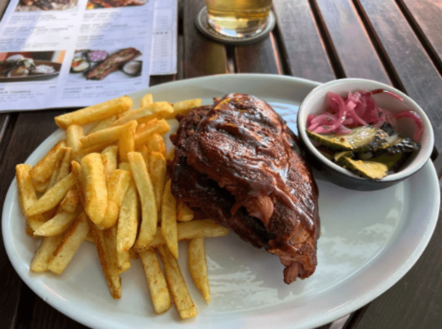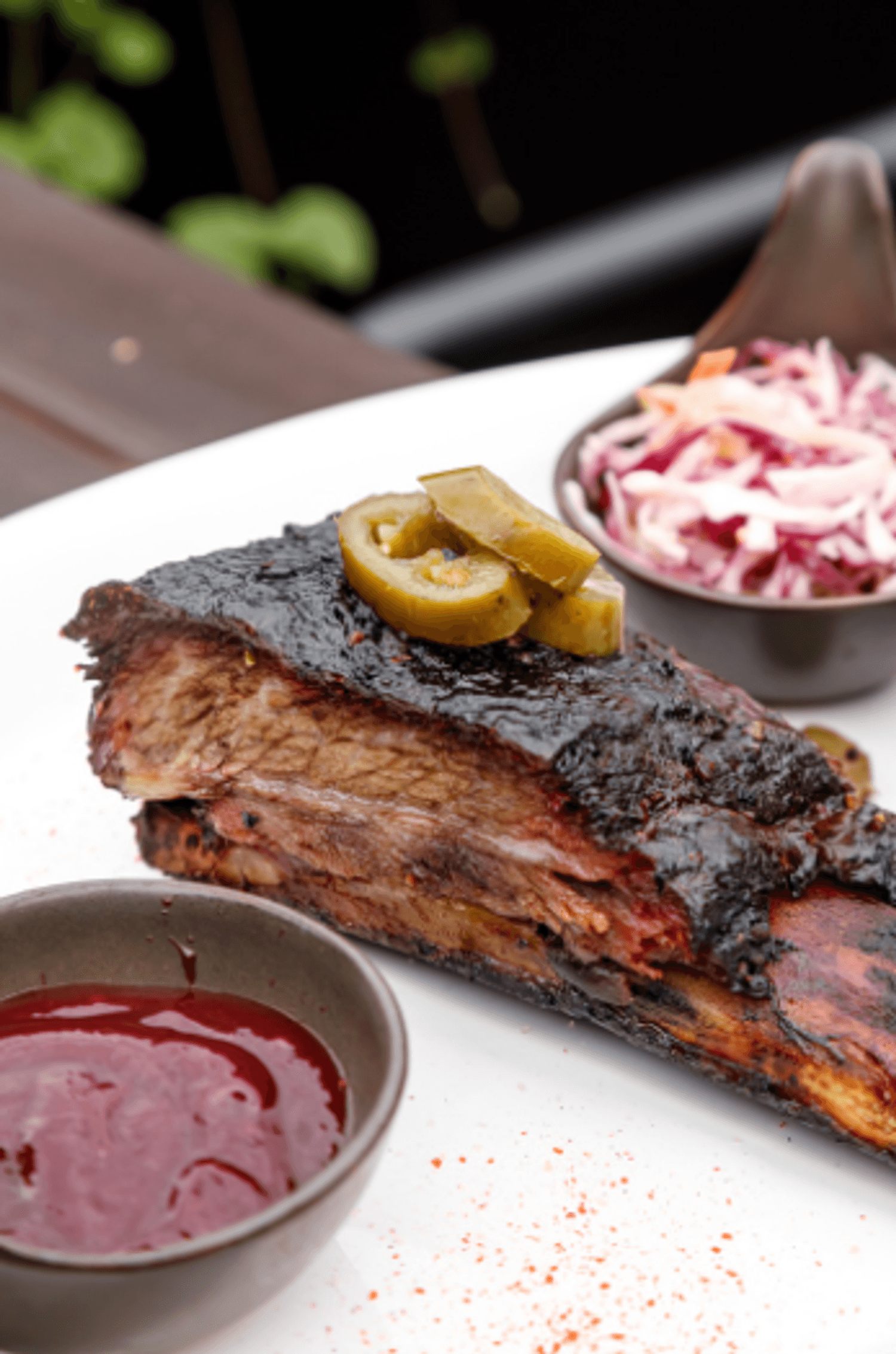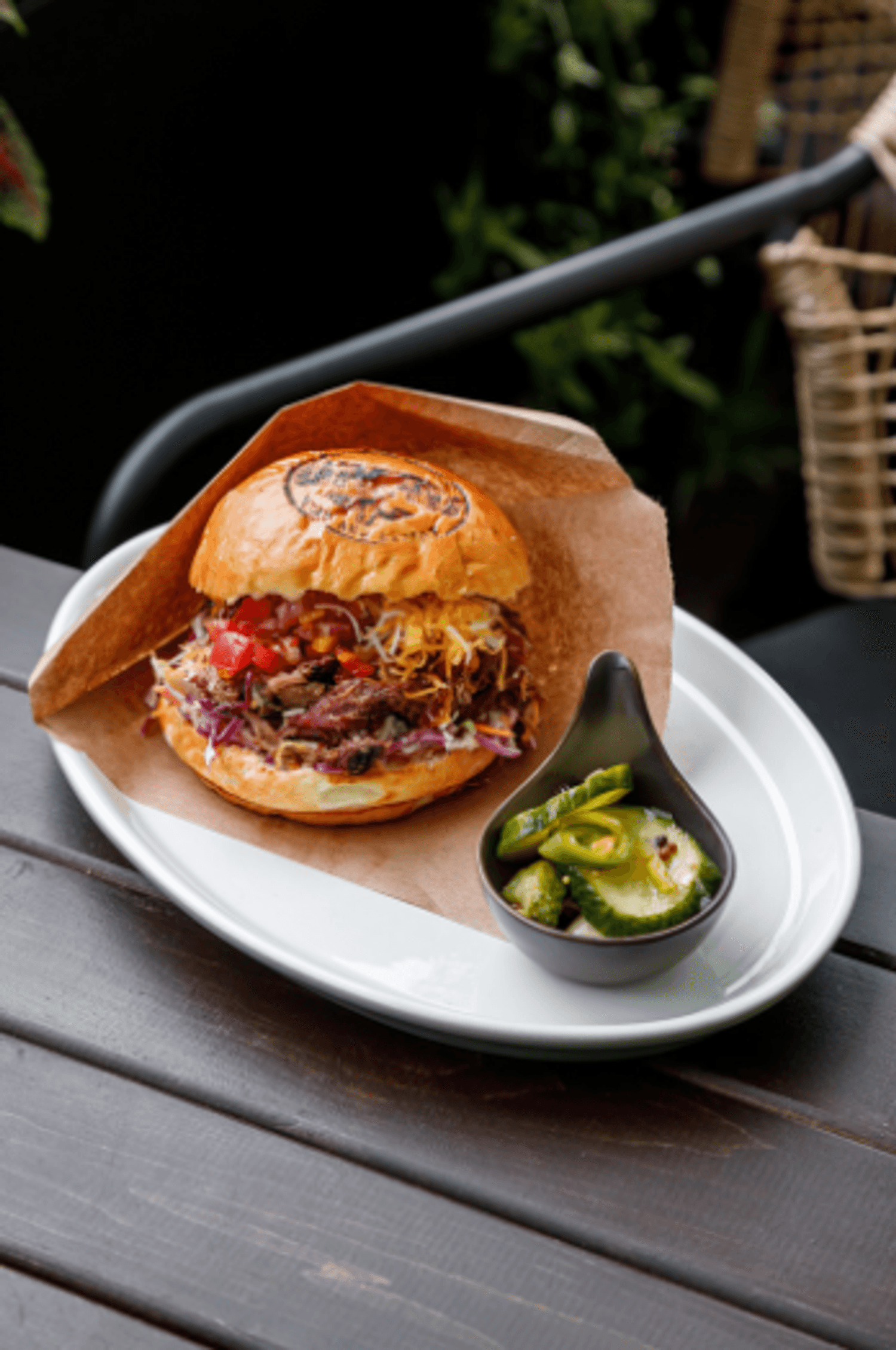 Еда и напитки. Основу меню составляют блюда, приготовленные в смокере: брискет, свиные ребра BBQ, ребра кальби в апельсиновом соусе. Также подают сэндвичи, тако, бургеры и донеры. В баре представлены коктейли на пиве и сидре, крафтовое пиво и вина.