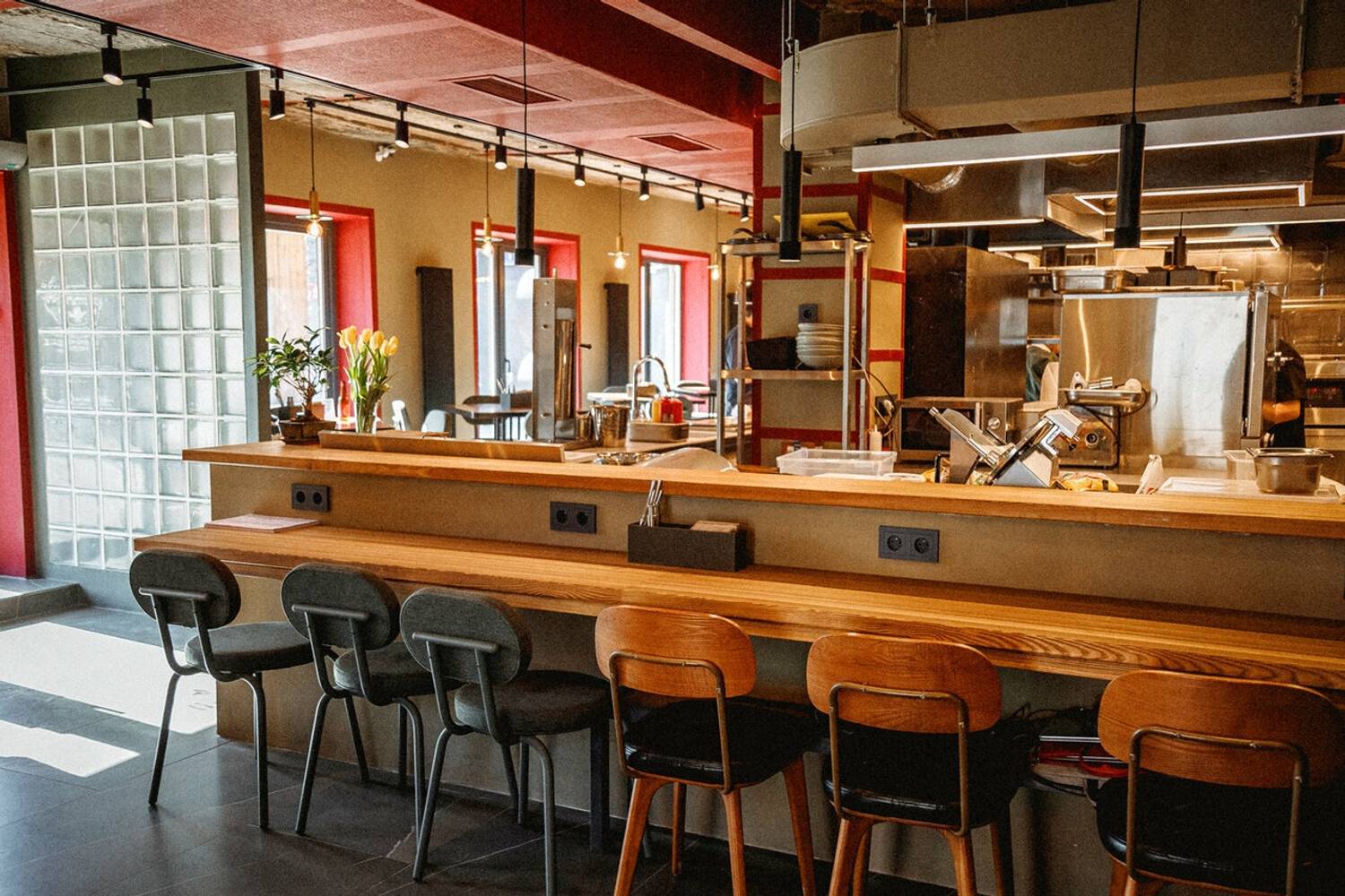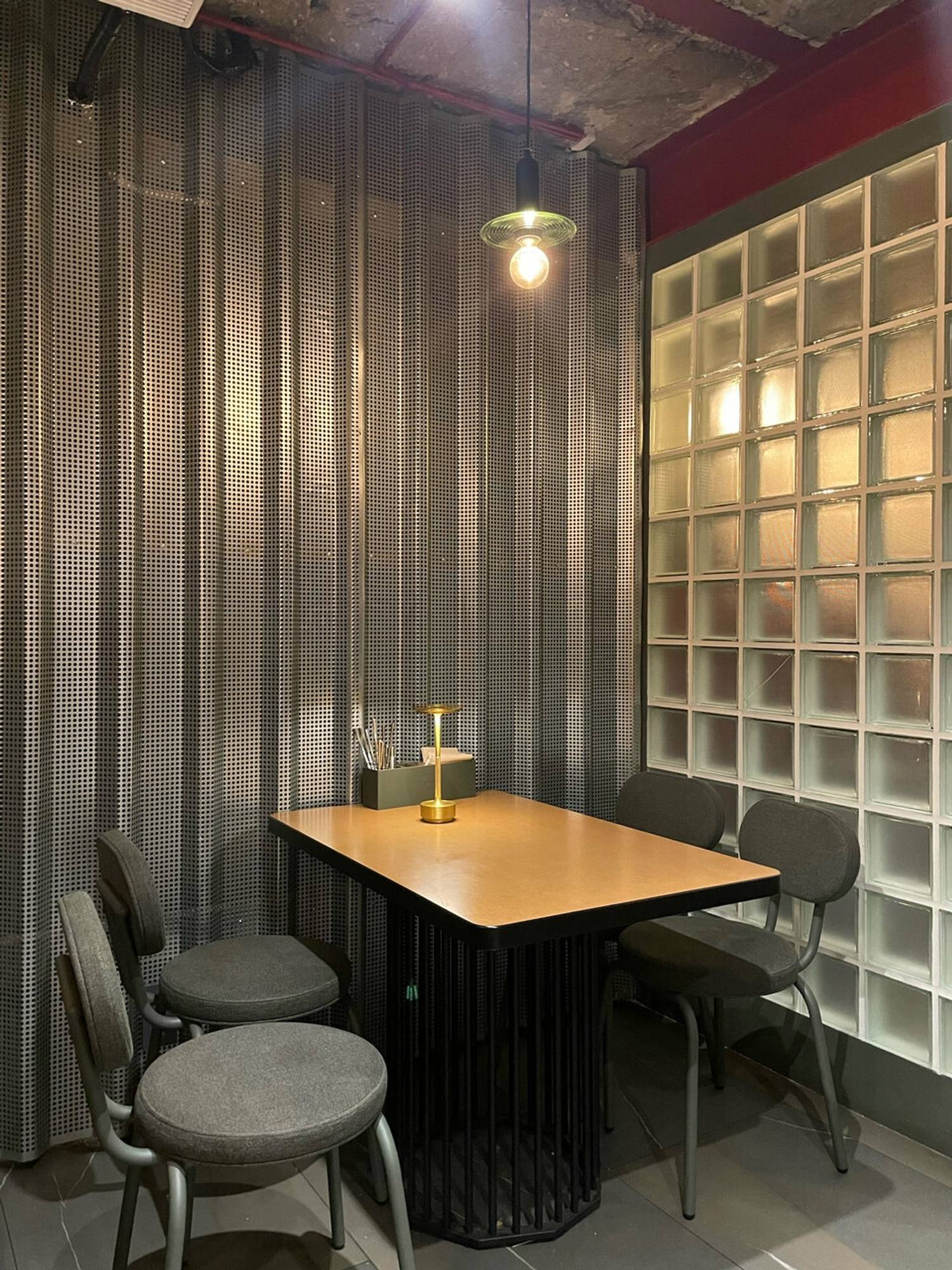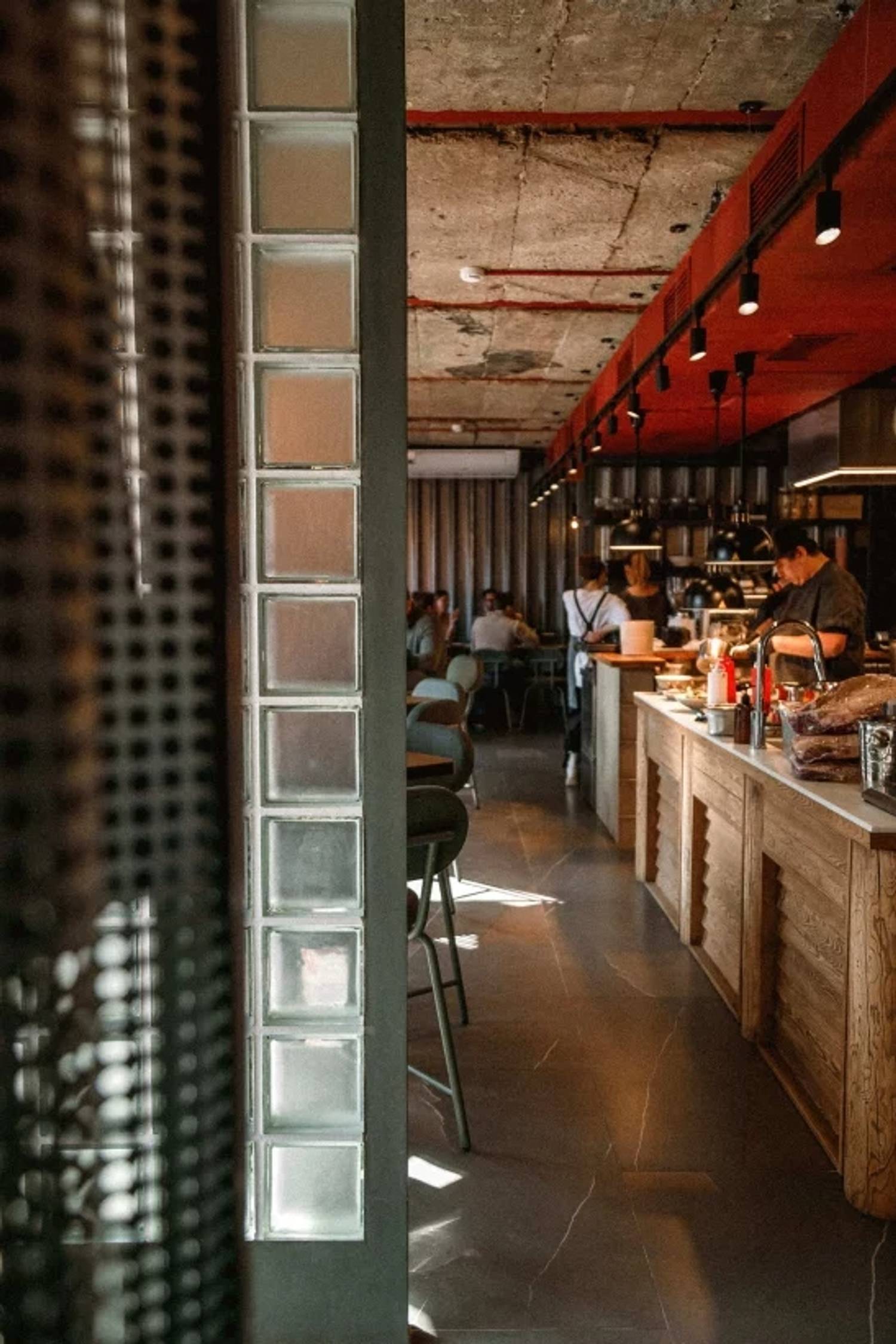 Атмосфера. Пространство в индустриальном стиле с бетонными стенами, стеклоблоками и простой мебелью воссоздает эстетику лофта. Темная палитра с кроваво-красными акцентами и открытая кухня со смокером формируют брутальную, но продуманную обстановку, а летом работает чуть более легкомысленная терраса под тентом.