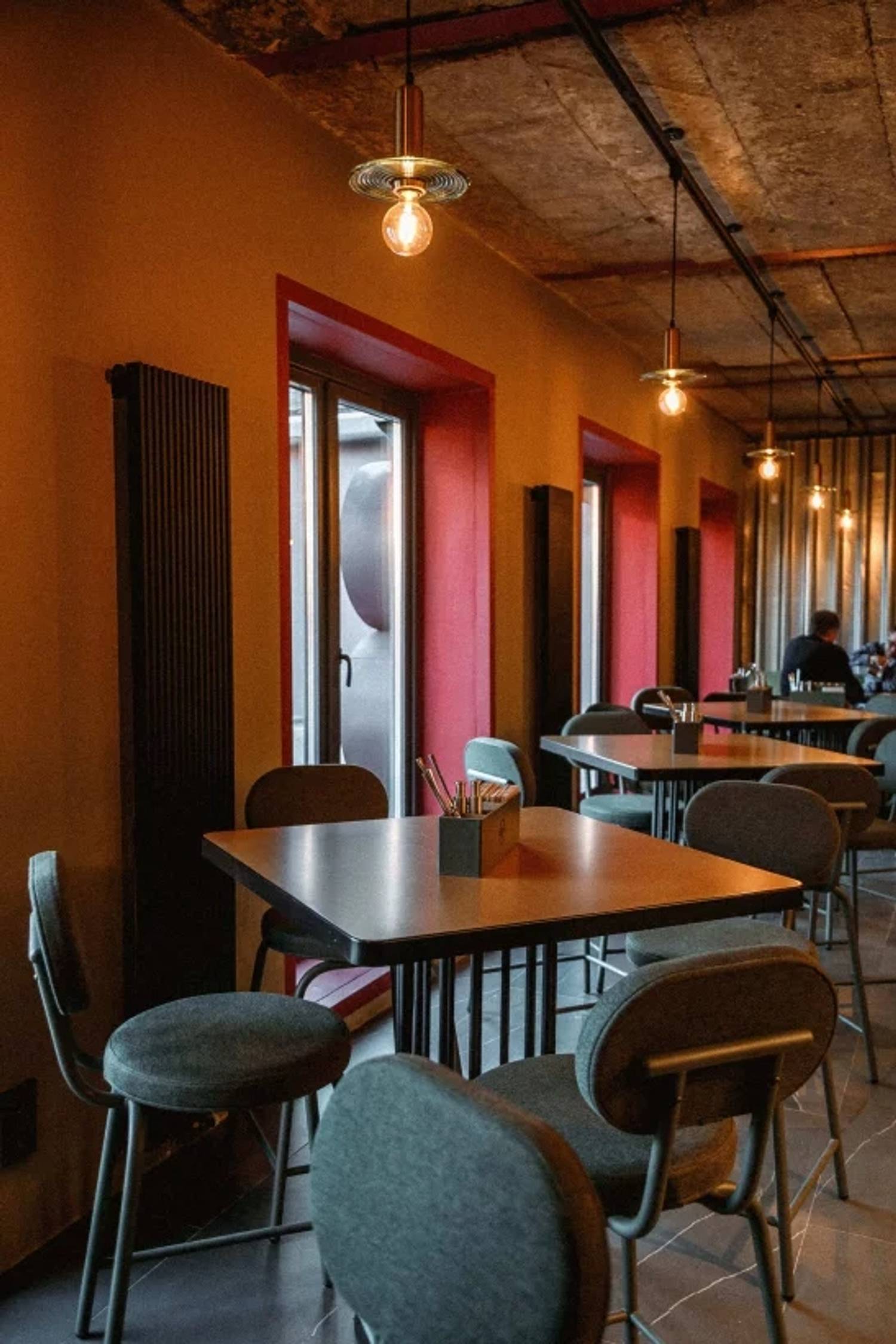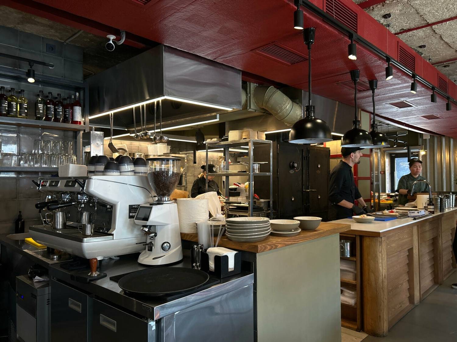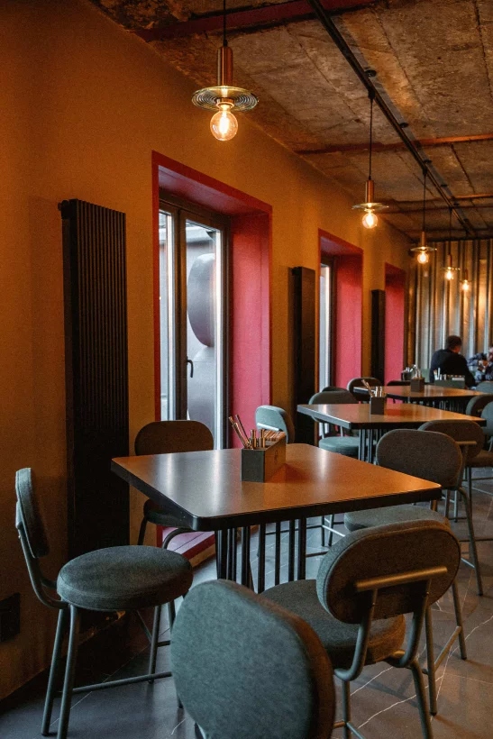 Атмосфера. Пространство в индустриальном стиле с бетонными стенами, стеклоблоками и простой мебелью воссоздает эстетику лофта. Темная палитра с кроваво-красными акцентами и открытая кухня со смокером формируют брутальную, но продуманную обстановку, а летом работает чуть более легкомысленная терраса под тентом.