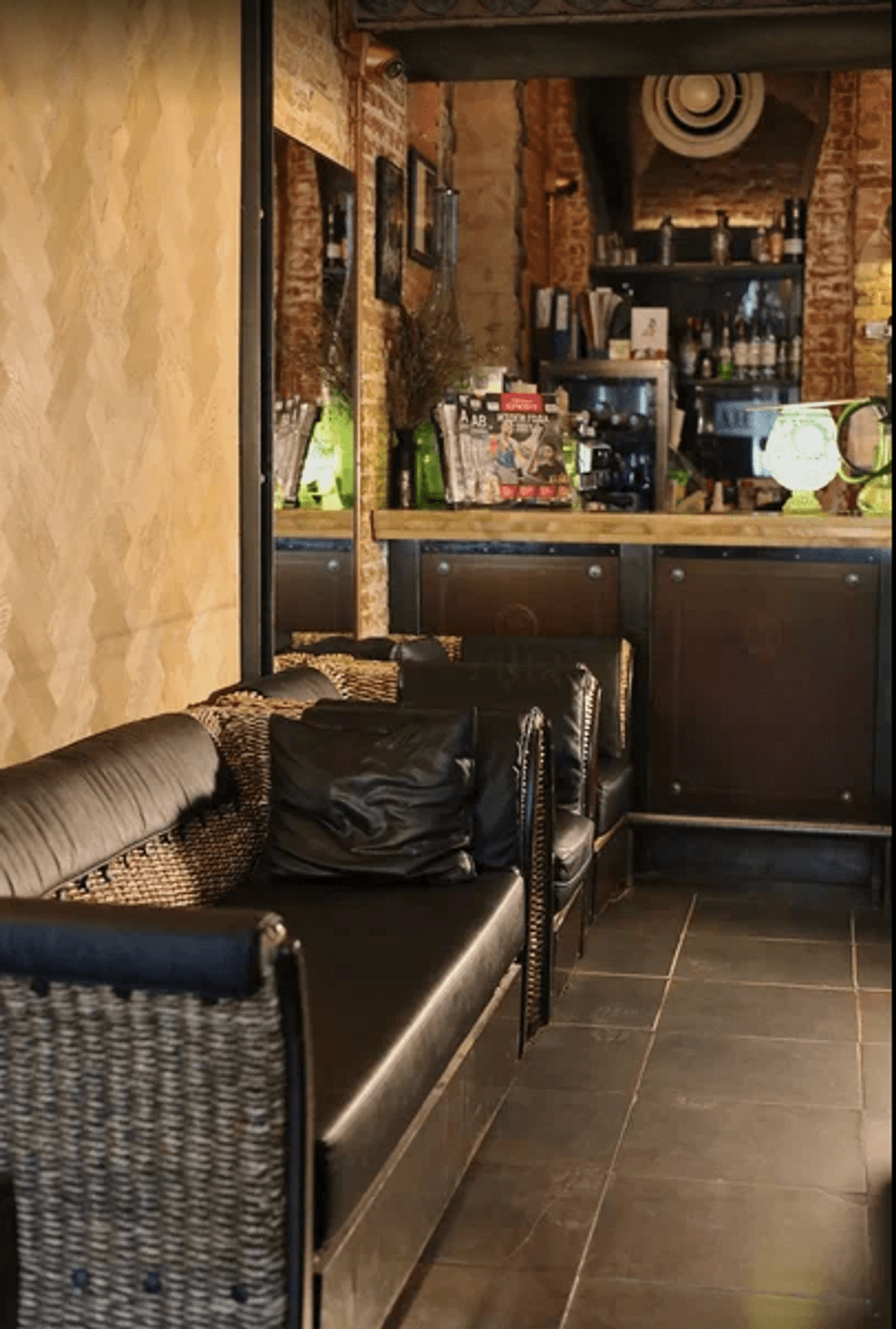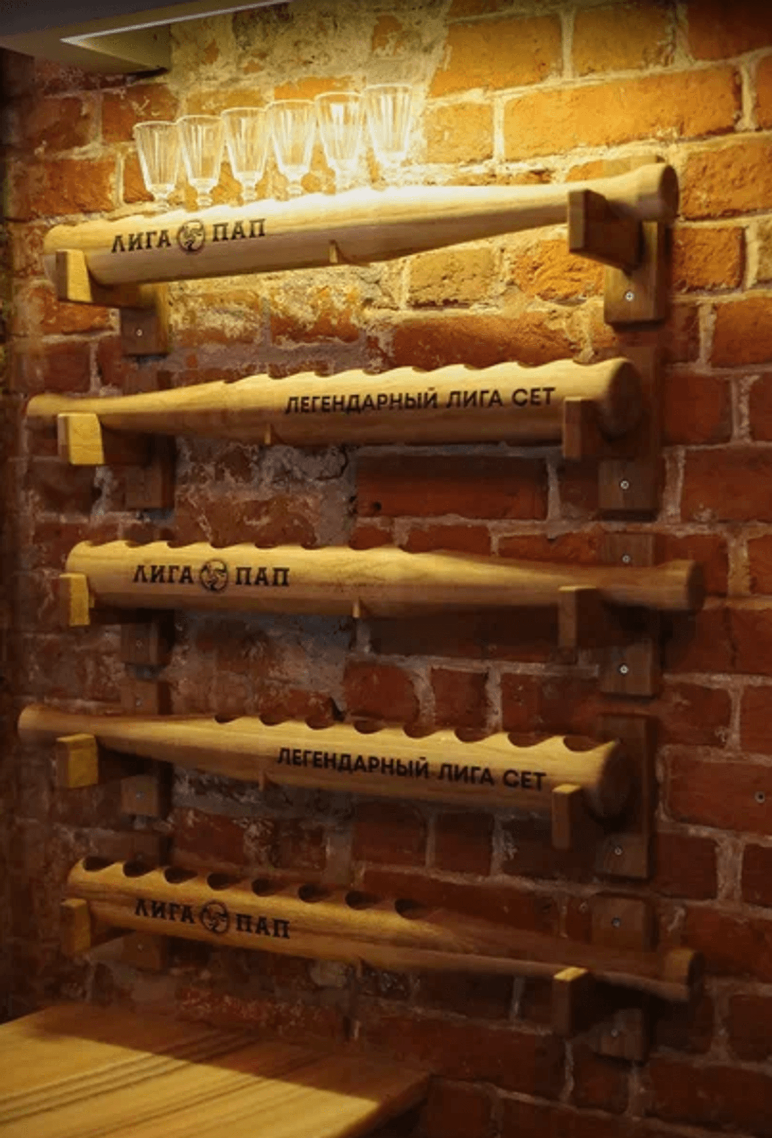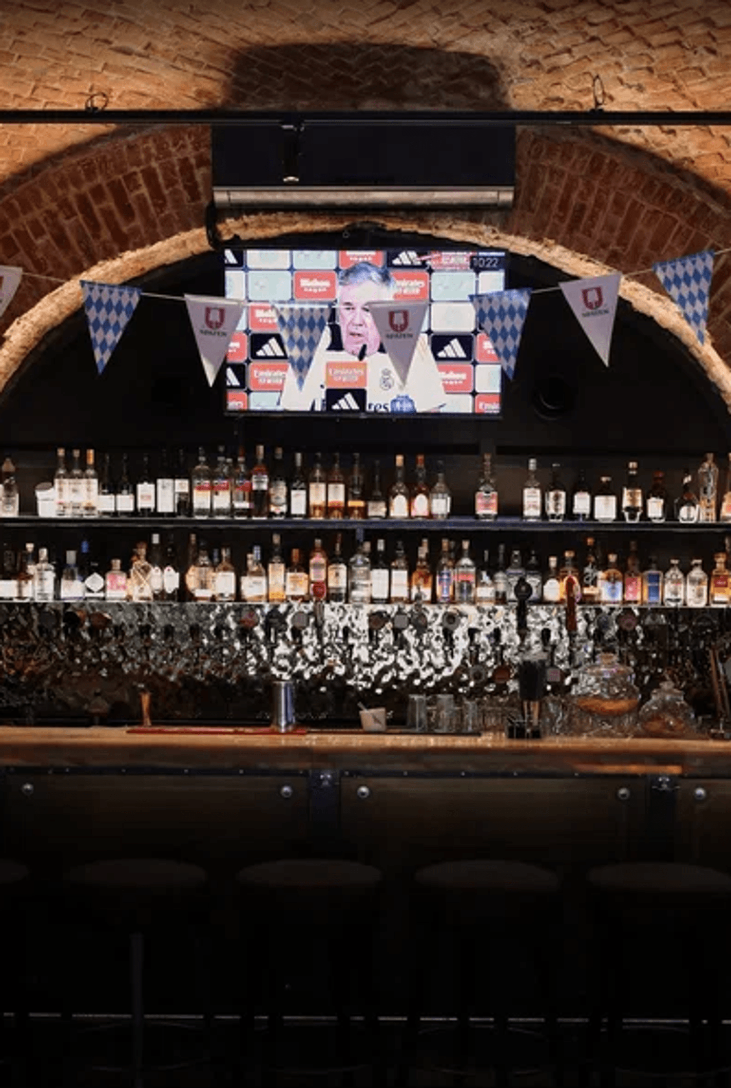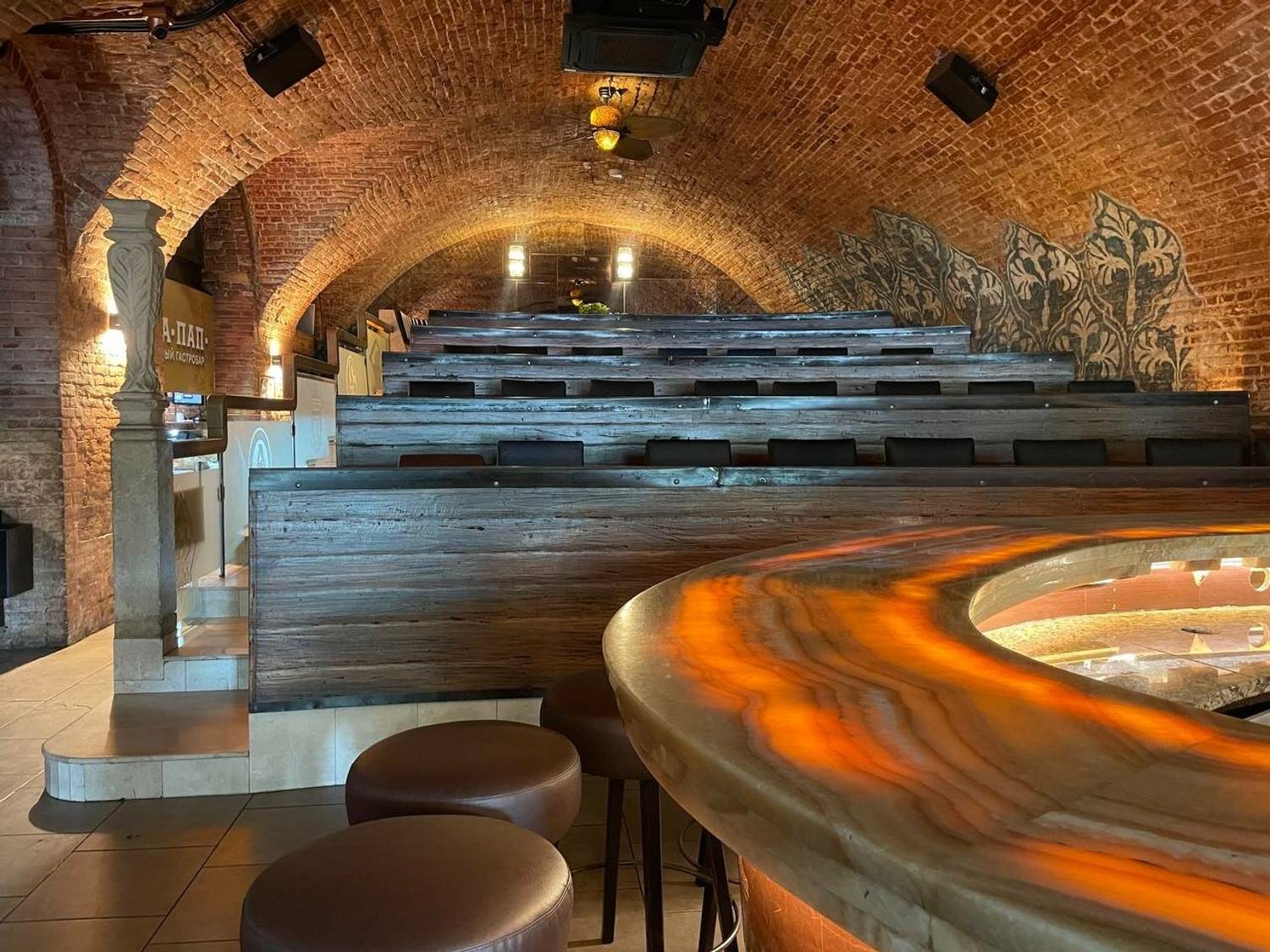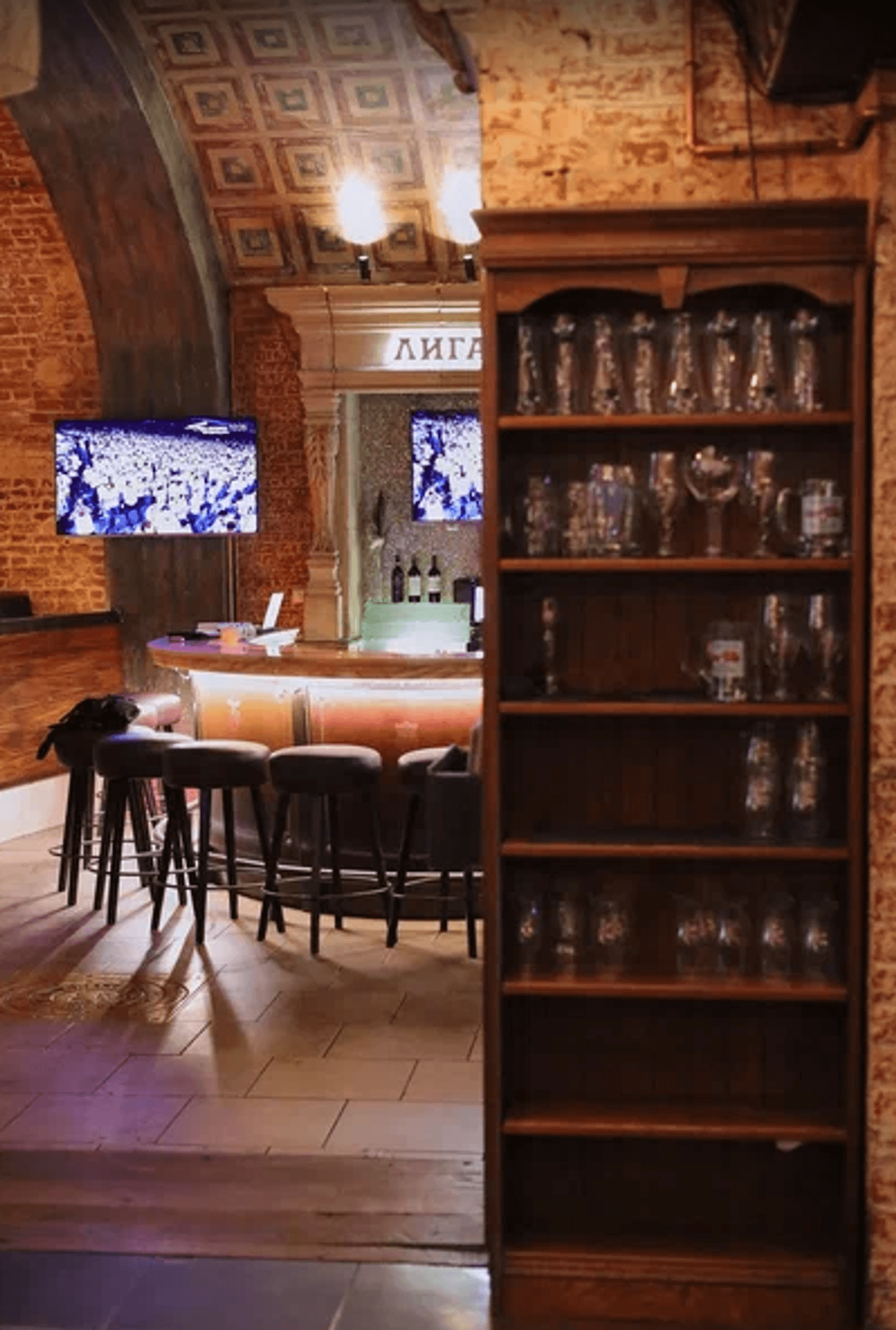 Атмосфера. В заведении три зала с каменными сводами, кирпичными стенами и деревянной мебелью, оборудованных десятками экранов и проекторами. Главный зал примечателен тем, что имеет специальный амфитеатр-трибуну для просмотра матчей: таким образом происходящее на экране видно из любой точки зала и никто не будет загораживать вам обзор. Здесь транслируют футбол, хоккей, UFC и Формулу-1 с комментариями.