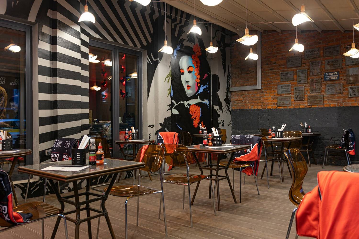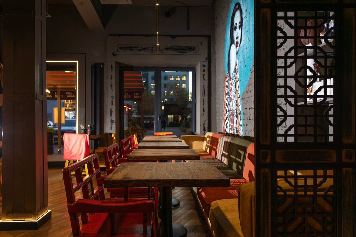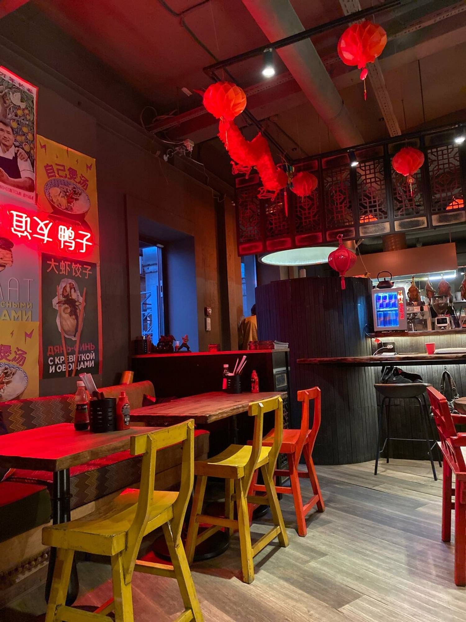Атмосфера. Заведение в стиле кафе на улицах Шанхая: красные фонарики, с неоновыми иероглифами, металлические перегородки, а стена с черными утками в красной подсветке создает инсталляционный акцент. Летом работает терраса во дворе арт-кластера.
