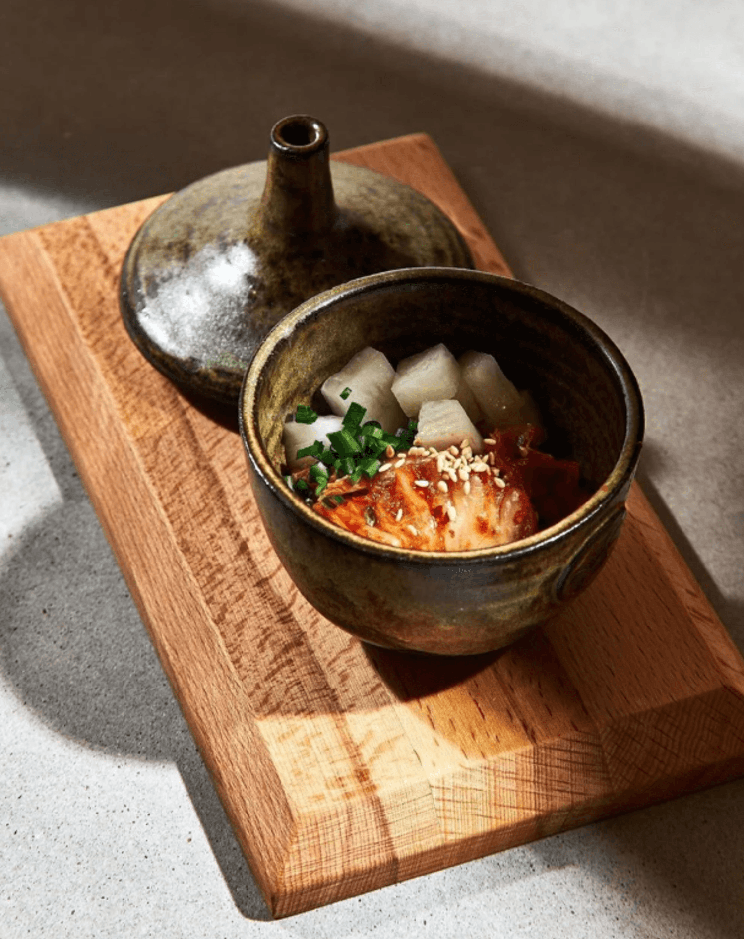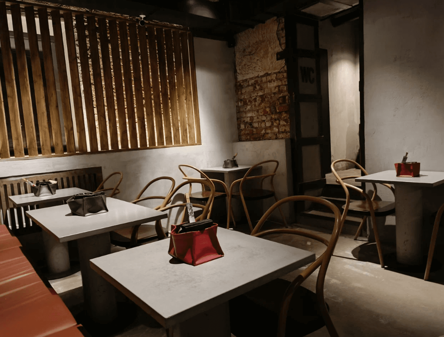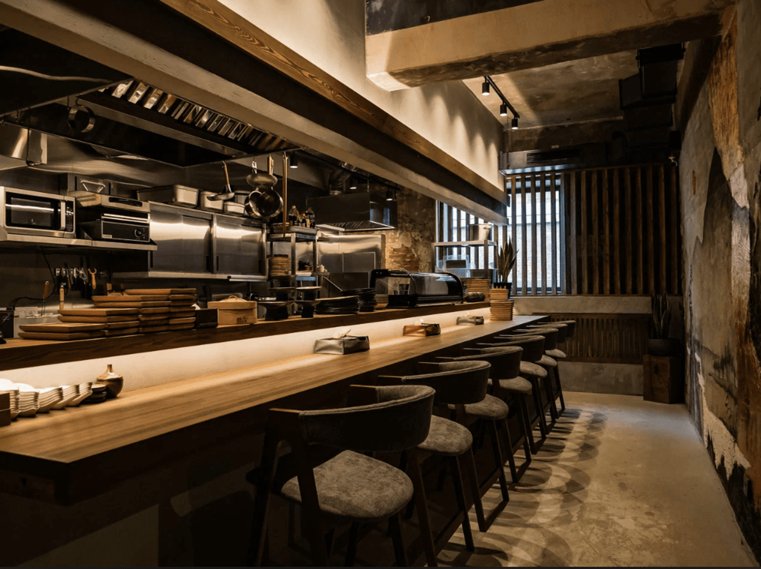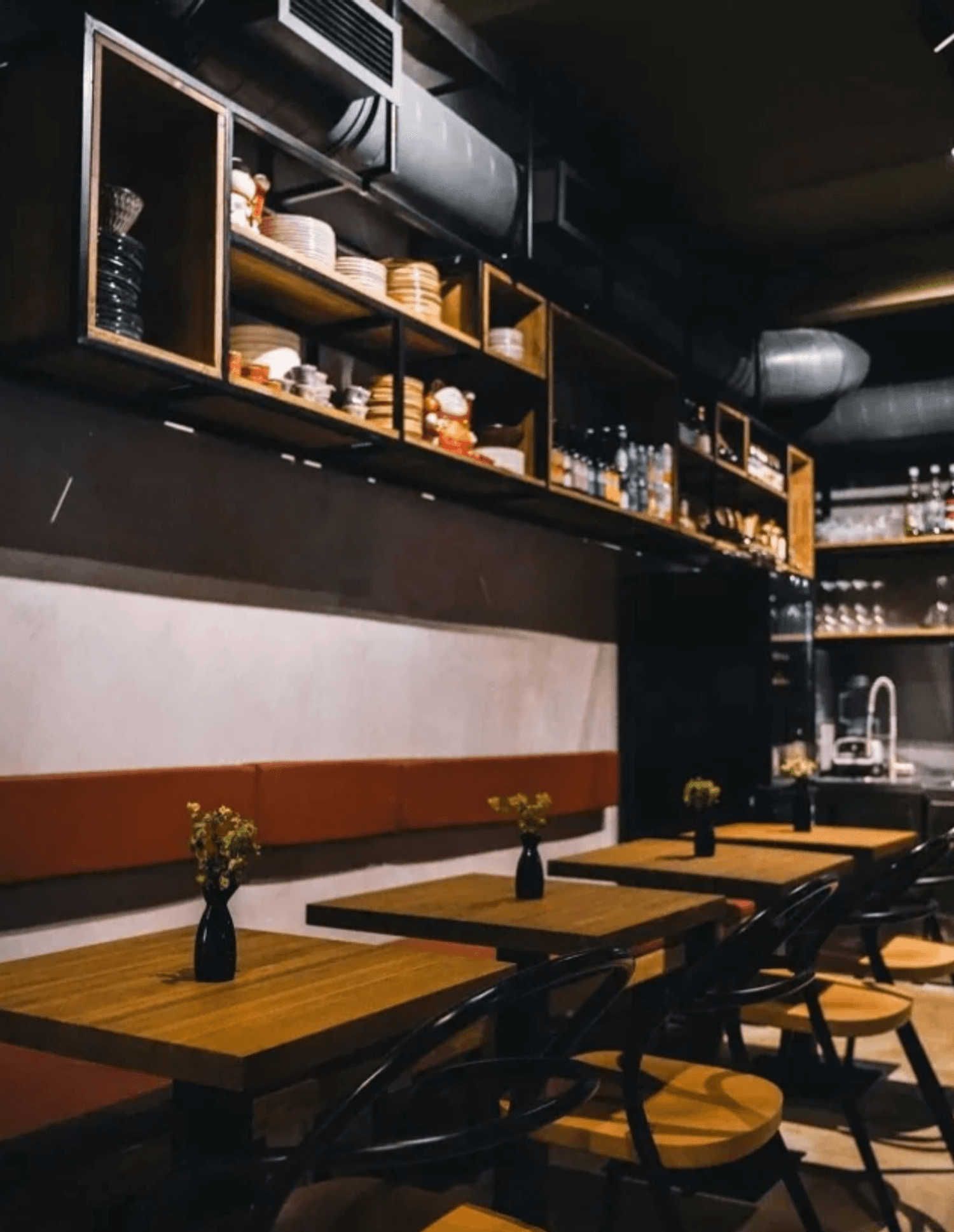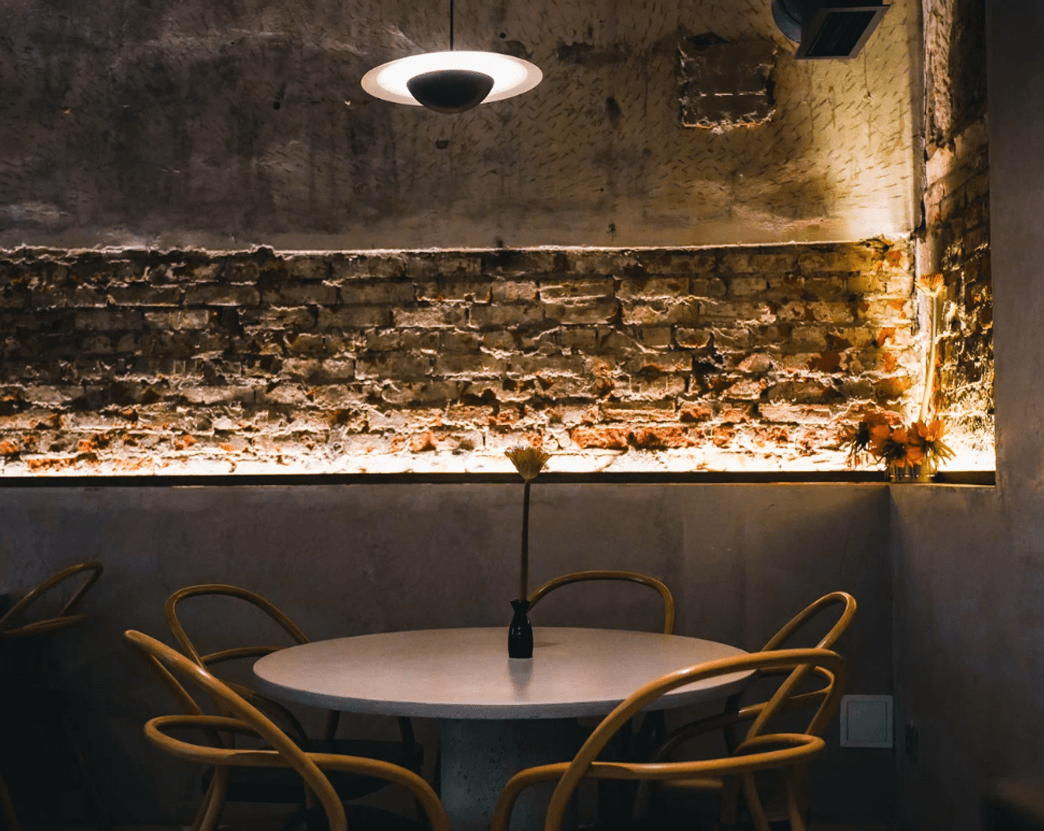 Атмосфера. Интерьер выполнен в стиле индустриального романтизма: в нем соединились бетон, дерево и камень, что создает лаконичное, современное и одновременно уютное пространство. Присутствует много деталей ручной работы: например, авторская керамика и деревянные доски по эскизам шефа. Минималистичная мебель и приглушенный свет подчеркивают философию осознанного минимализма, которой руководствовались создатели заведения.