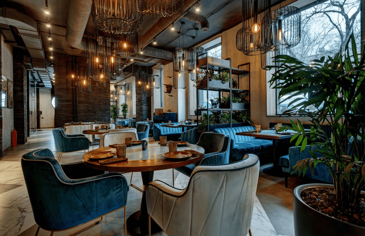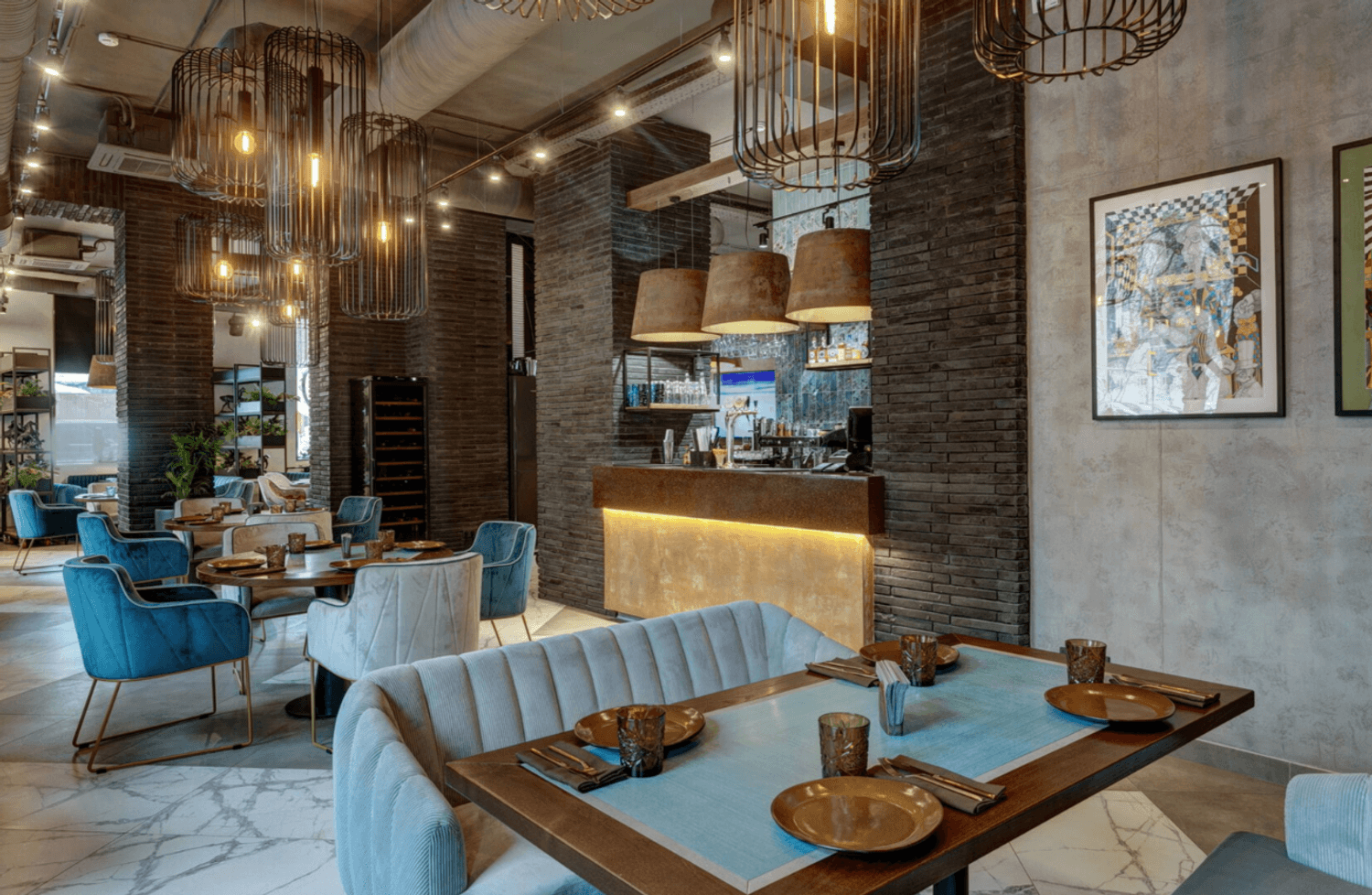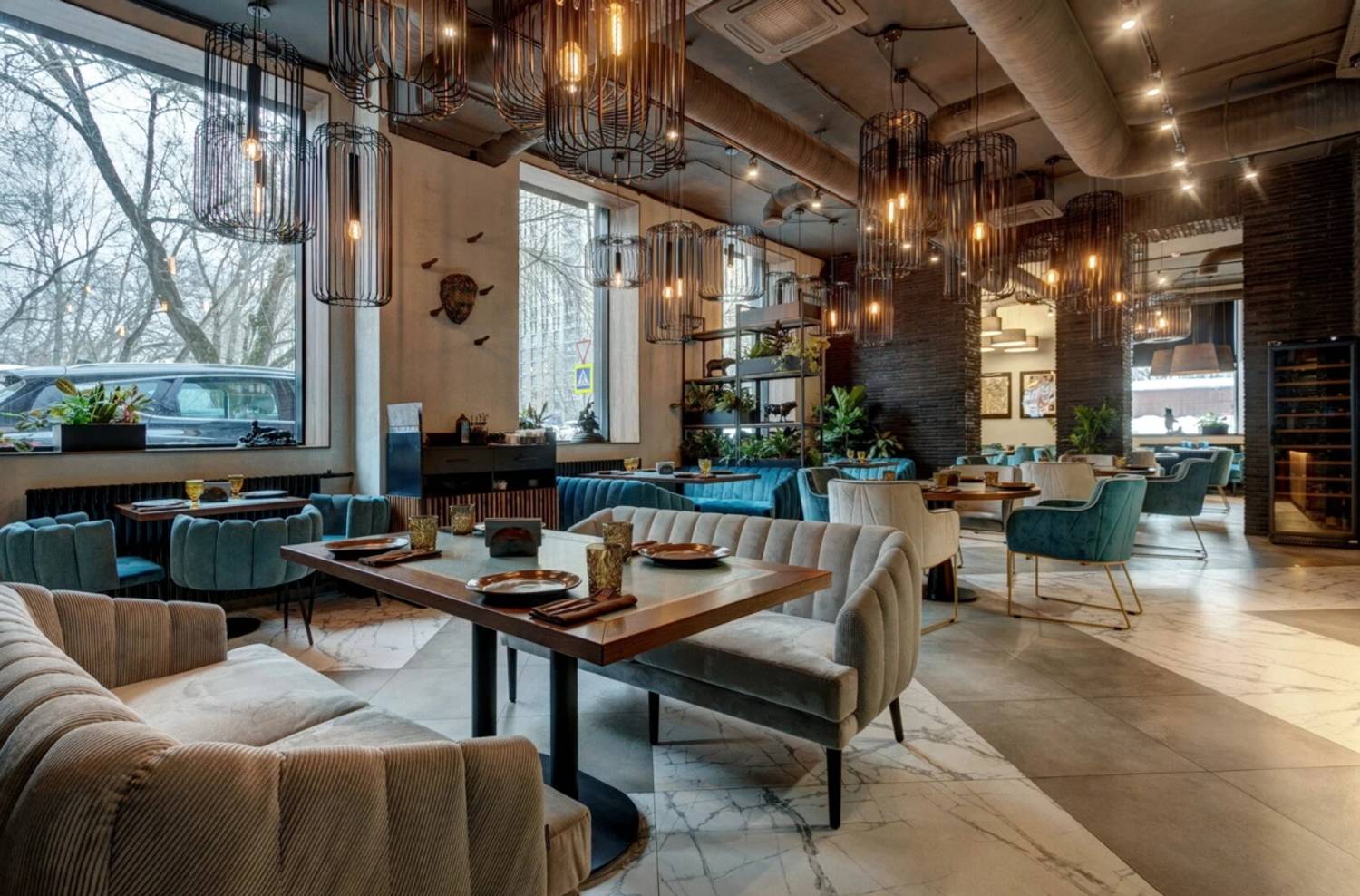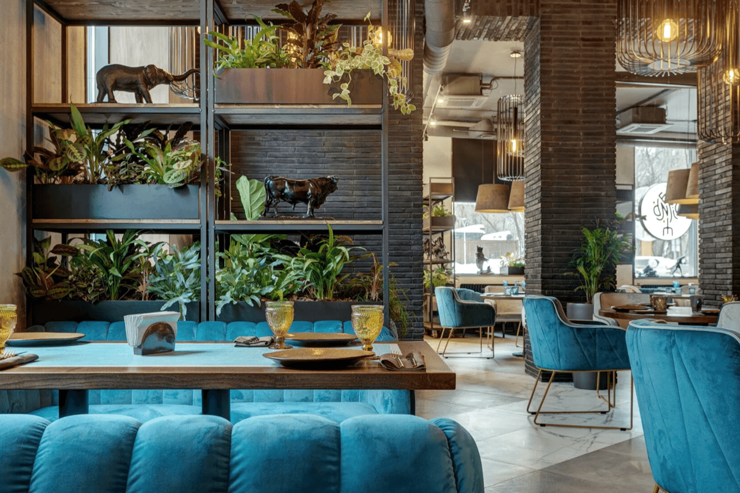 Атмосфера. Пространство в стиле лофт с серыми стенами, кирпичными вставками и скандинавскими акцентами создает визуальную многослойность, отсылая к «наслоению» культур и их пересечению друг с другом. В заведении мягкая мебель в сдержанной серо-голубой палитре, дизайнерские светильники в клетках и живые растения. Благодаря универсальности обстановки пространство подходит как для уединения, так и для встреч с друзьями.