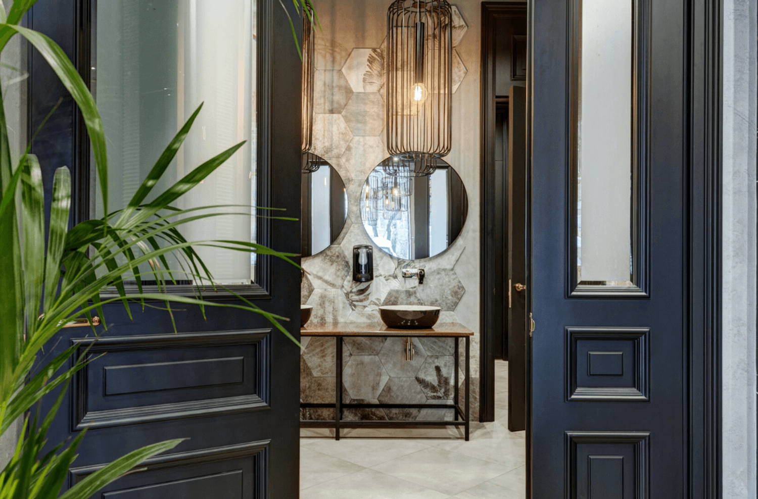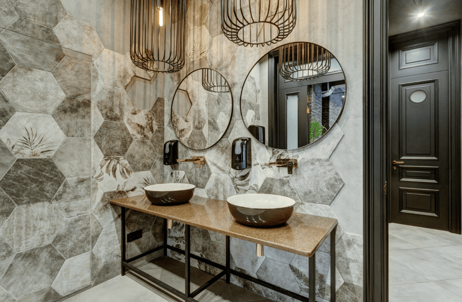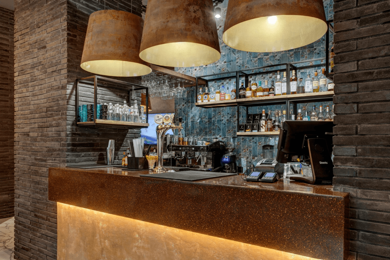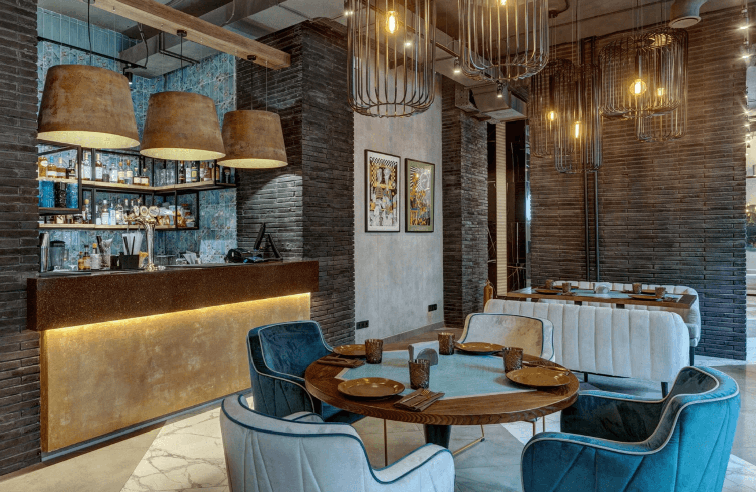 Атмосфера. Пространство в стиле лофт с серыми стенами, кирпичными вставками и скандинавскими акцентами создает визуальную многослойность, отсылая к «наслоению» культур и их пересечению друг с другом. В заведении мягкая мебель в сдержанной серо-голубой палитре, дизайнерские светильники в клетках и живые растения. Благодаря универсальности обстановки пространство подходит как для уединения, так и для встреч с друзьями.