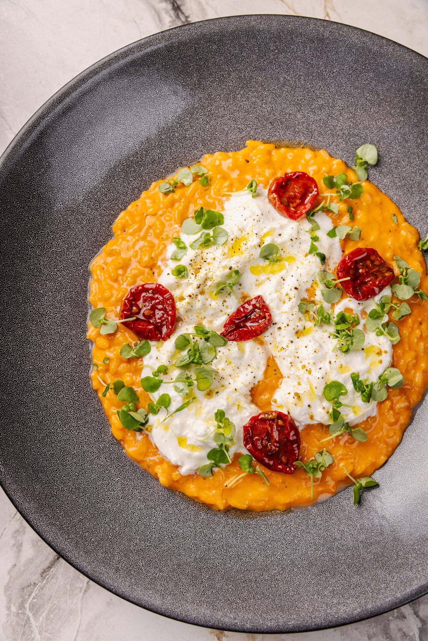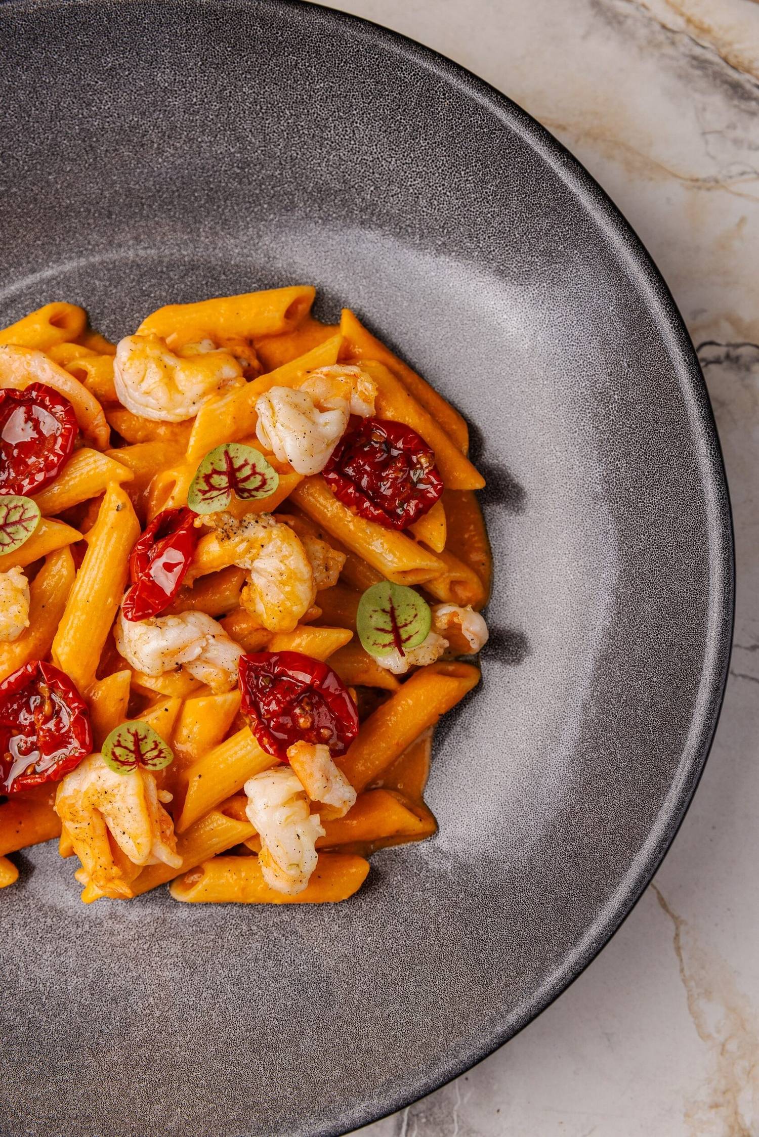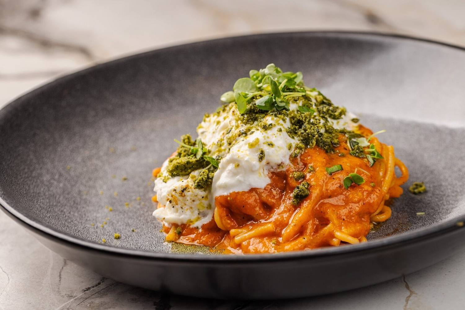 Еда и напитки. В меню от бренд-шефа Марко Якетты сочетаются итальянская паста и морской окунь, буррата с персиком и хрустящие баклажаны, стейк на хоспере и тартар из тунца. На десерт предлагают шоколадный медовик и ганаш из белого шоколада.