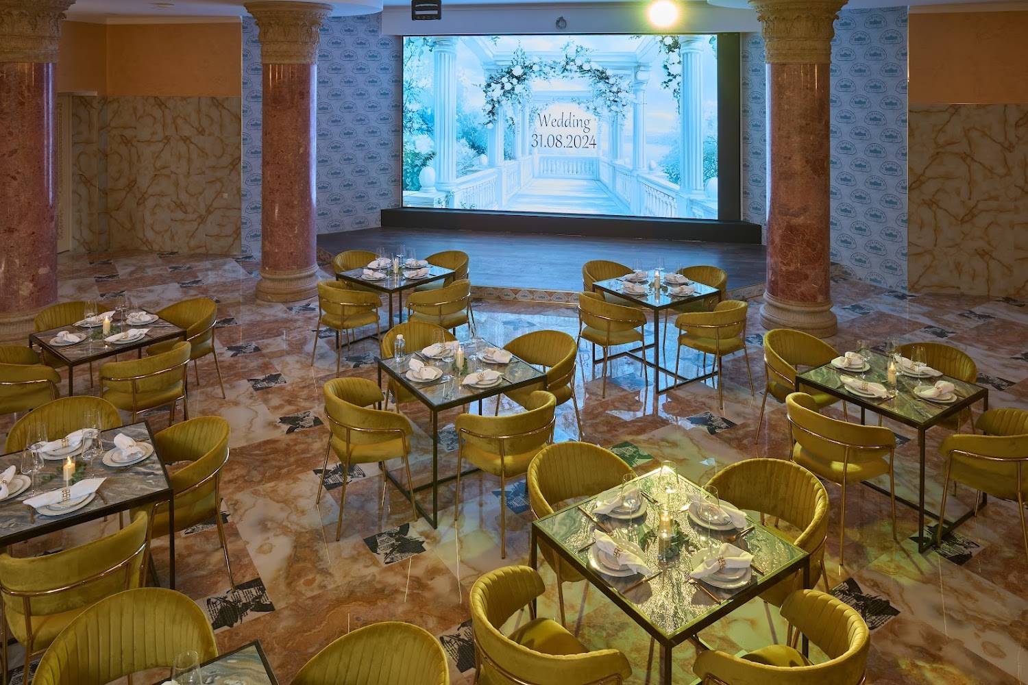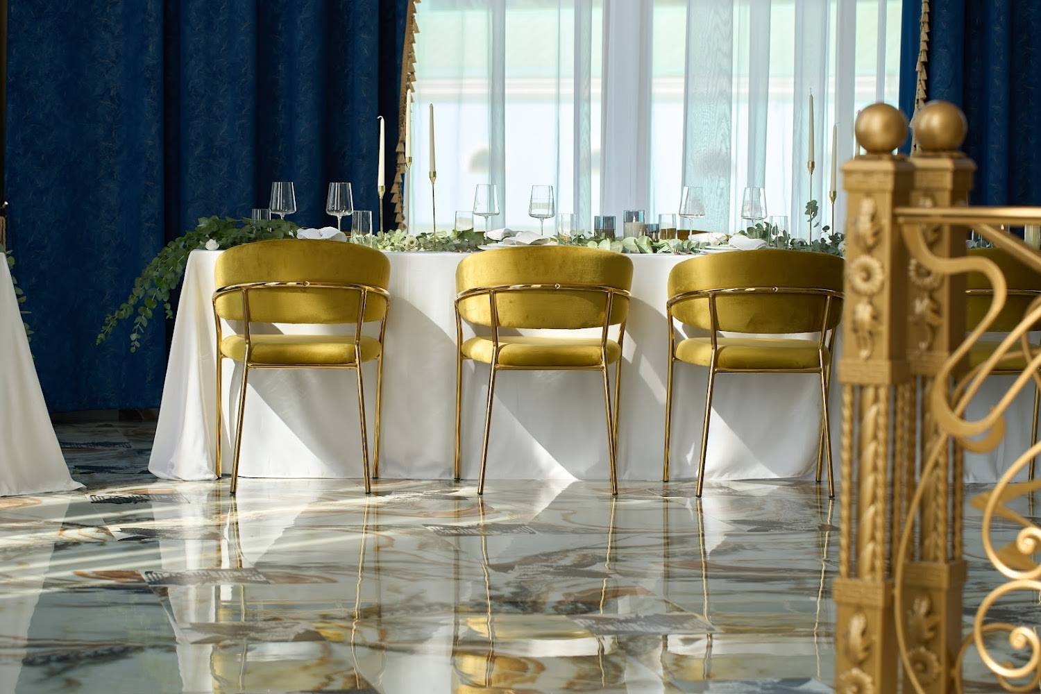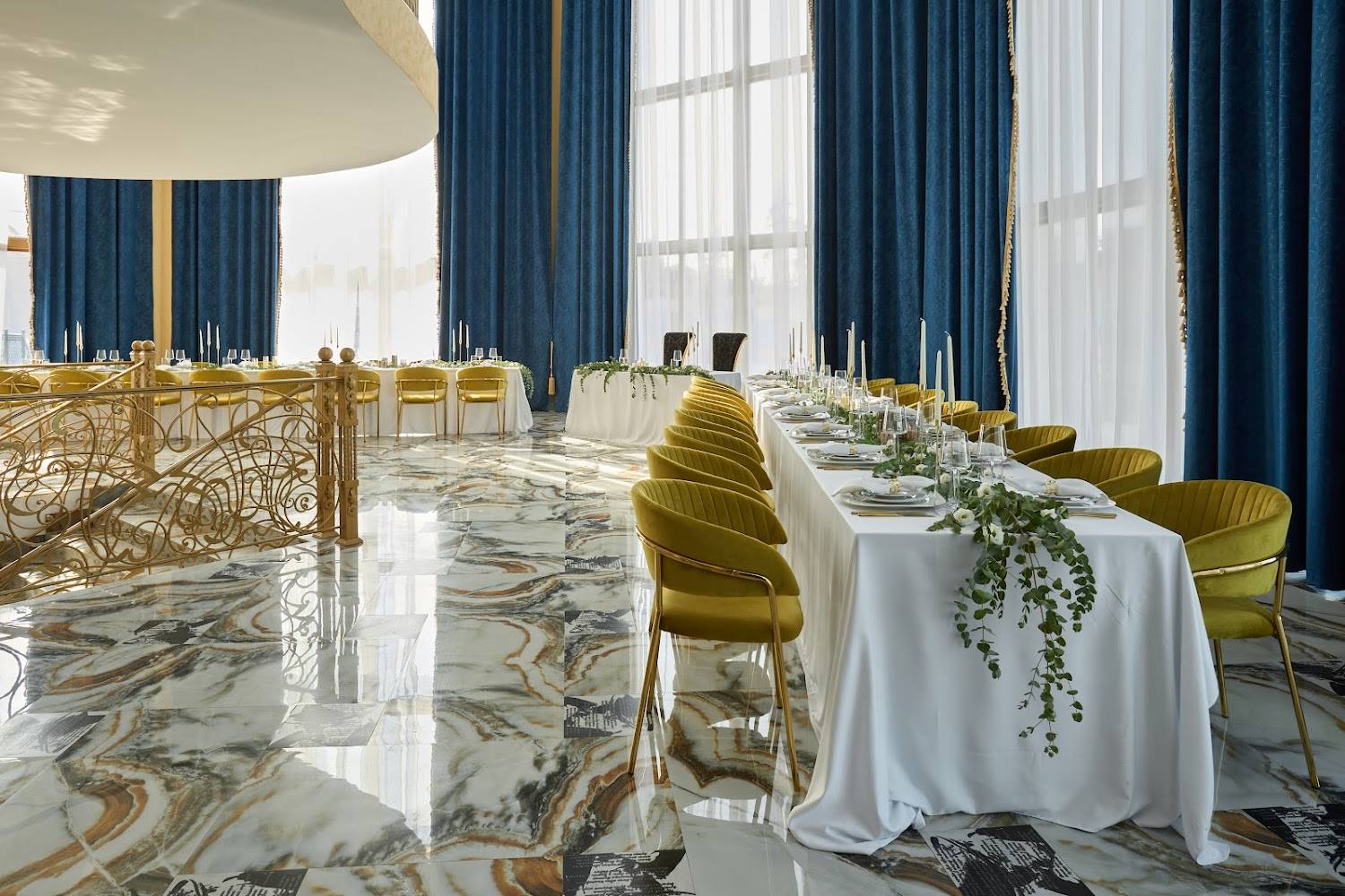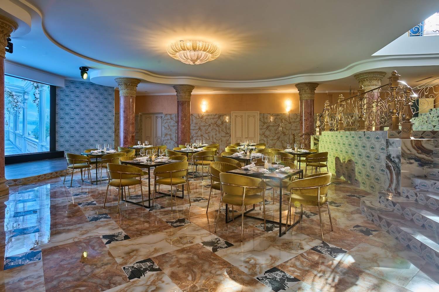 Атмосфера. Кирпичные стены, мраморные полы и горчичные бархатные стулья под белыми скатертями, позолоченные перила создают парадное настроение. Внутри несколько залов с видами на природу и роскошное украшение в виде рояля.