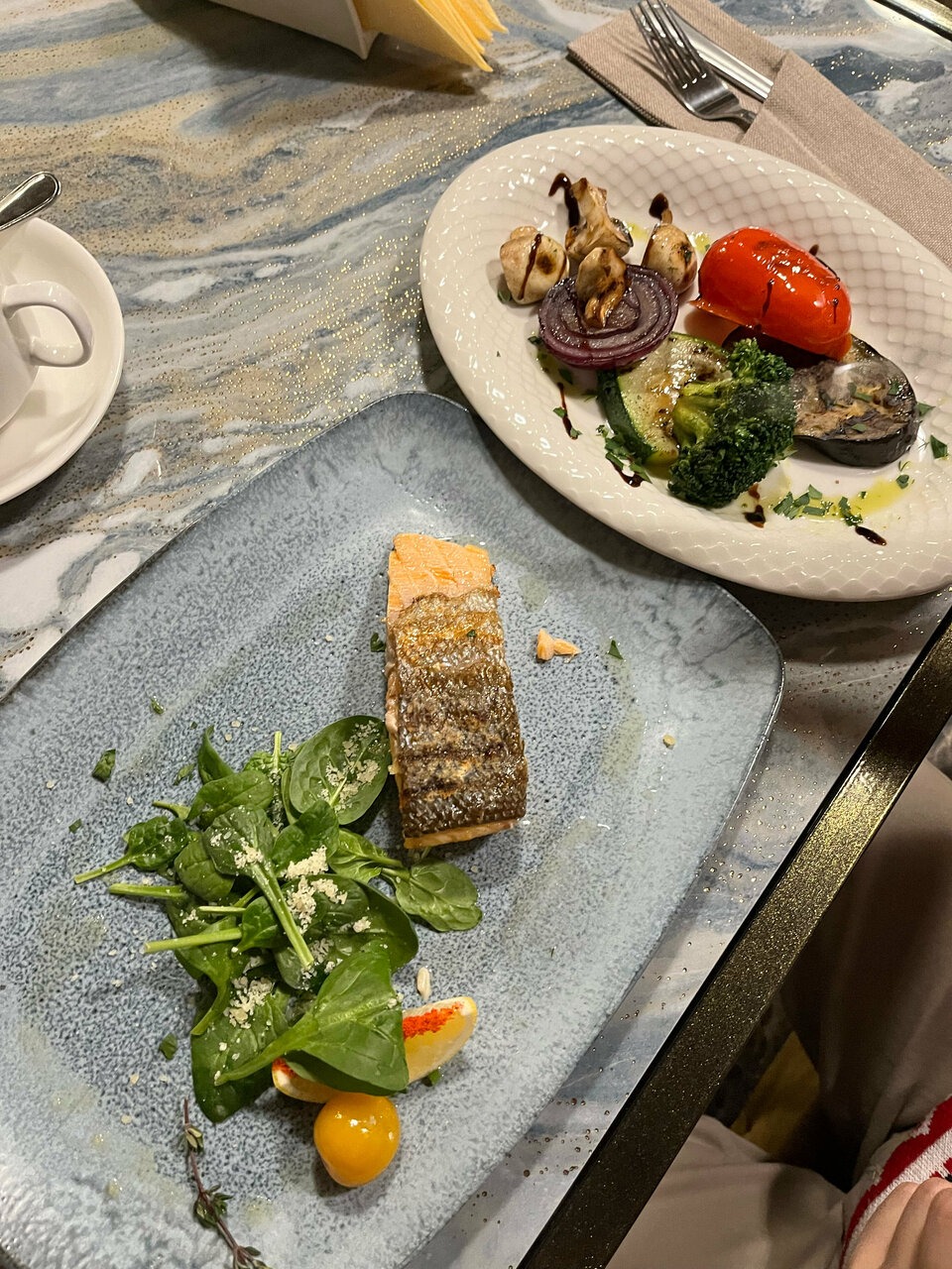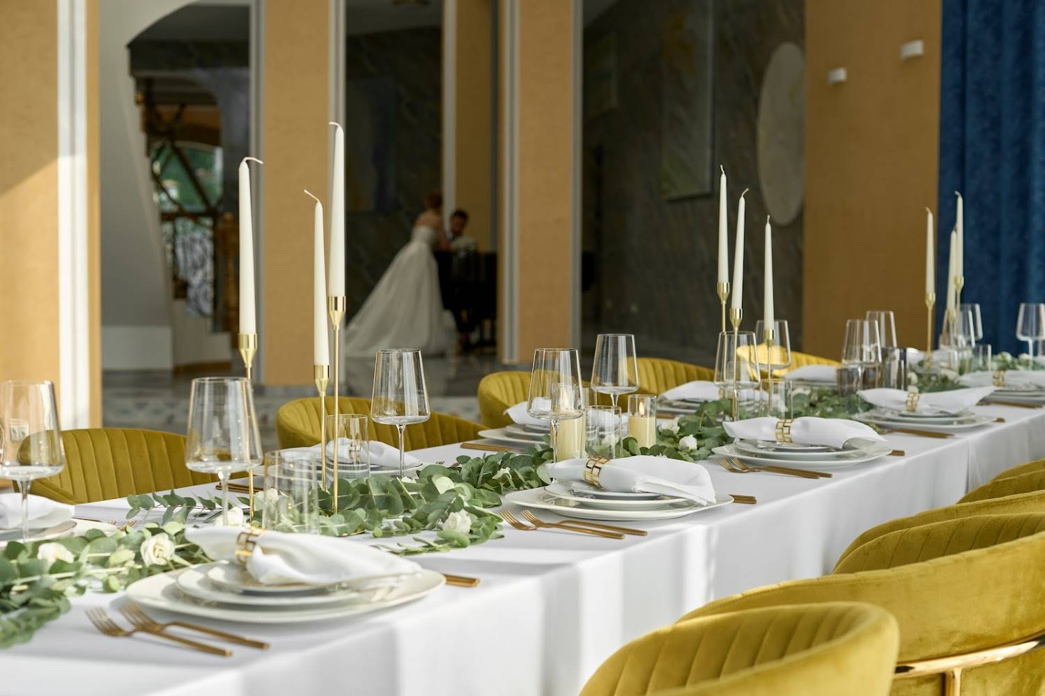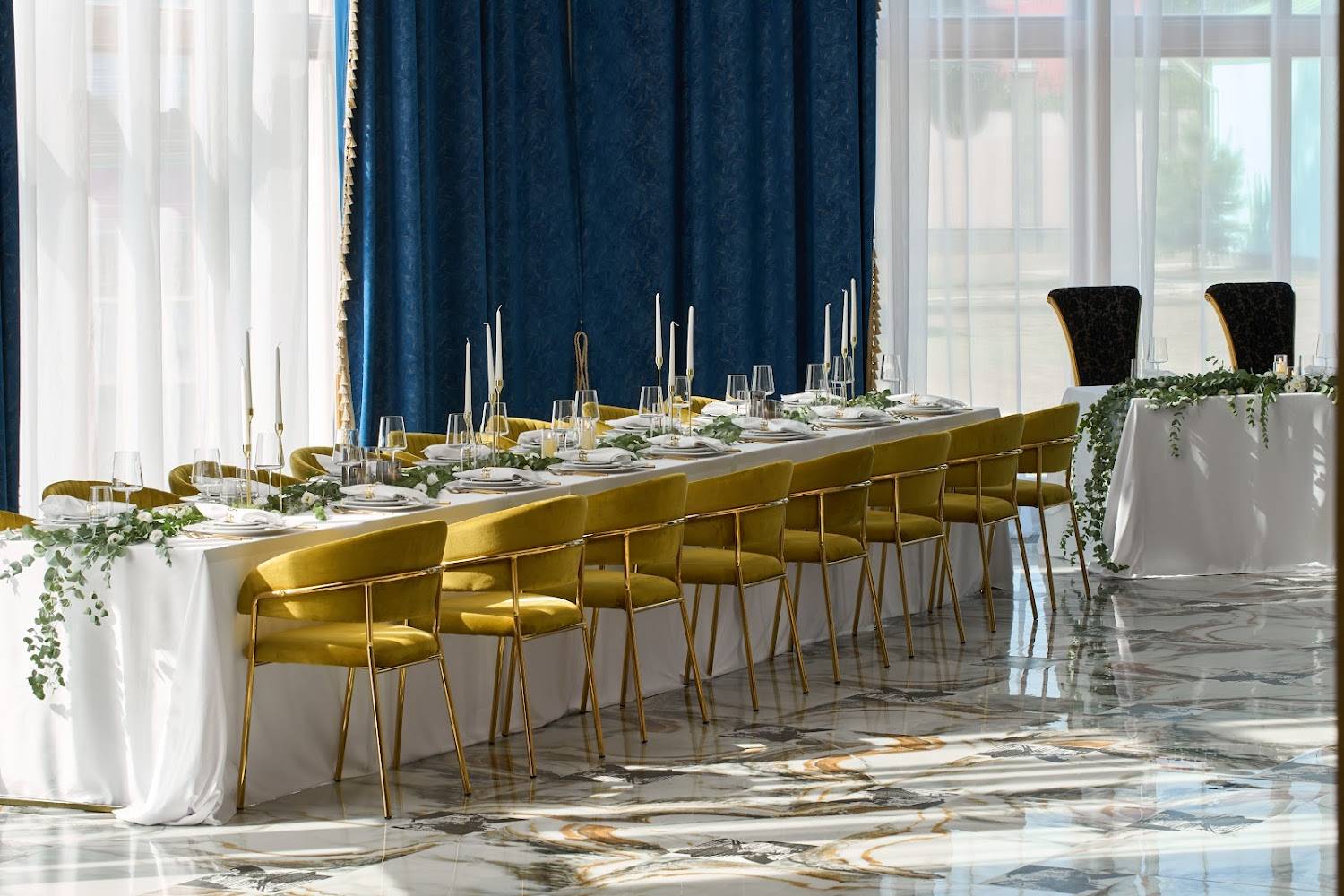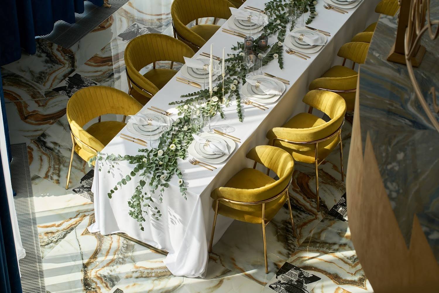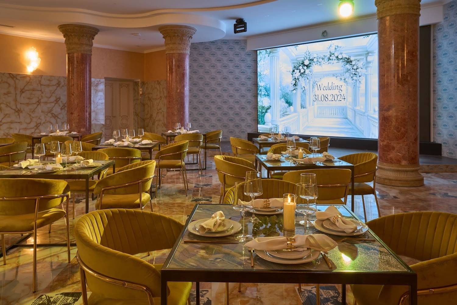 Атмосфера. Кирпичные стены, мраморные полы и горчичные бархатные стулья под белыми скатертями, позолоченные перила создают парадное настроение. Внутри несколько залов с видами на природу и роскошное украшение в виде рояля.
