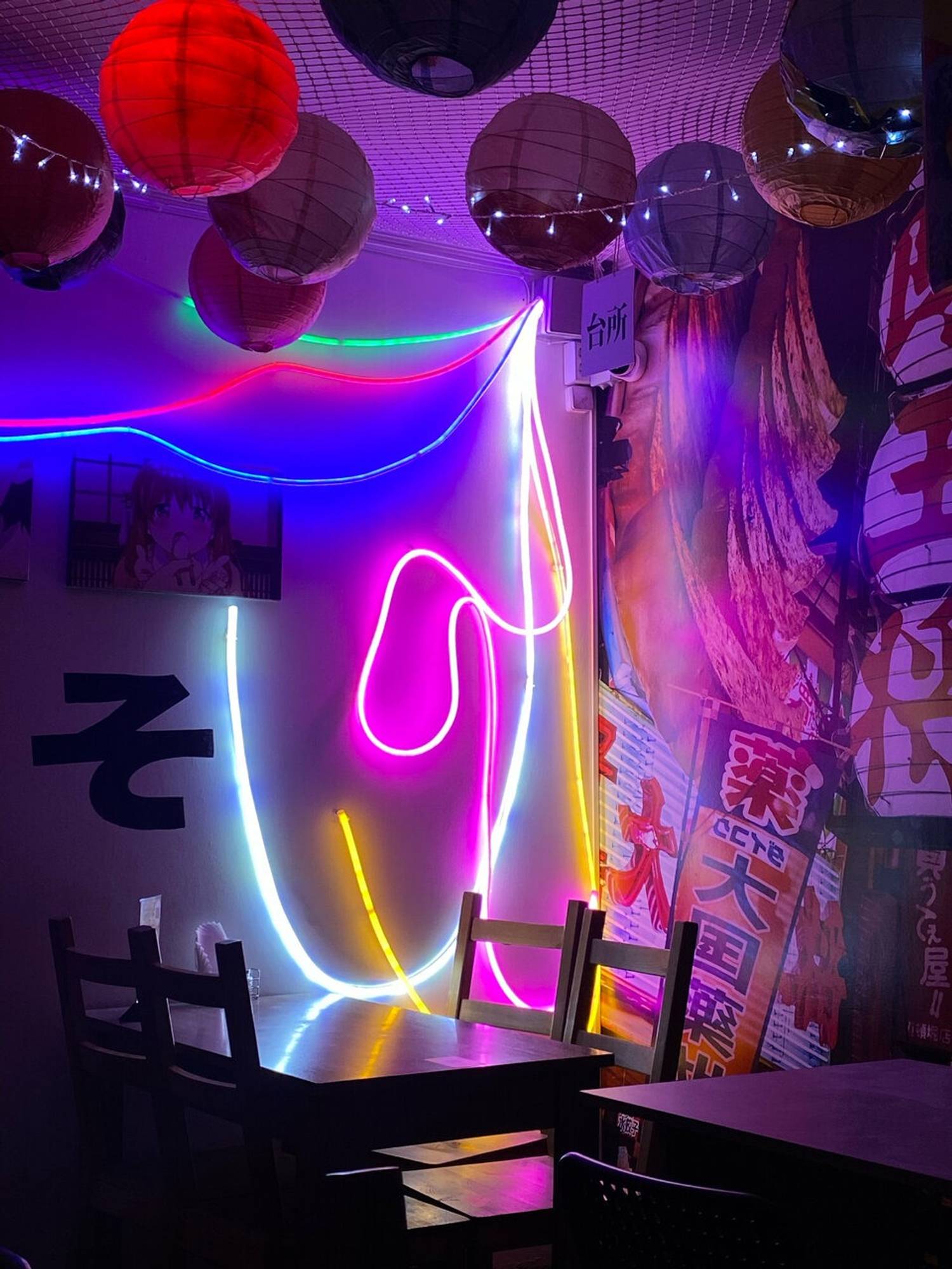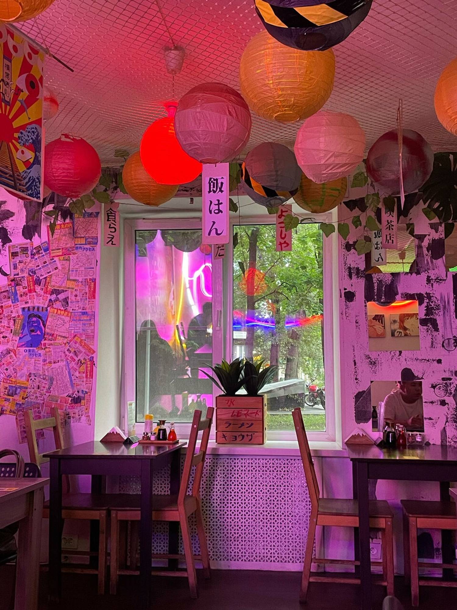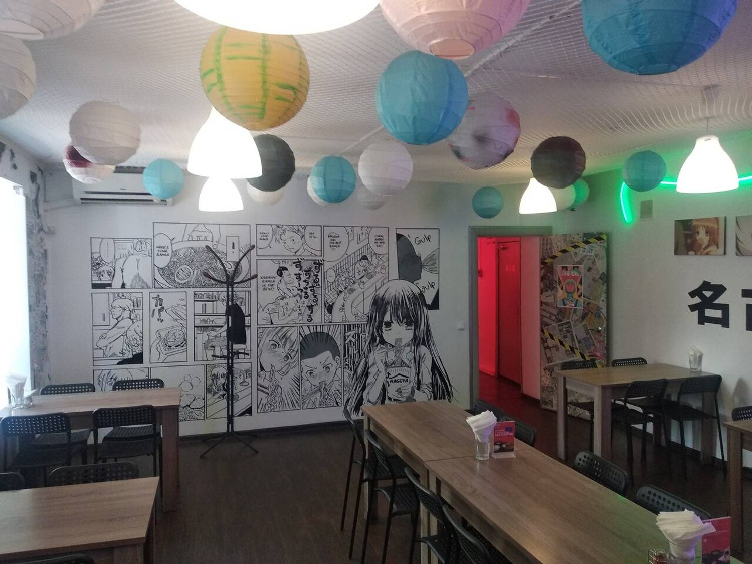 Атмосфера. Пространство погружает в атмосферу современной Японии: внутри лаконичная мебель, бумажные фонарики и арт-объекты по мотивам аниме. Также интерьер дополняет подсветка на стенах и плакаты с иероглифами.