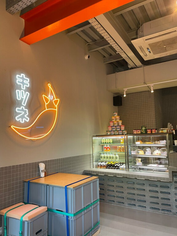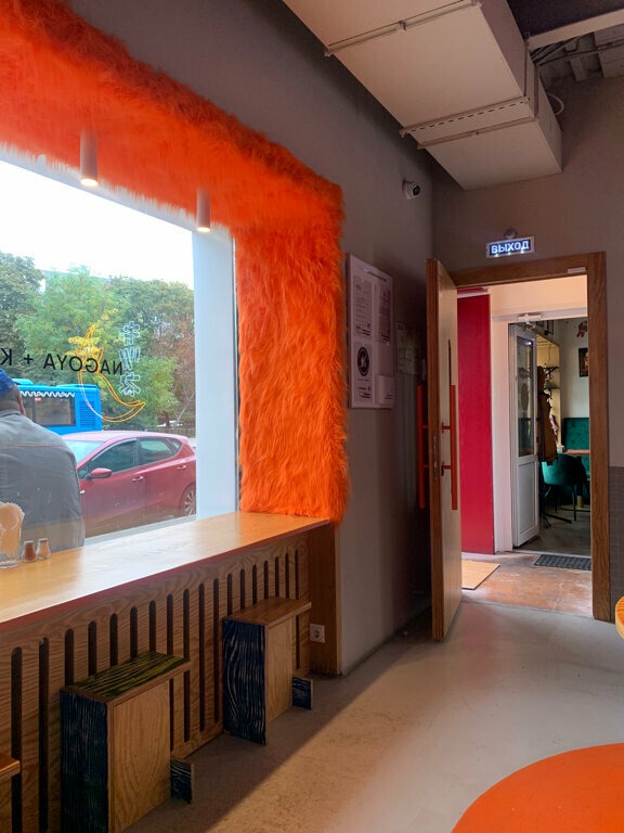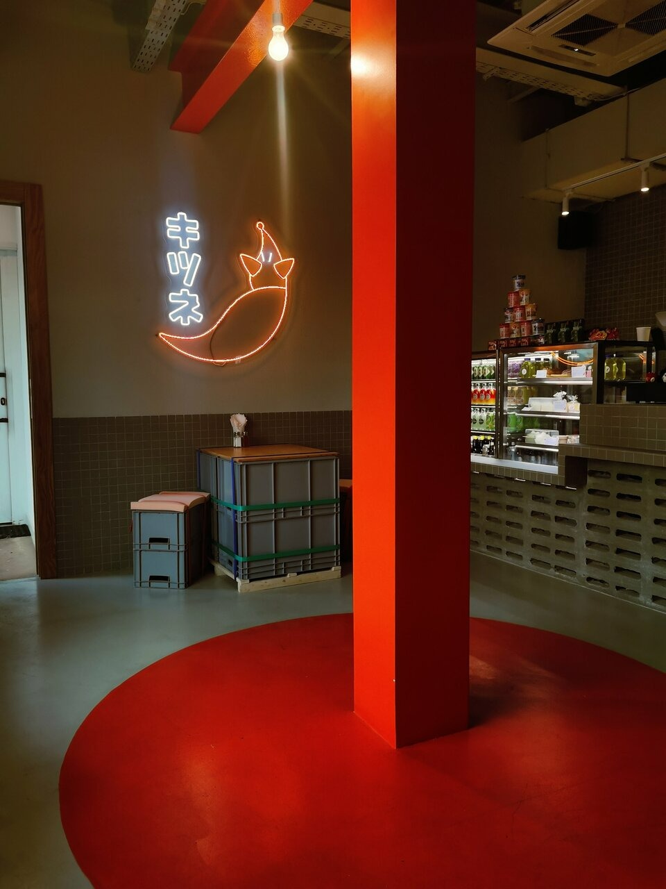 Атмосфера. Интерьер в стиле современной Японии: неоновые иероглифы на стенах, пушистая красная обивка подоконников. В центре красный столб с круглым столом и деревянными стульями. На стеклянных витринах с подсветкой можно выбрать напитки.