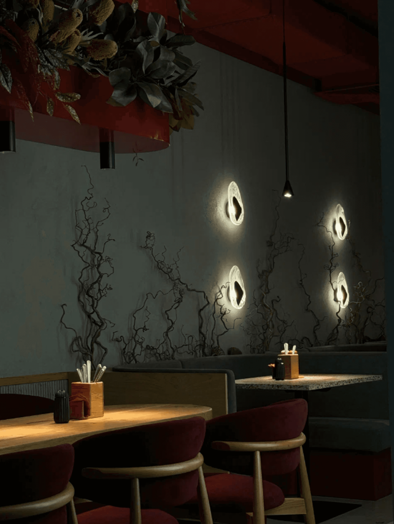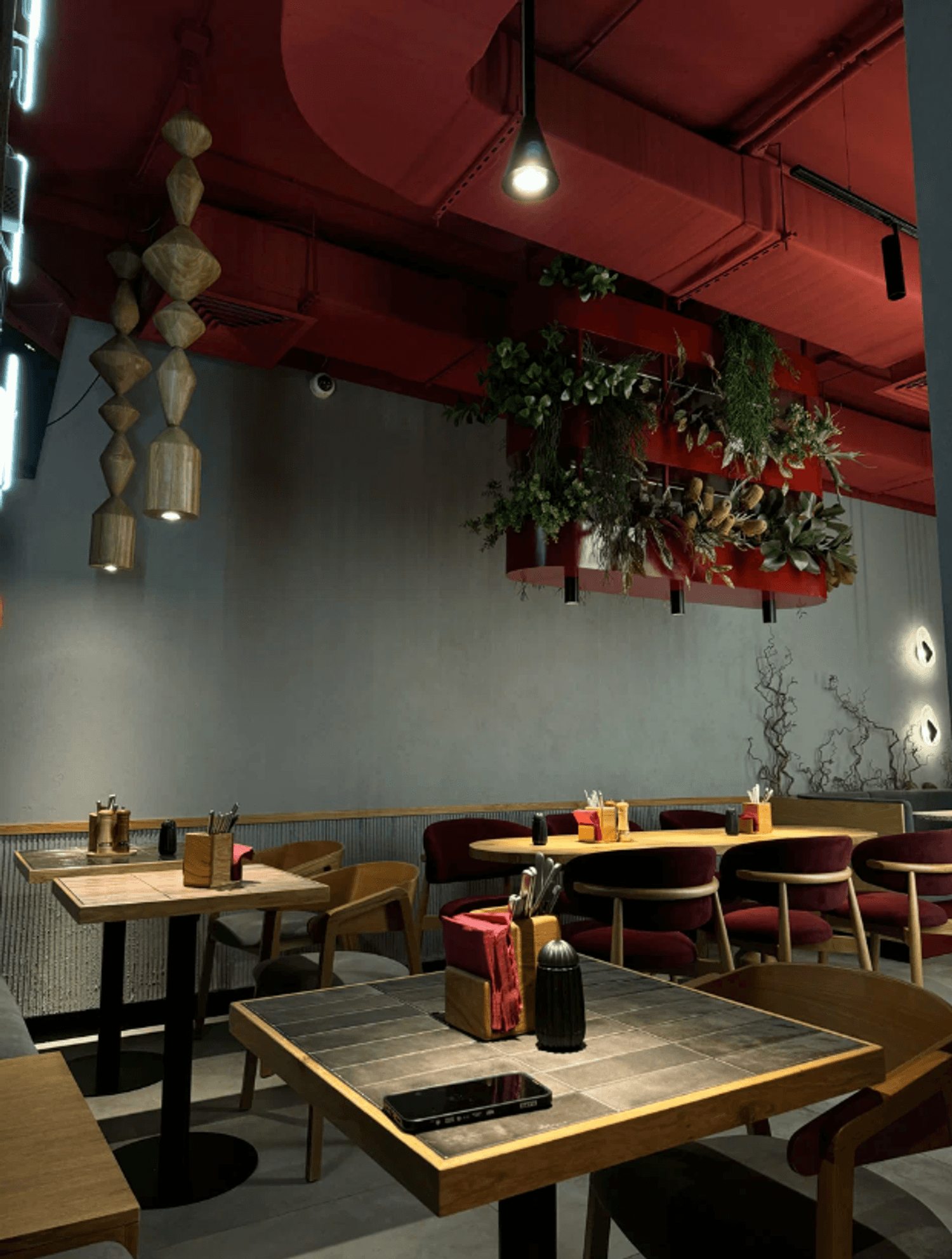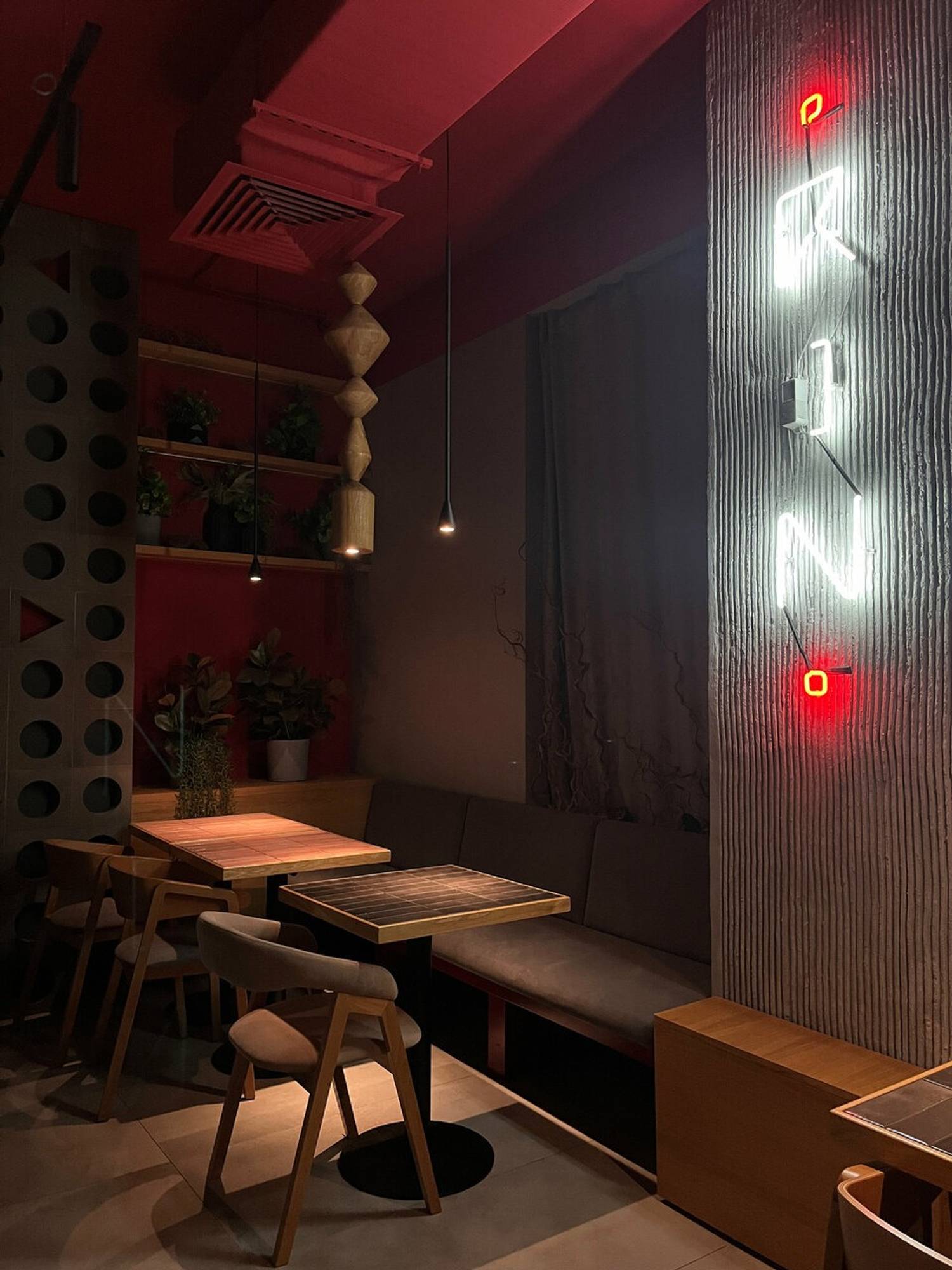 Атмосфера. Фактурные серые стены с золотыми орнаментами-завитками, бордовые коммуникации под потолком и линейная подсветка создают многослойное визуальное восприятие. Здесь можно разместиться большим компаниям на просторных мягких диванах.