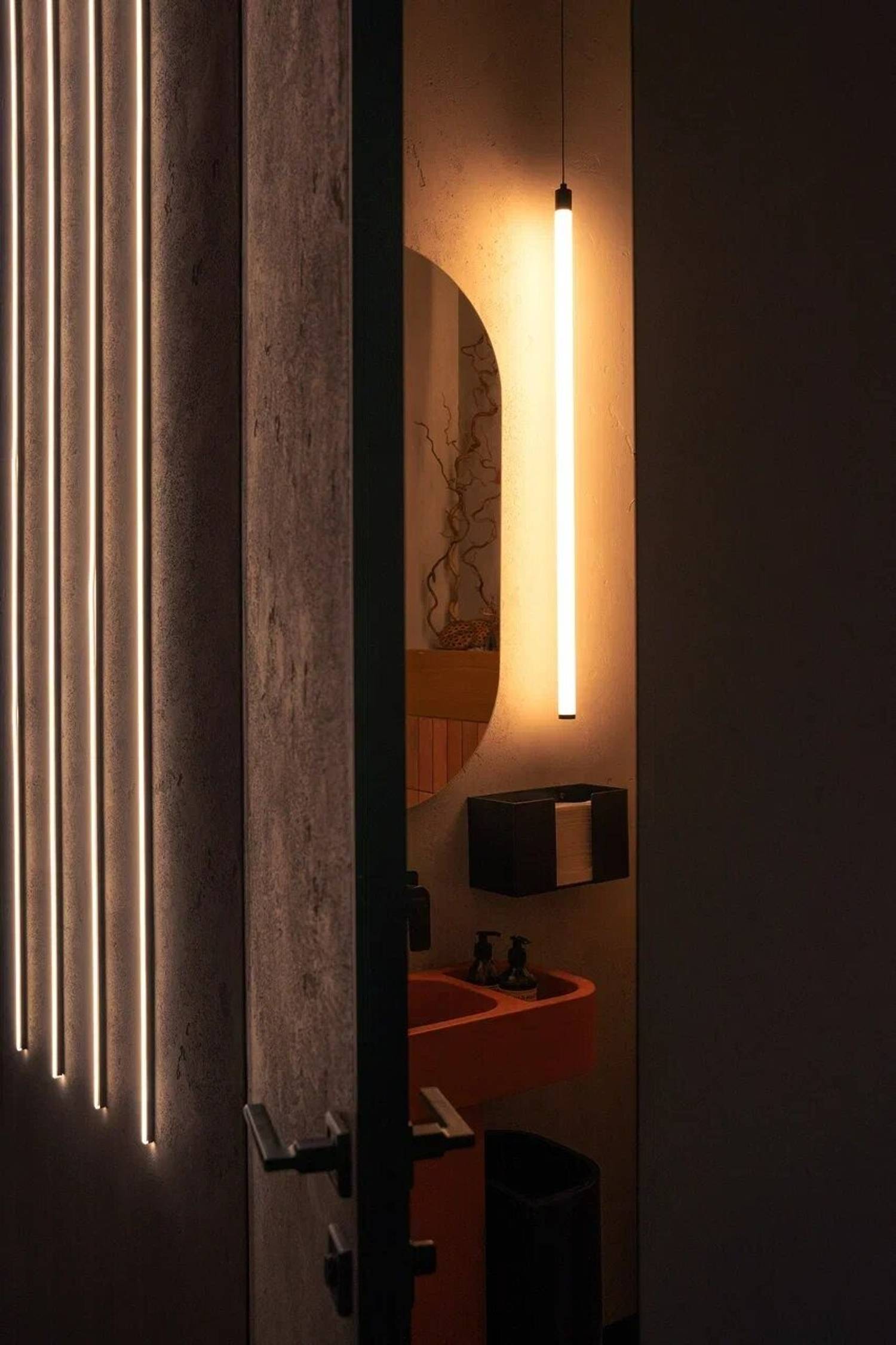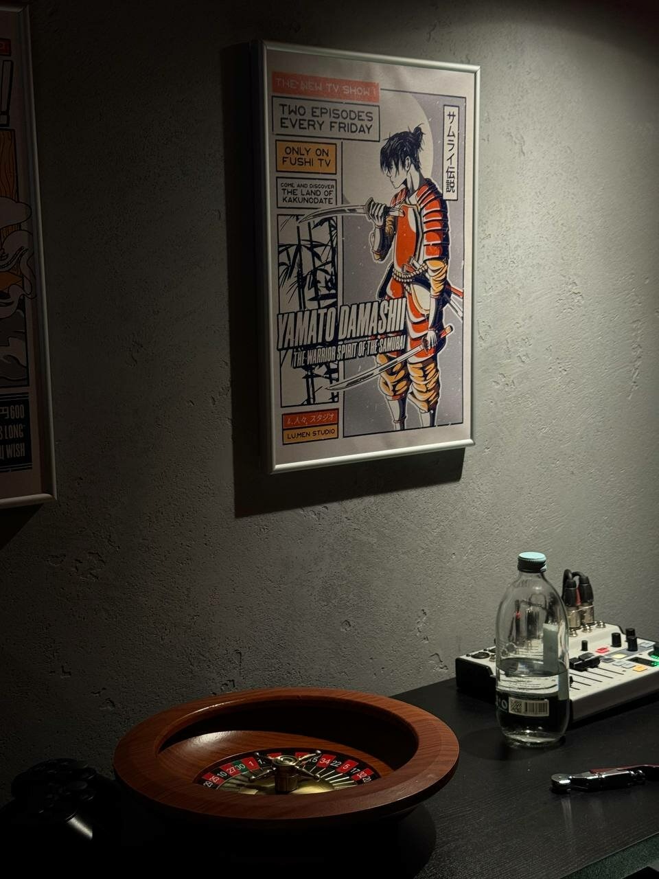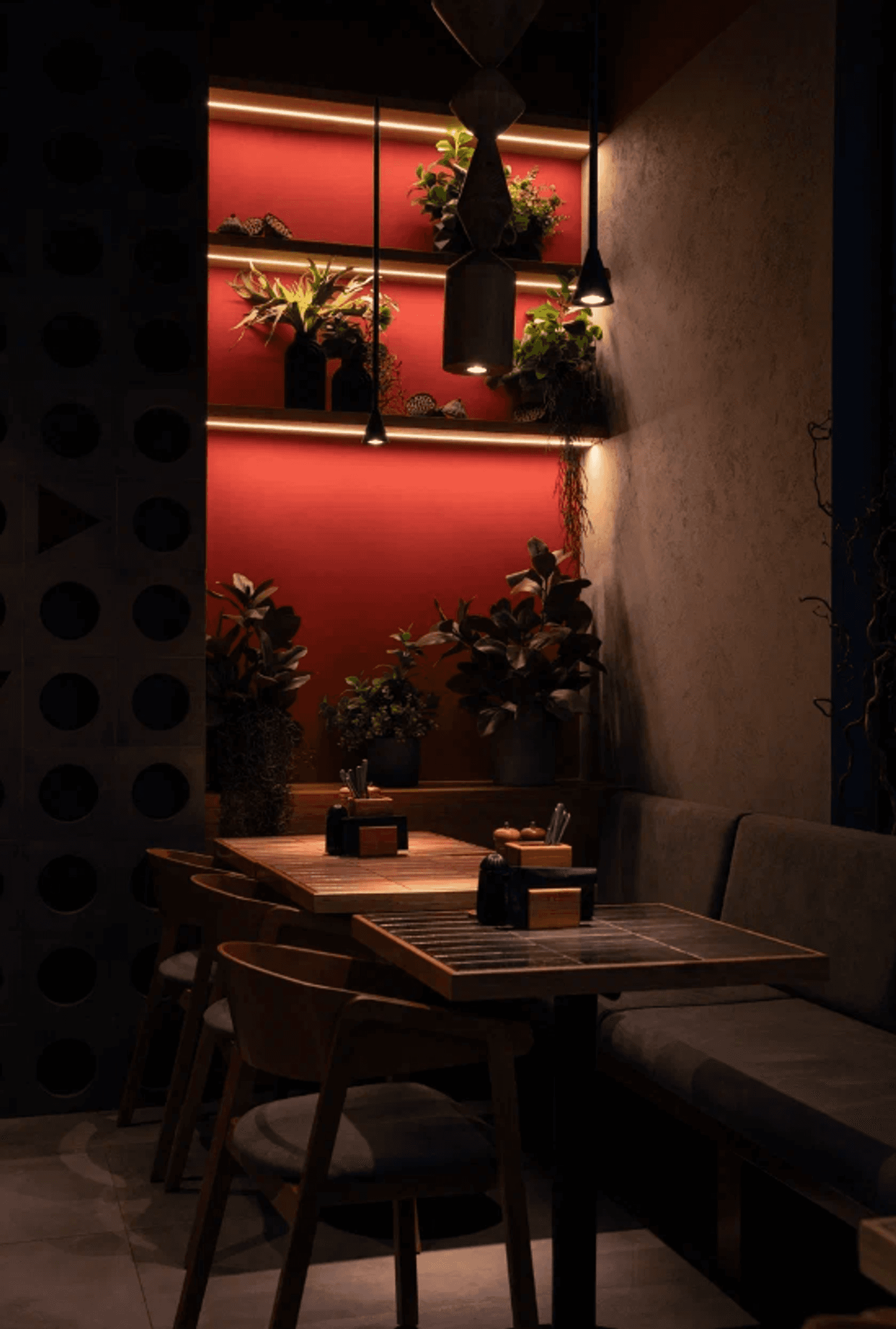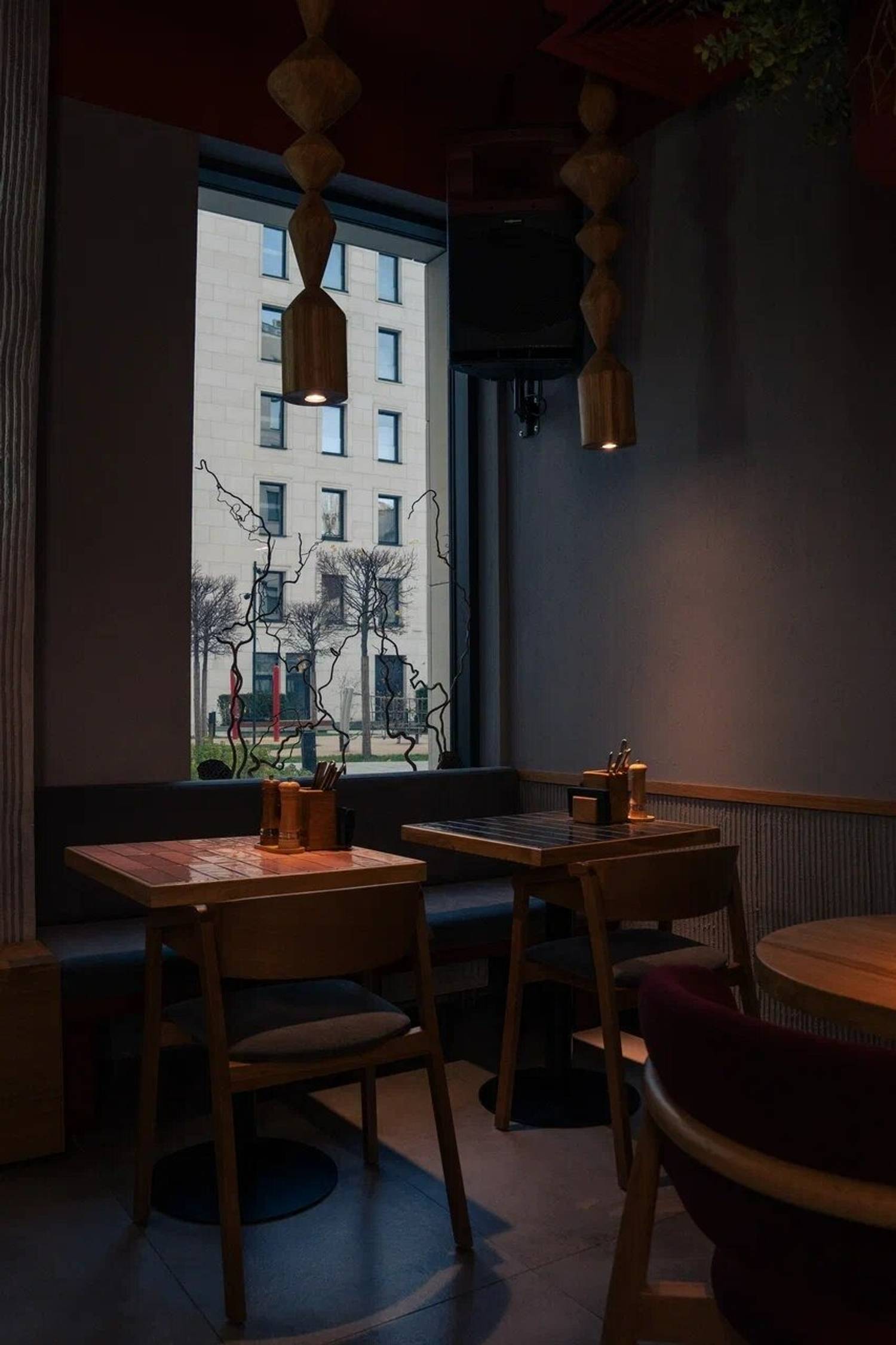 Атмосфера. Фактурные серые стены с золотыми орнаментами-завитками, бордовые коммуникации под потолком и линейная подсветка создают многослойное визуальное восприятие. Здесь можно разместиться большим компаниям на просторных мягких диванах.