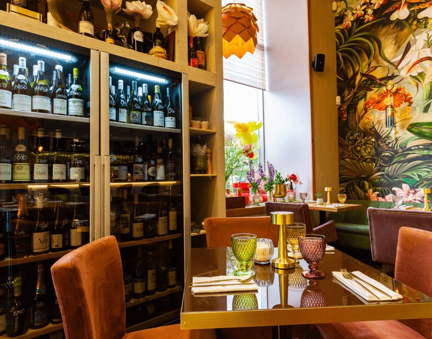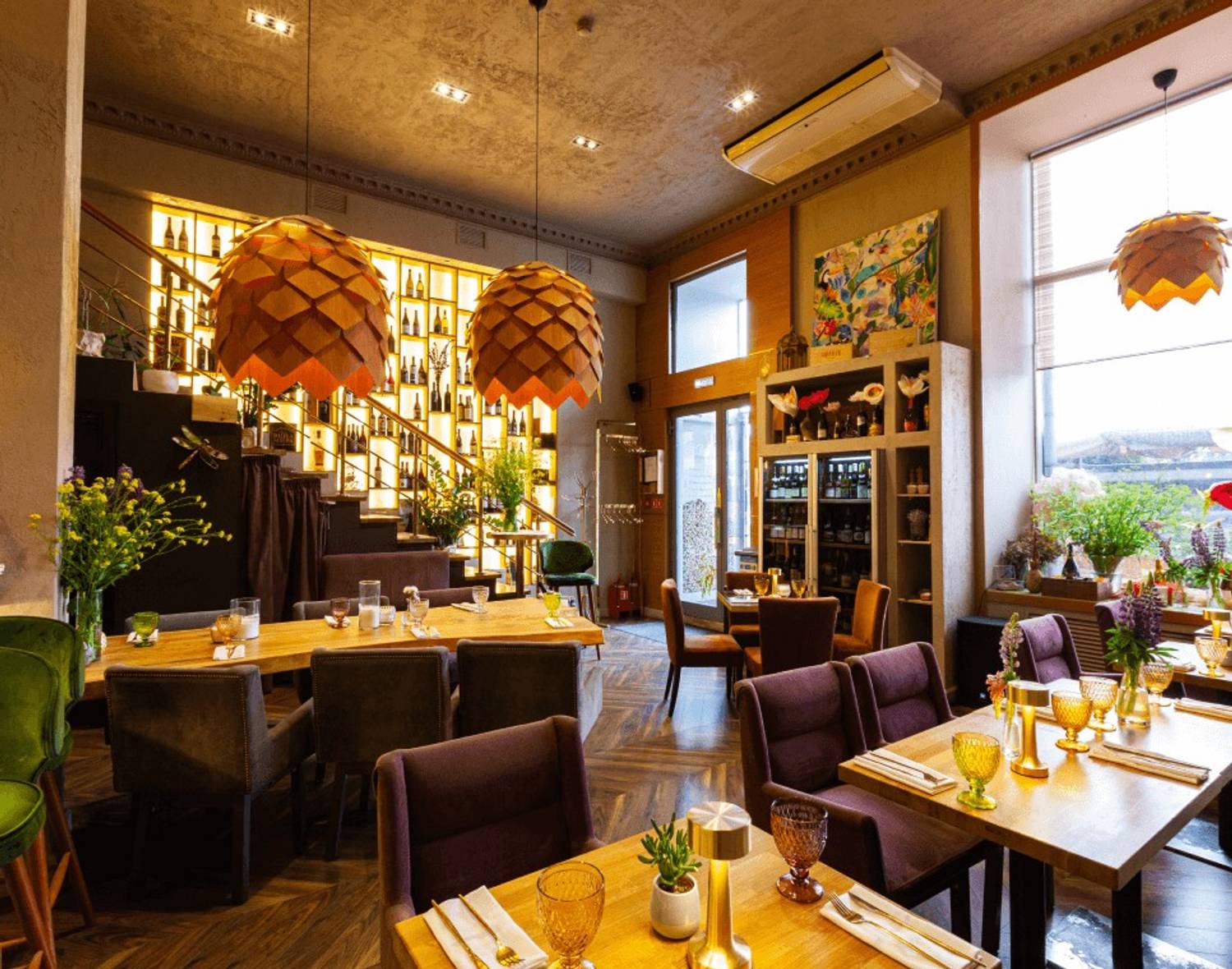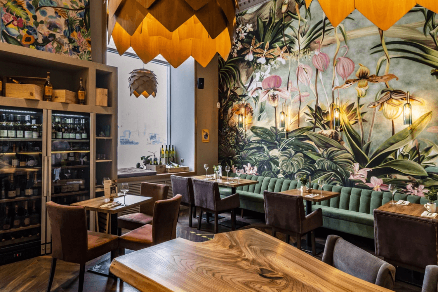 Атмосфера. Дизайн создает атмосферу курортного настроения: стены с яркими тропическими фресками и цветочными росписями сочетаются и оригинальные люстры, похожие на разрезанные ананасы. Детали вроде витрины с подсвеченными бутылками вина и свежих цветов в вазах на подоконниках создают лёгкую и живую атмосферу.