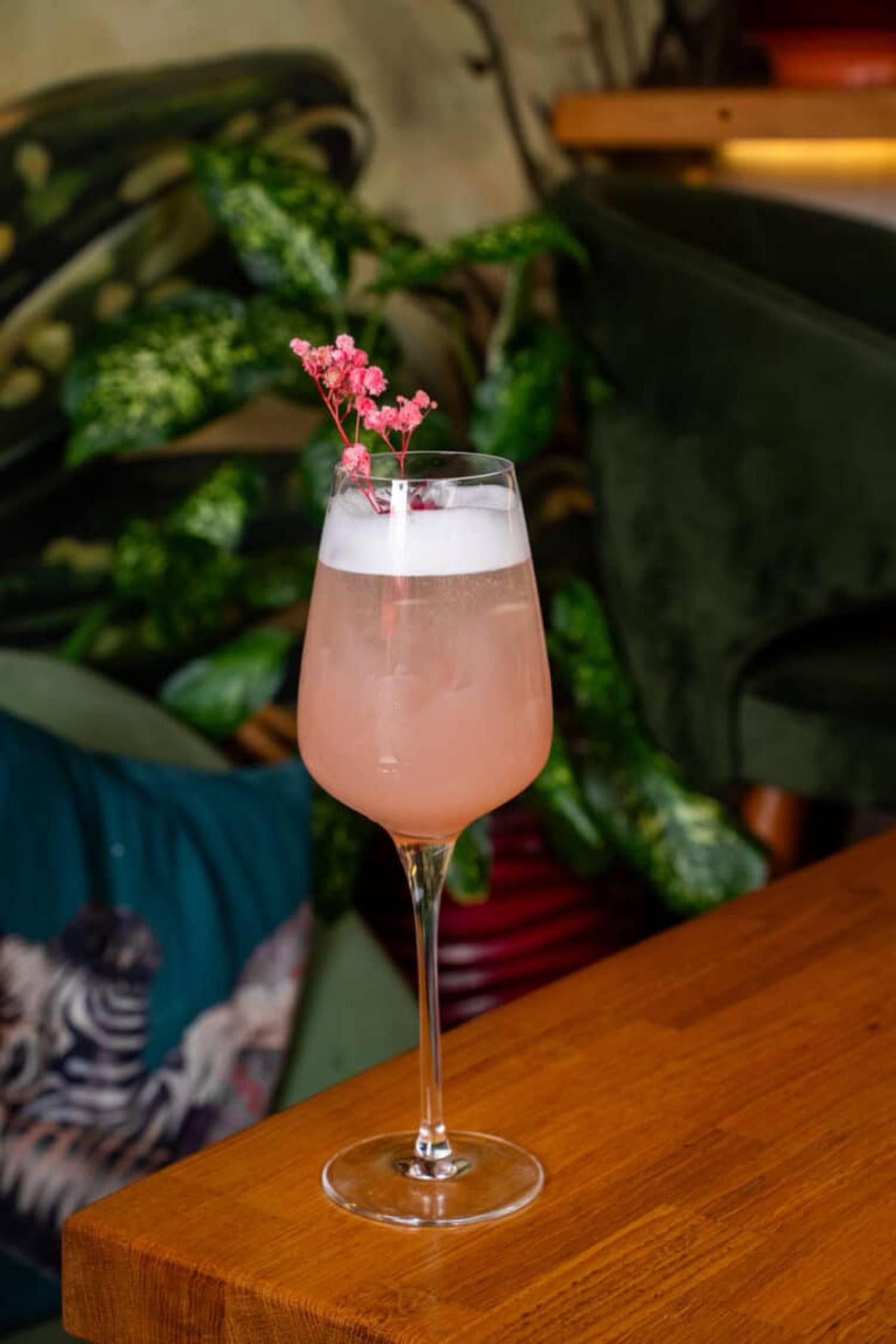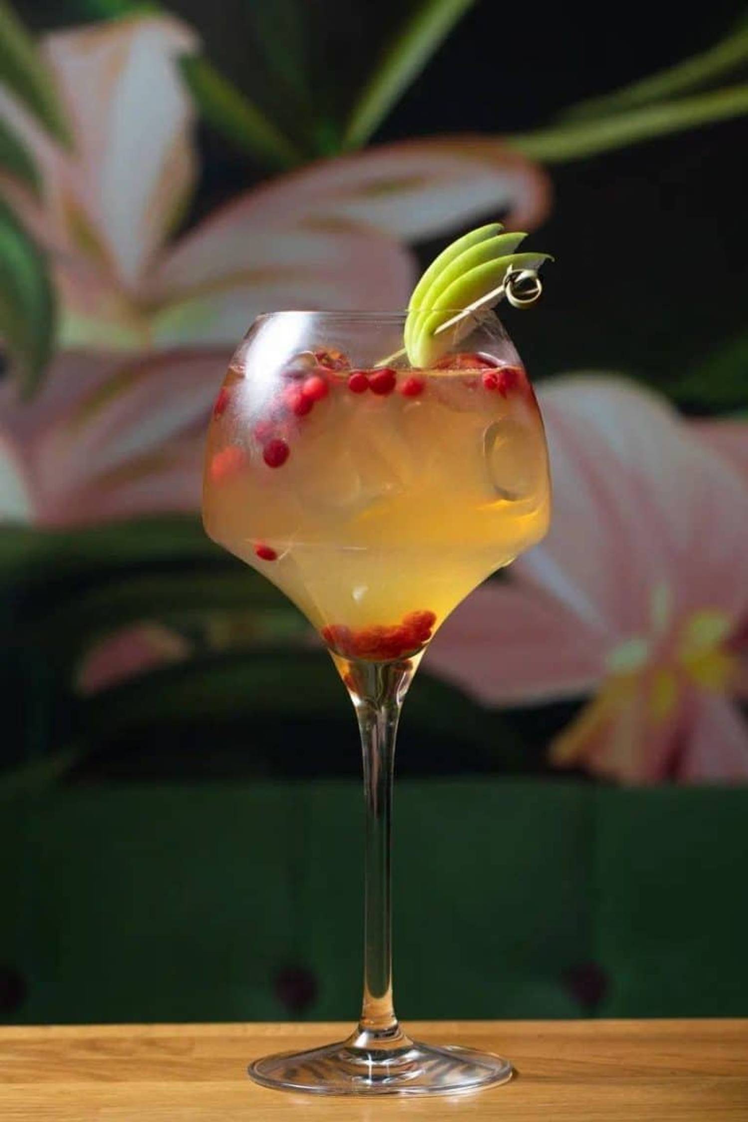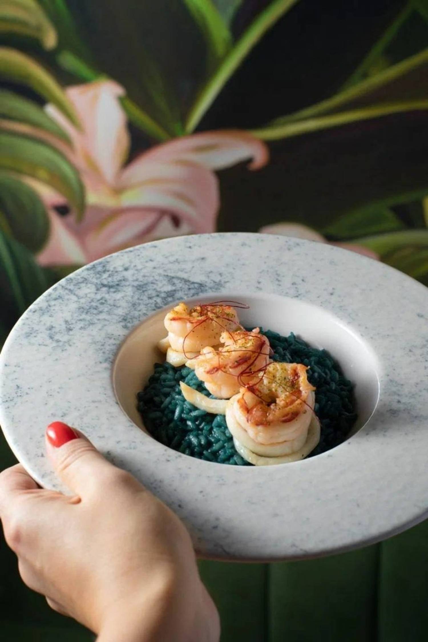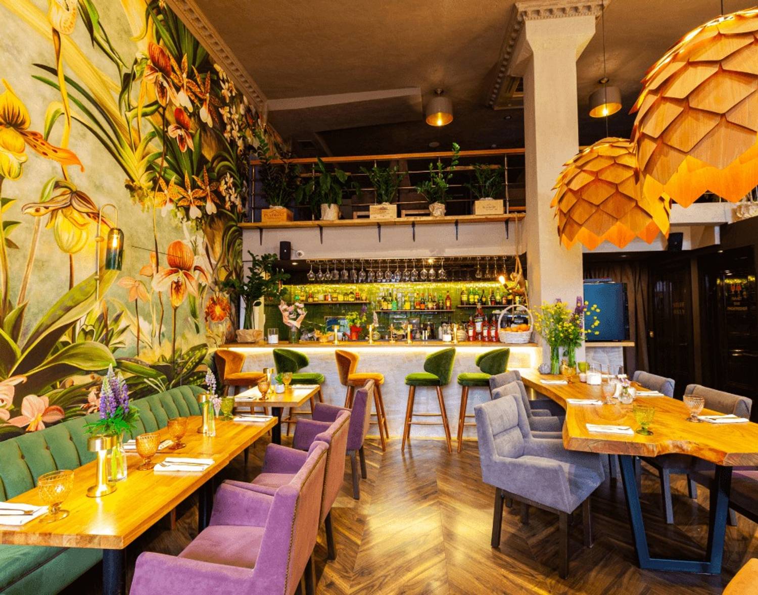 Атмосфера. Дизайн создает атмосферу курортного настроения: стены с яркими тропическими фресками и цветочными росписями сочетаются и оригинальные люстры, похожие на разрезанные ананасы. Детали вроде витрины с подсвеченными бутылками вина и свежих цветов в вазах на подоконниках создают лёгкую и живую атмосферу.