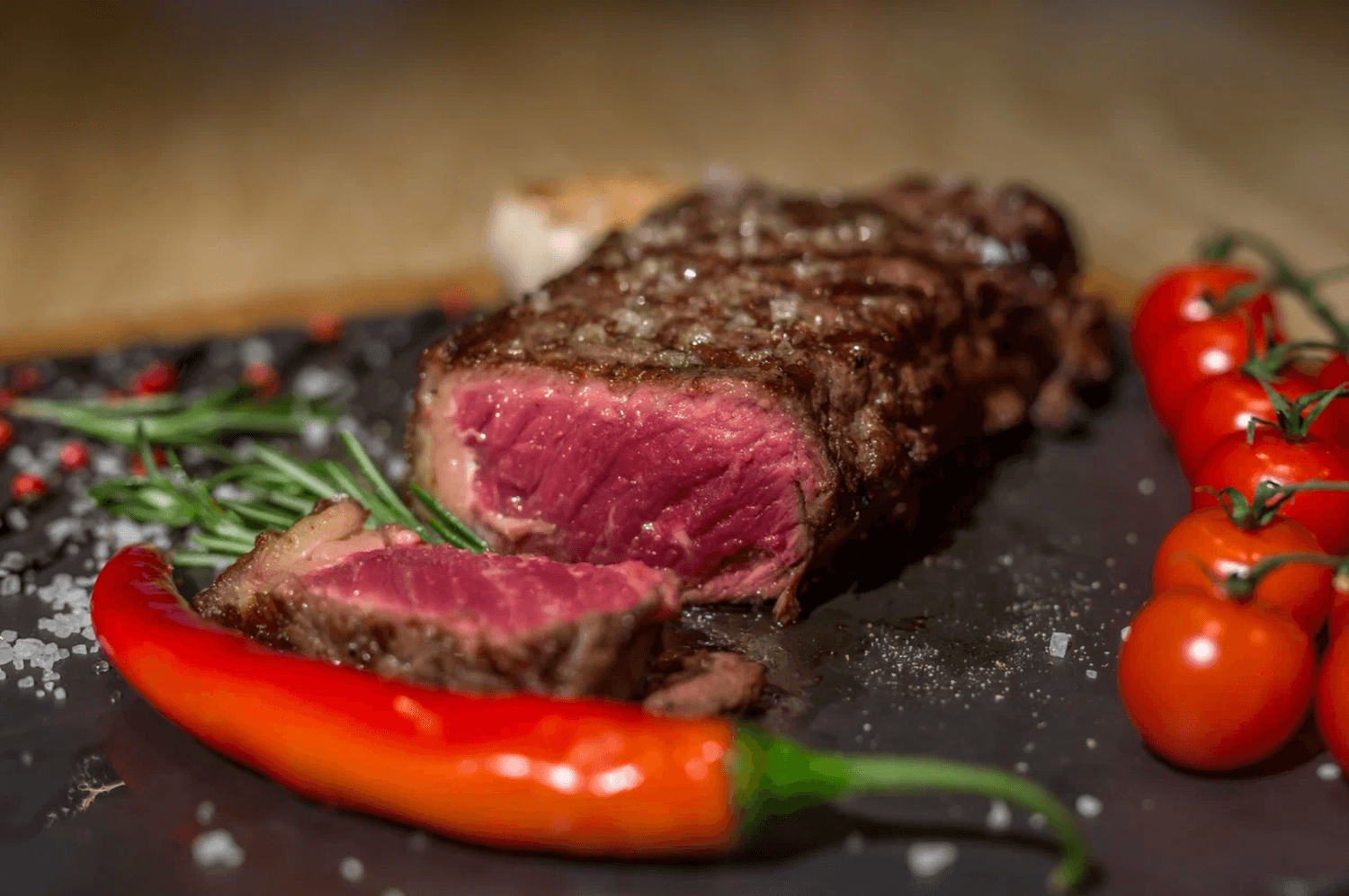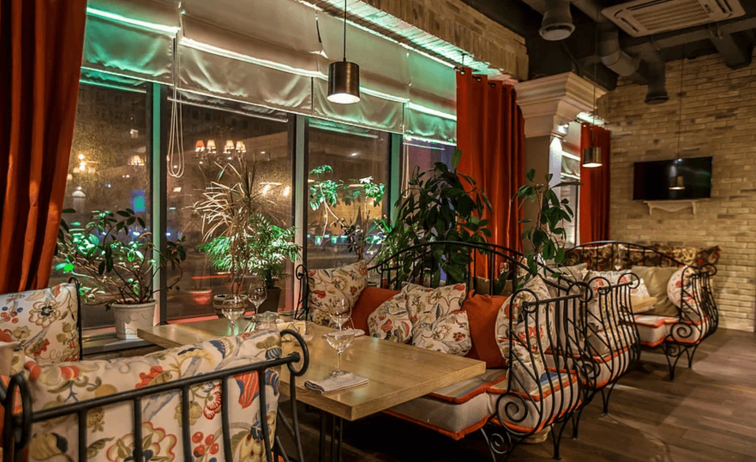 Атмосфера. На первом этаже гостей ждет кафе в итальянском стиле, на втором — мясная зона, а на третьем — терраса с видом на город. Залы с шоколадно-коричневыми стенами, винтажные диваны с яркими подушками и фигурой быка у входа.