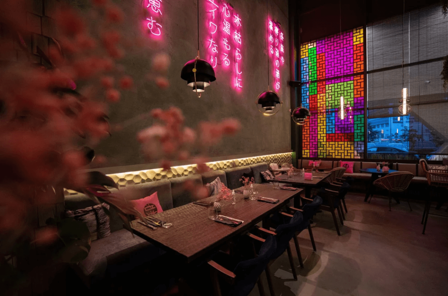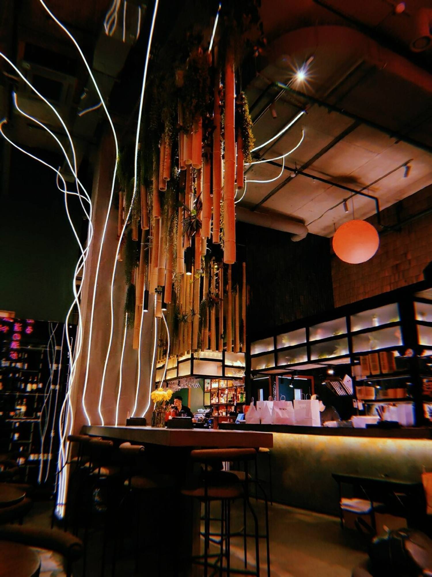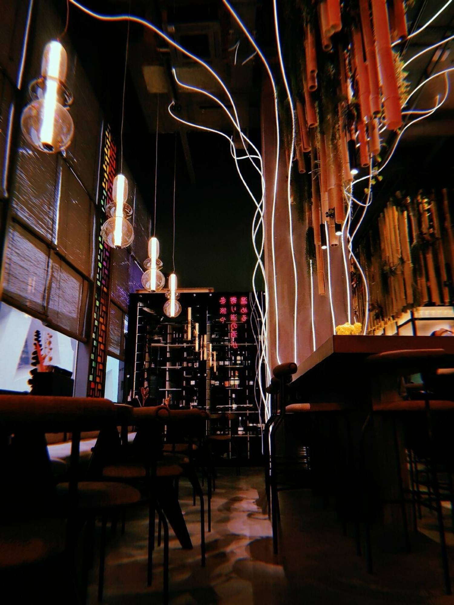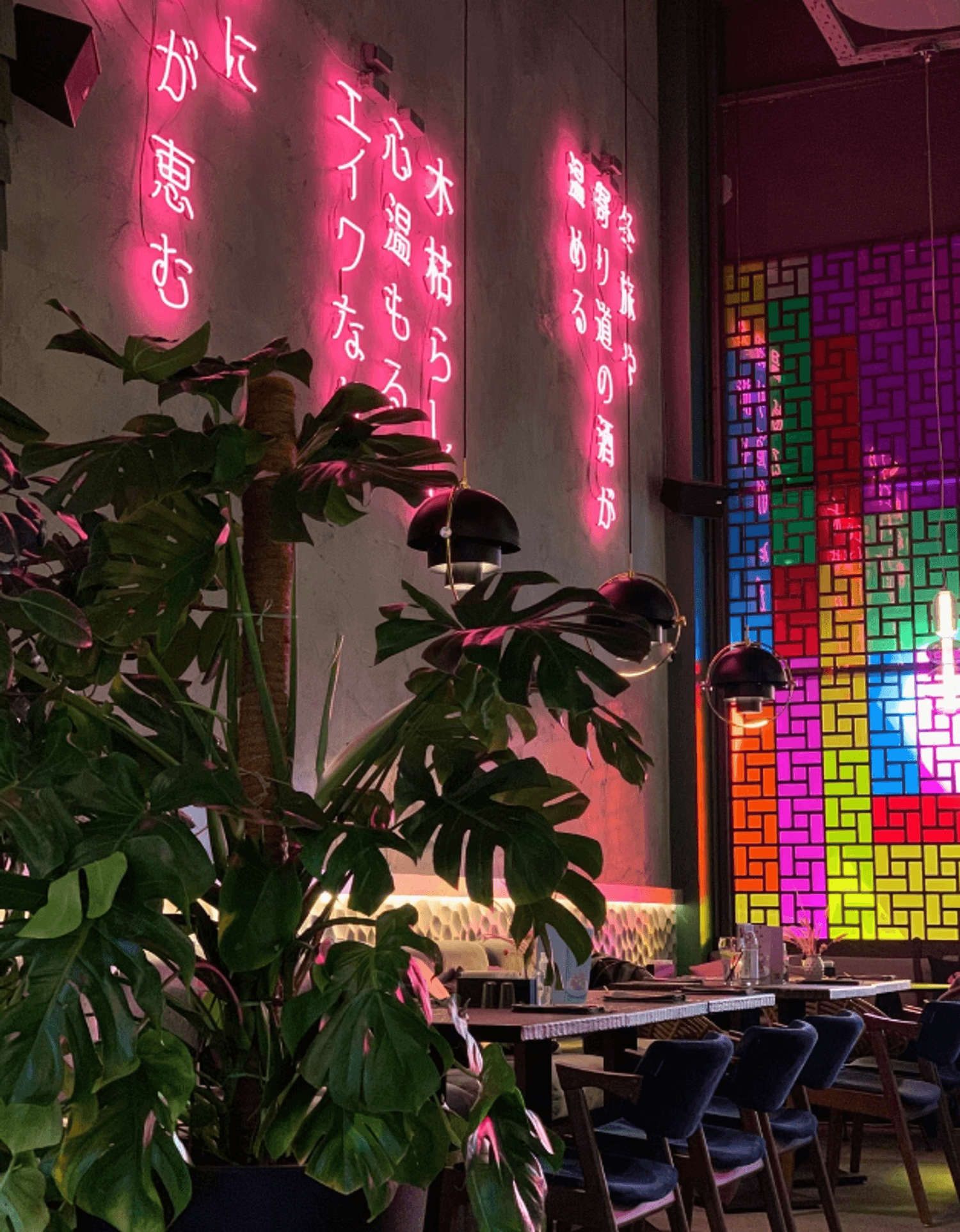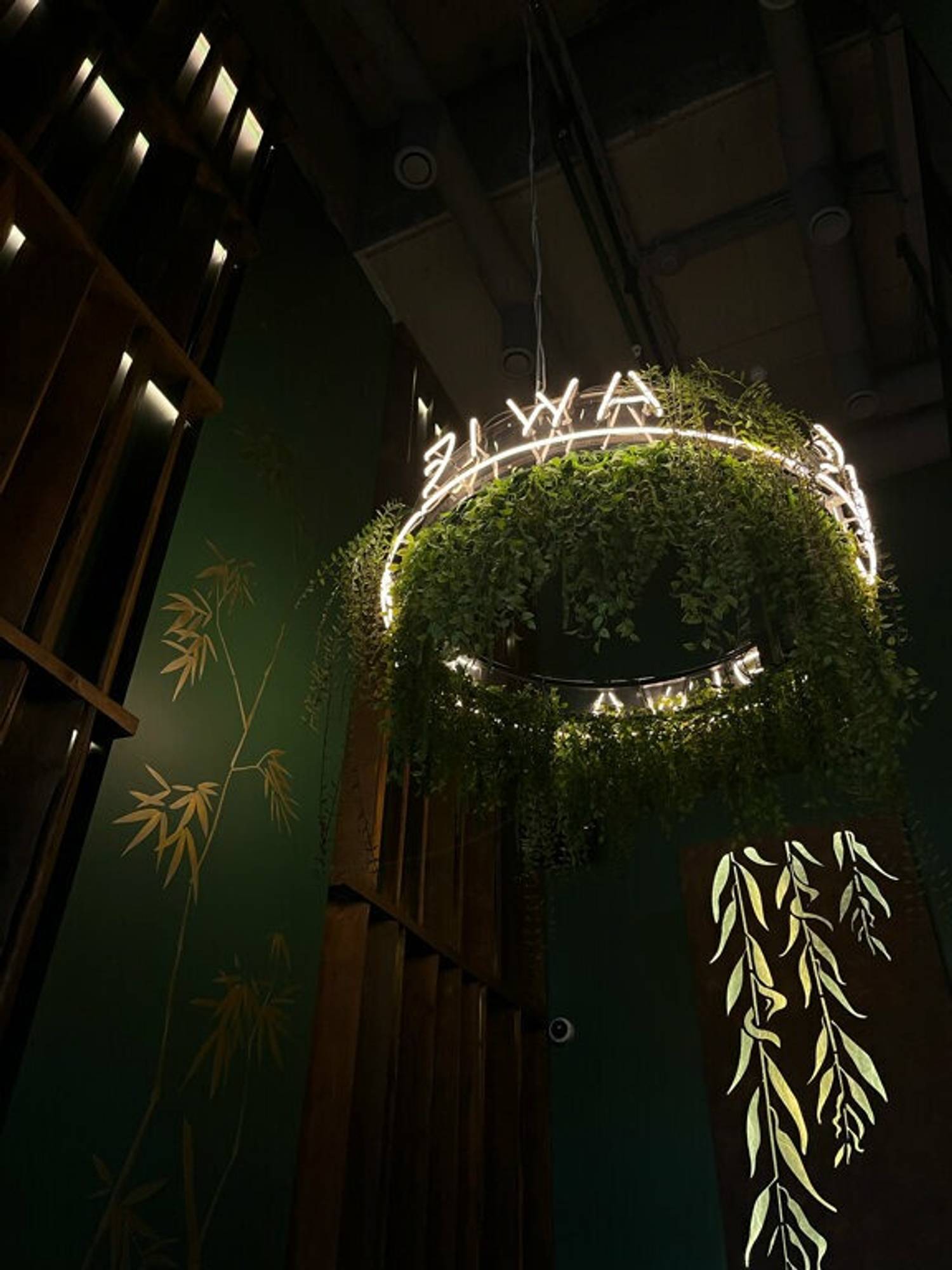 Атмосфера. Минималистичный интерьер с тропическими растениями и неоновыми композициями в виде японских иероглифов, которые складываются в хайку.