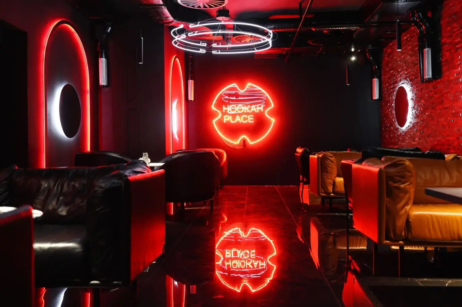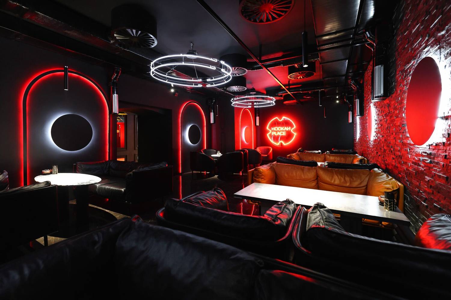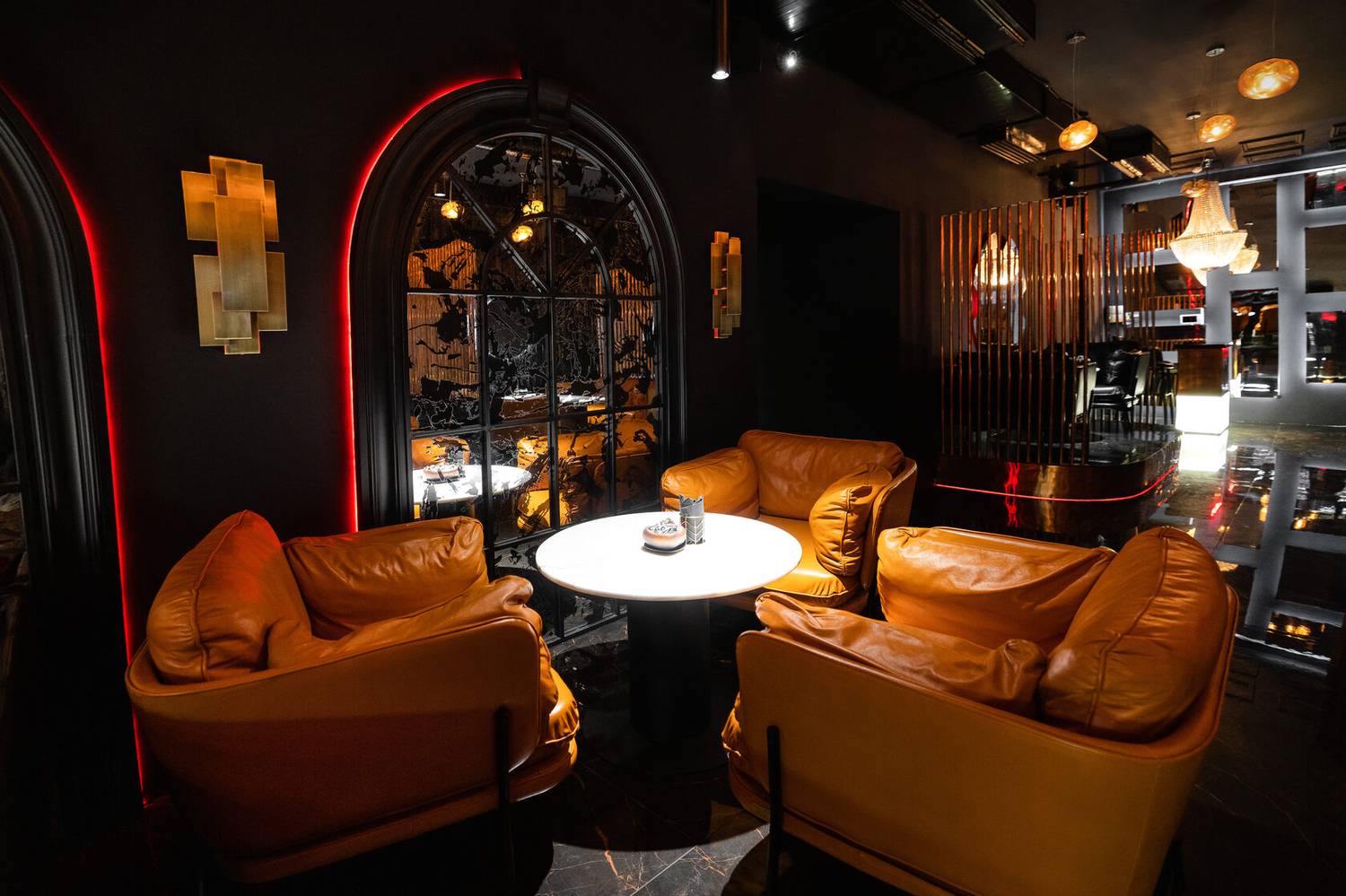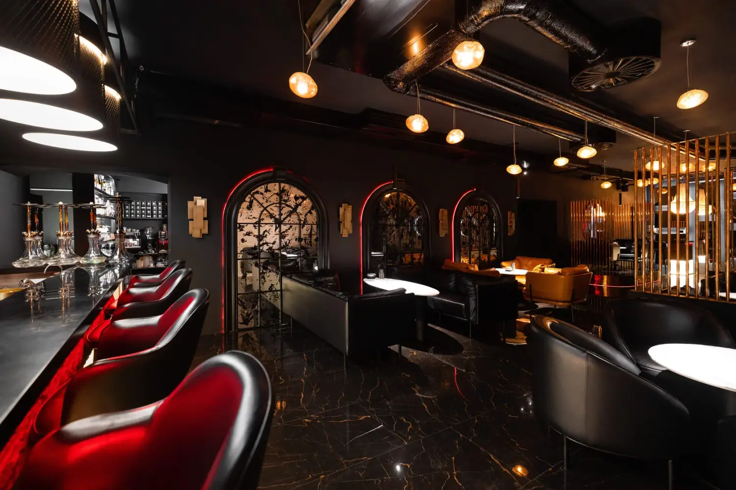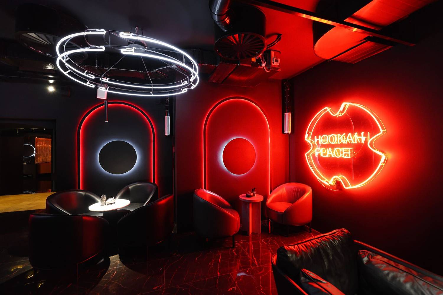 Атмосфера. Интерьер в драматичной черно-красной гамме с акцентами металлических поверхностей. Брутальный характер придают кожаные диваны, декоративные черные круги с контурной подсветкой на стенах и приглушенное красное освещение. Пространство разделено на три зала, где алые арки и барная зона с золотистыми светильниками.