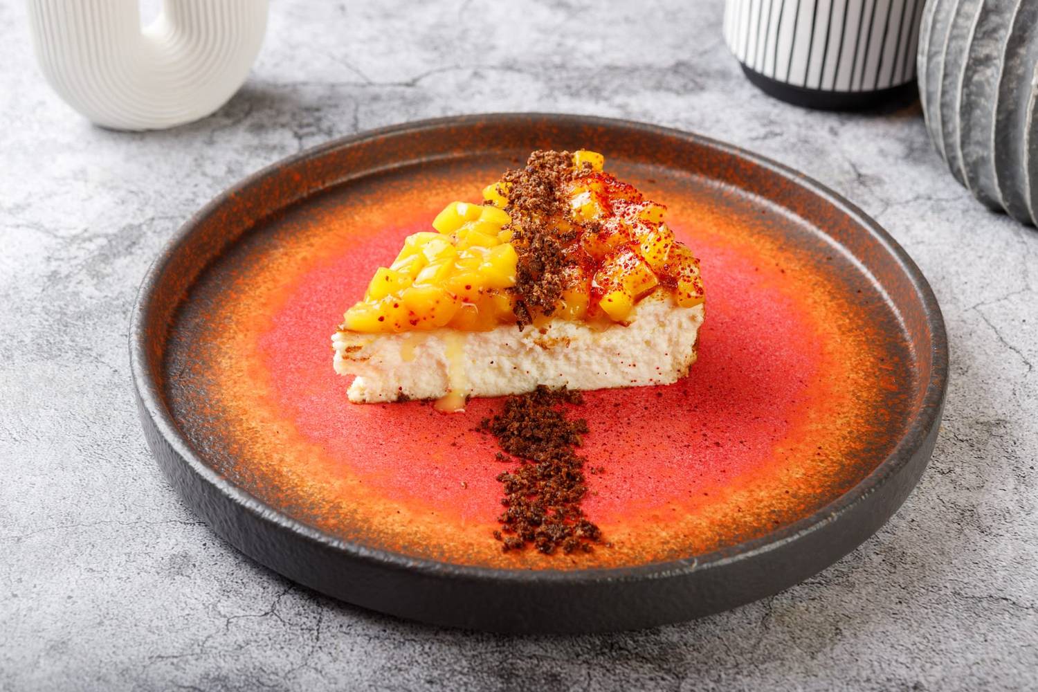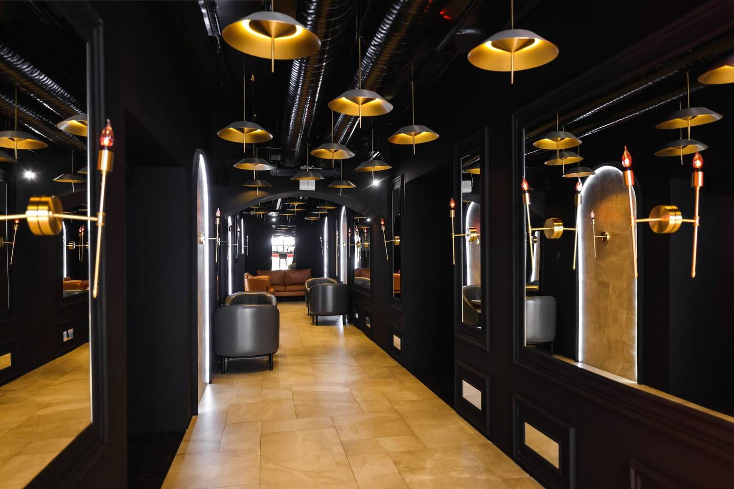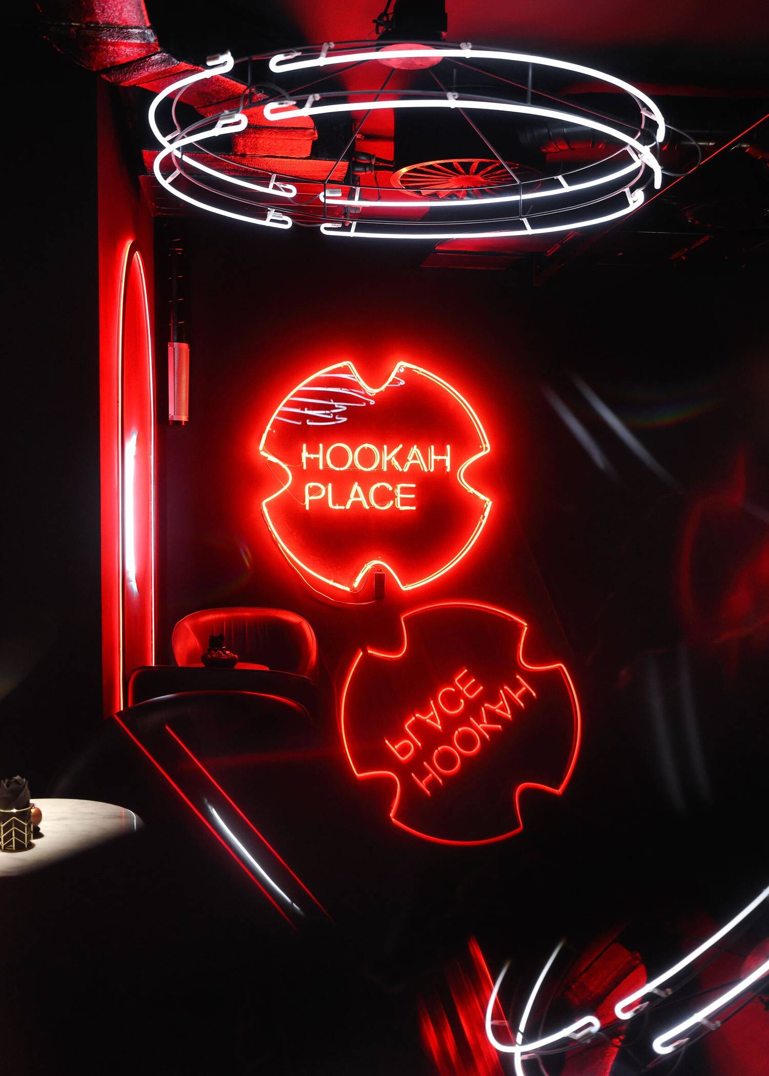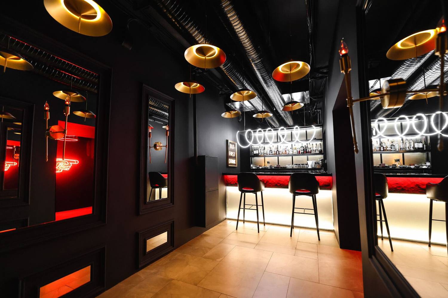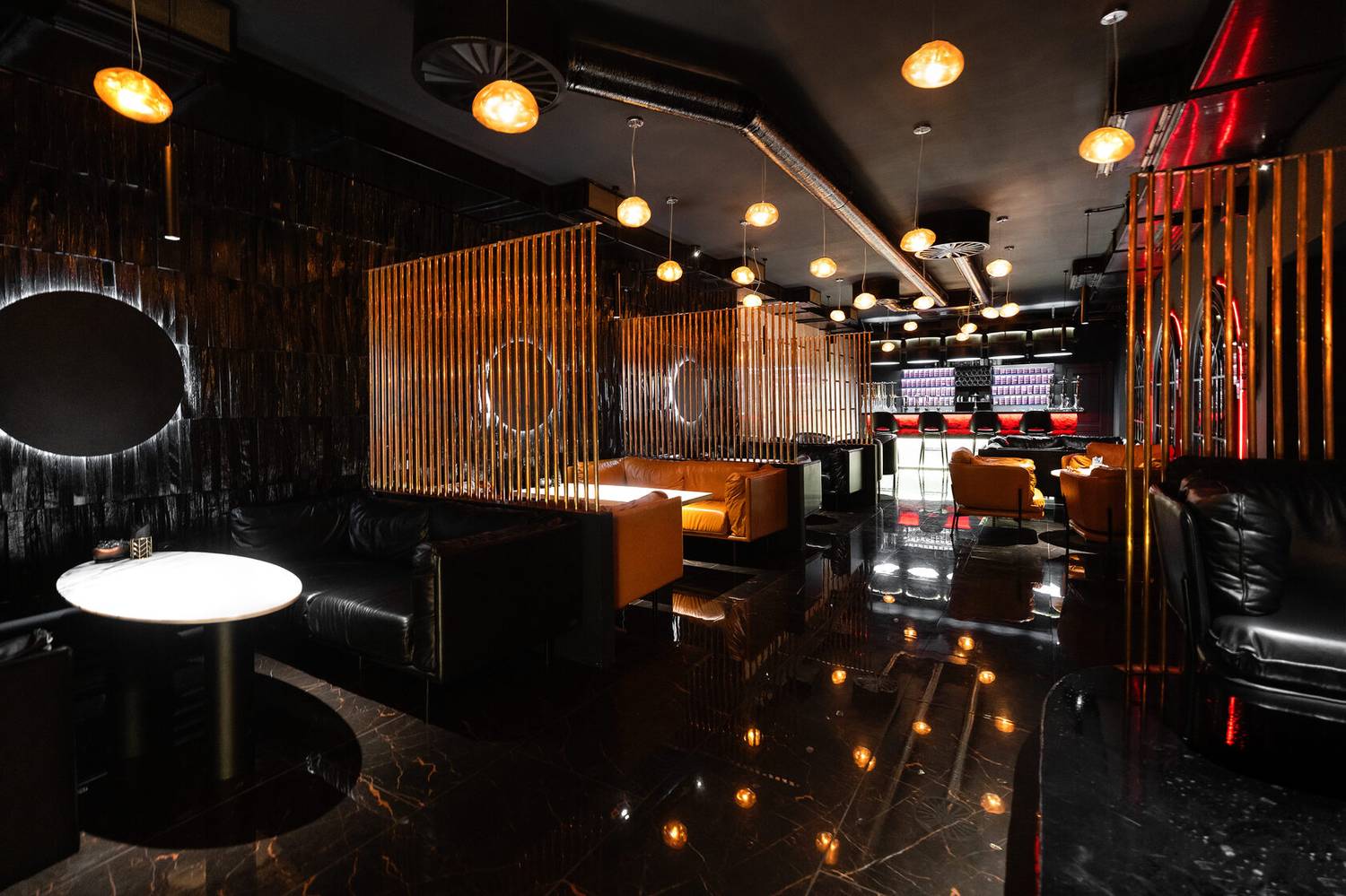 Атмосфера. Интерьер в драматичной черно-красной гамме с акцентами металлических поверхностей. Брутальный характер придают кожаные диваны, декоративные черные круги с контурной подсветкой на стенах и приглушенное красное освещение. Пространство разделено на три зала, где алые арки и барная зона с золотистыми светильниками.