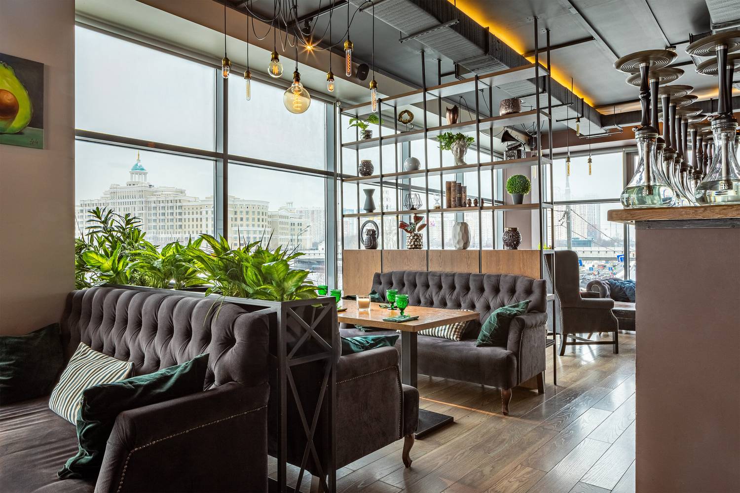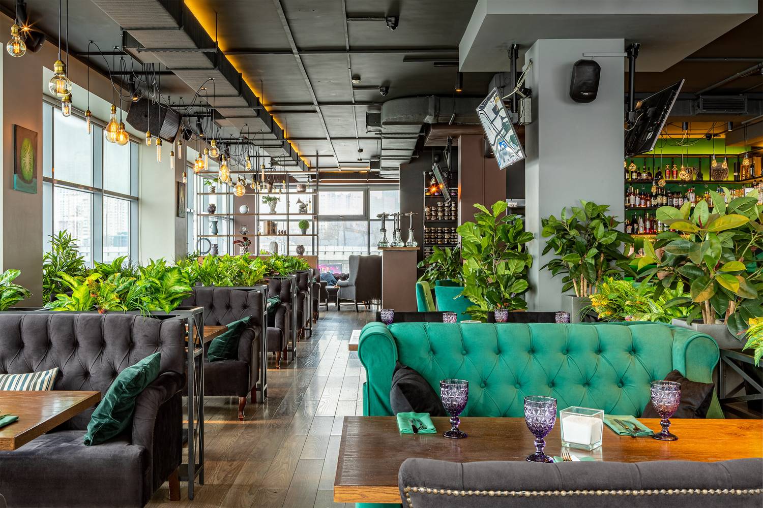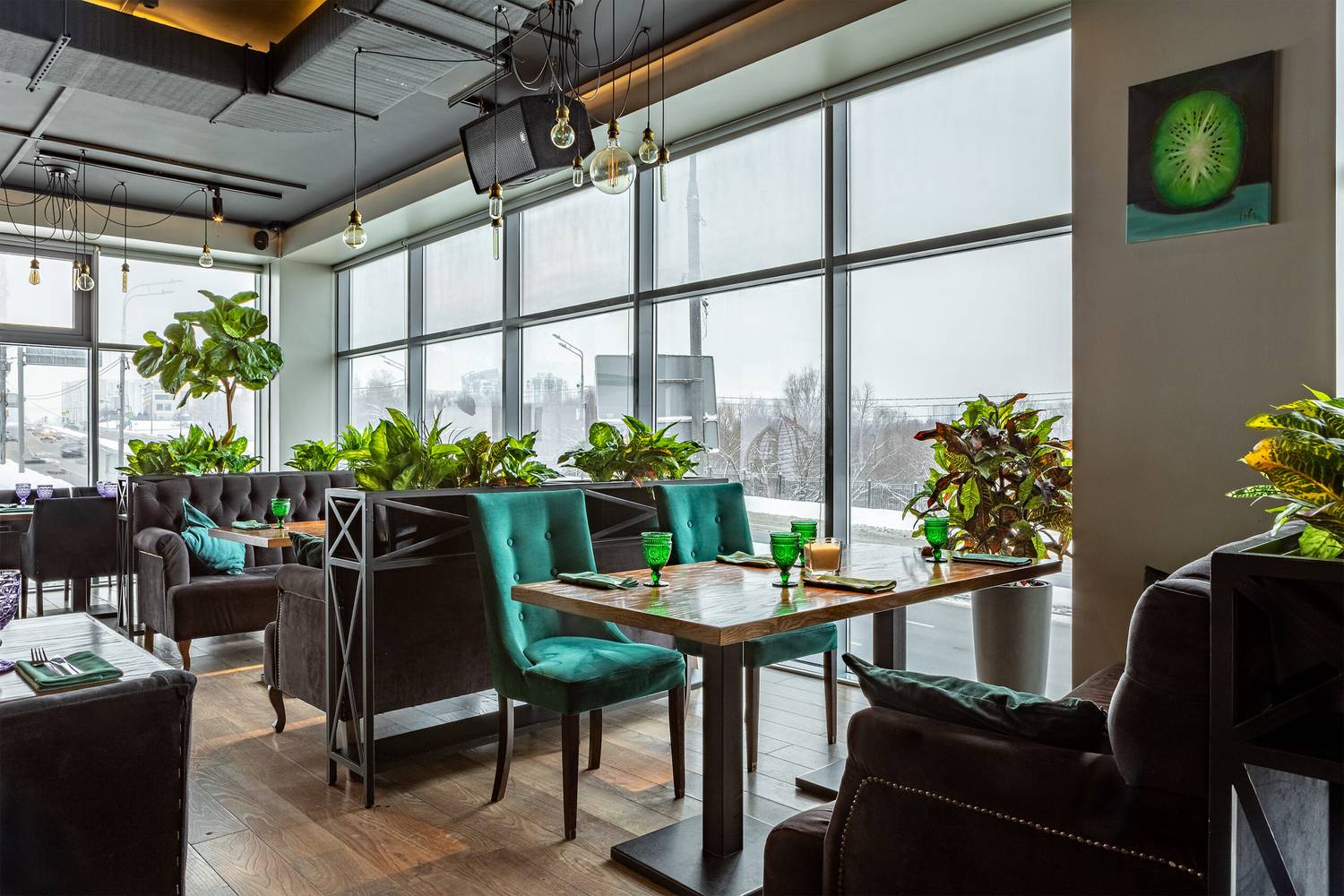 Атмосфера. Пространство в оливково-древесных тонах с панорамными окнами и растениями в кадках на полках и подоконниках. Гости могут расположиться как на мягких диванах, так и подвесных креслах или за баром.