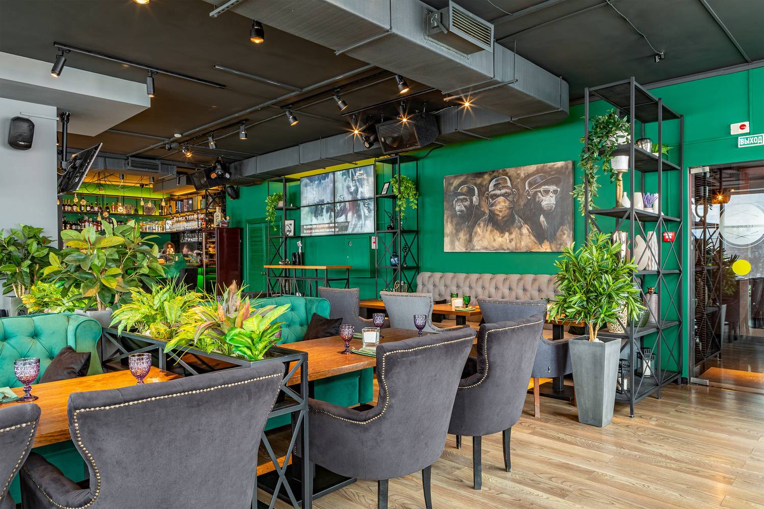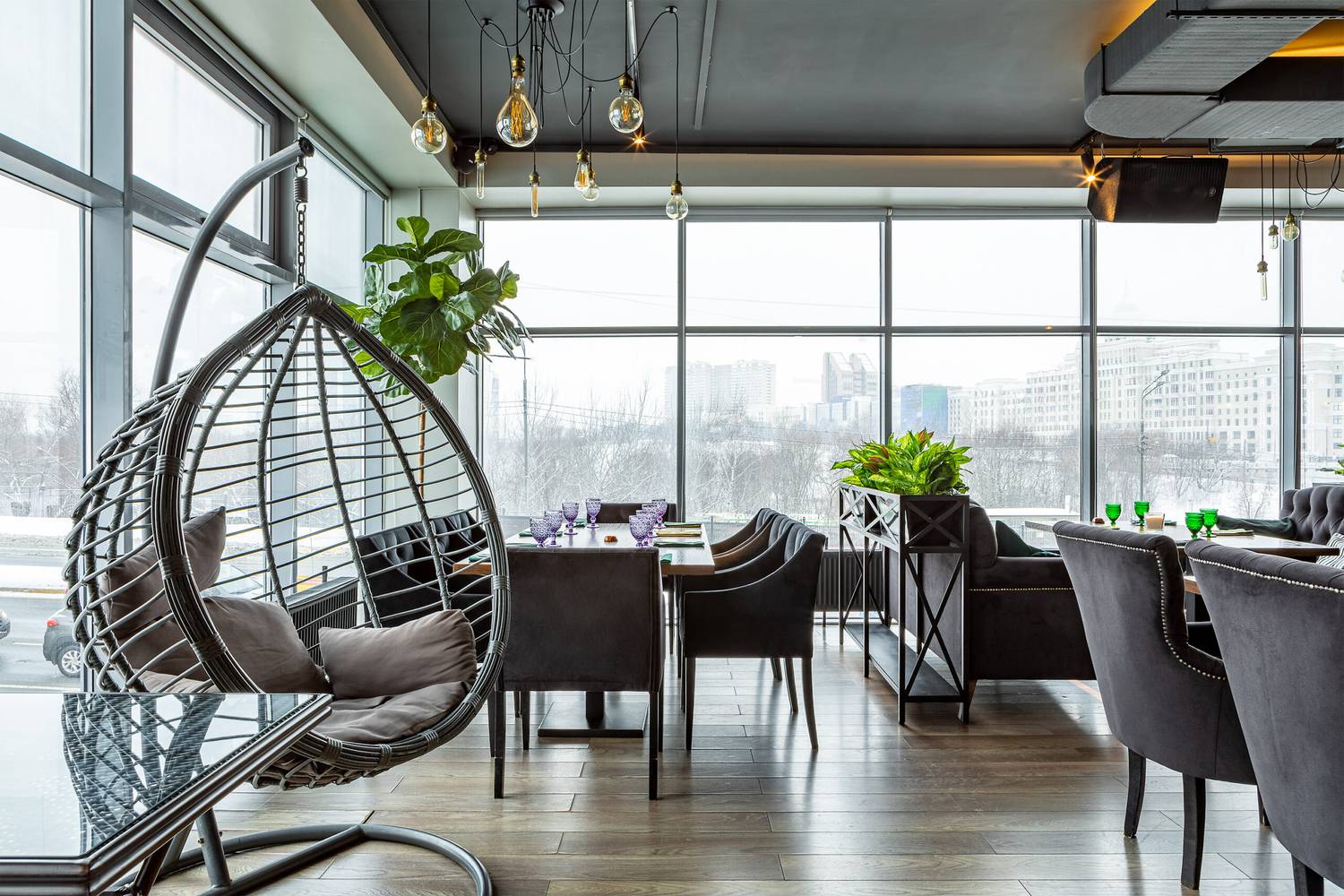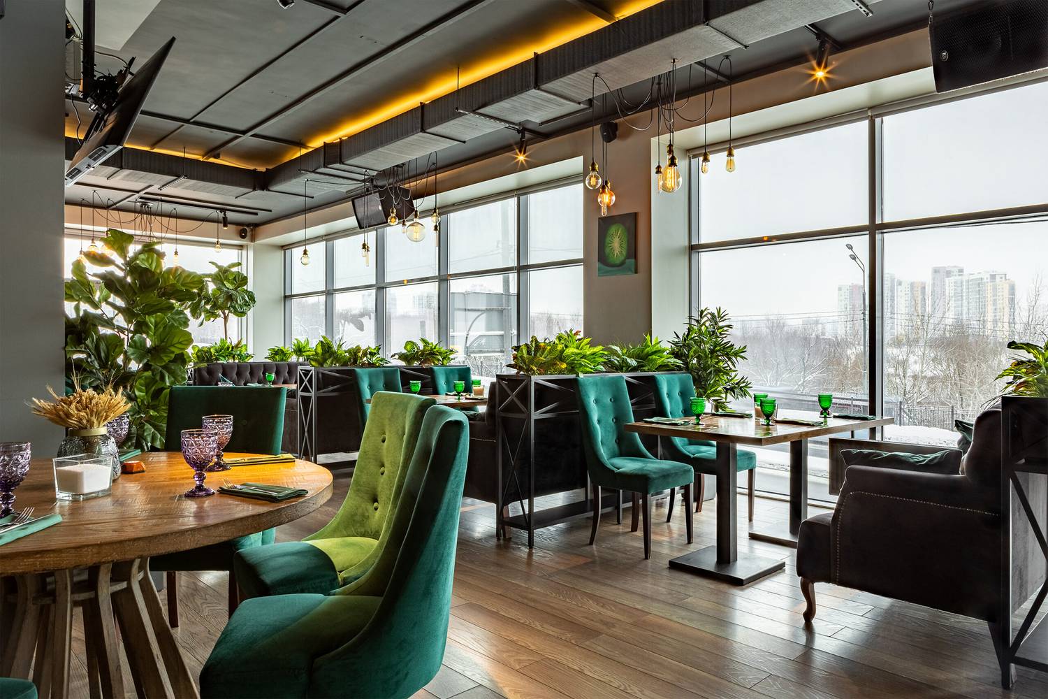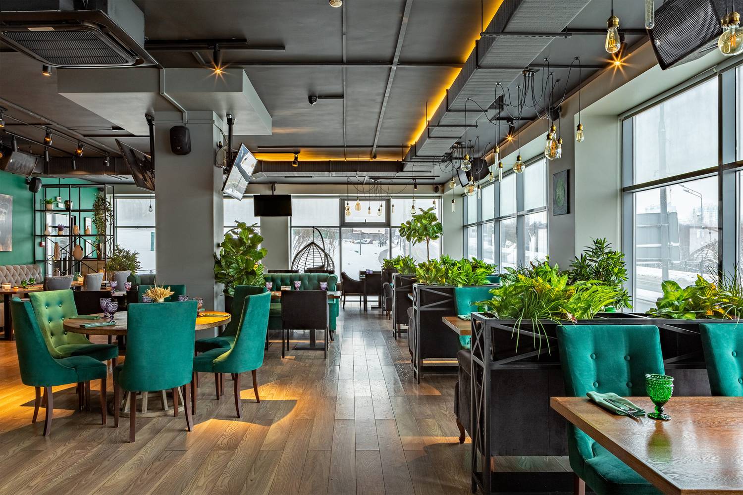 Атмосфера. Пространство в оливково-древесных тонах с панорамными окнами и растениями в кадках на полках и подоконниках. Гости могут расположиться как на мягких диванах, так и подвесных креслах или за баром.