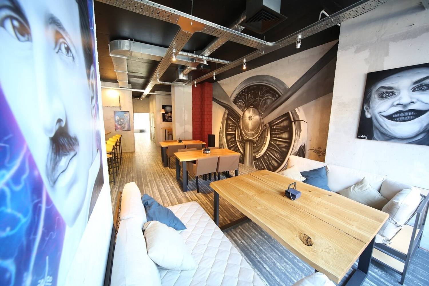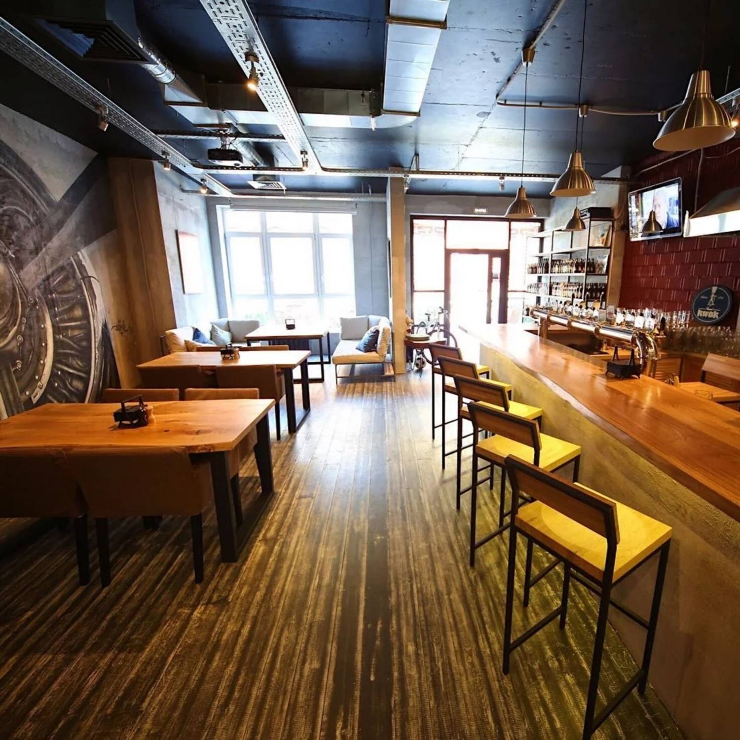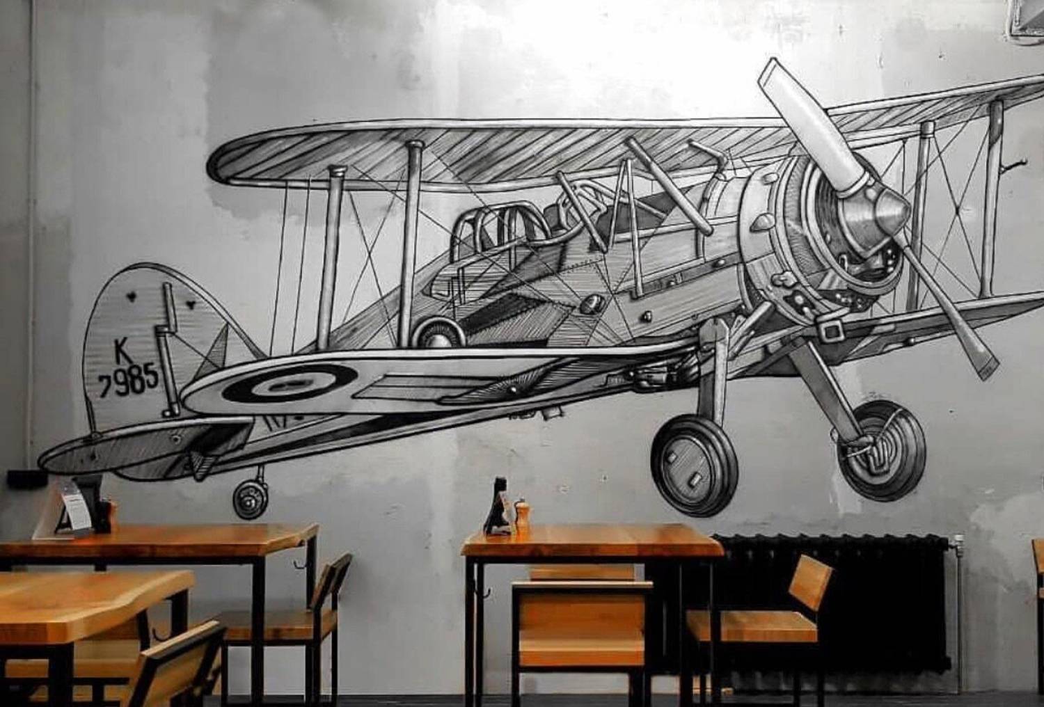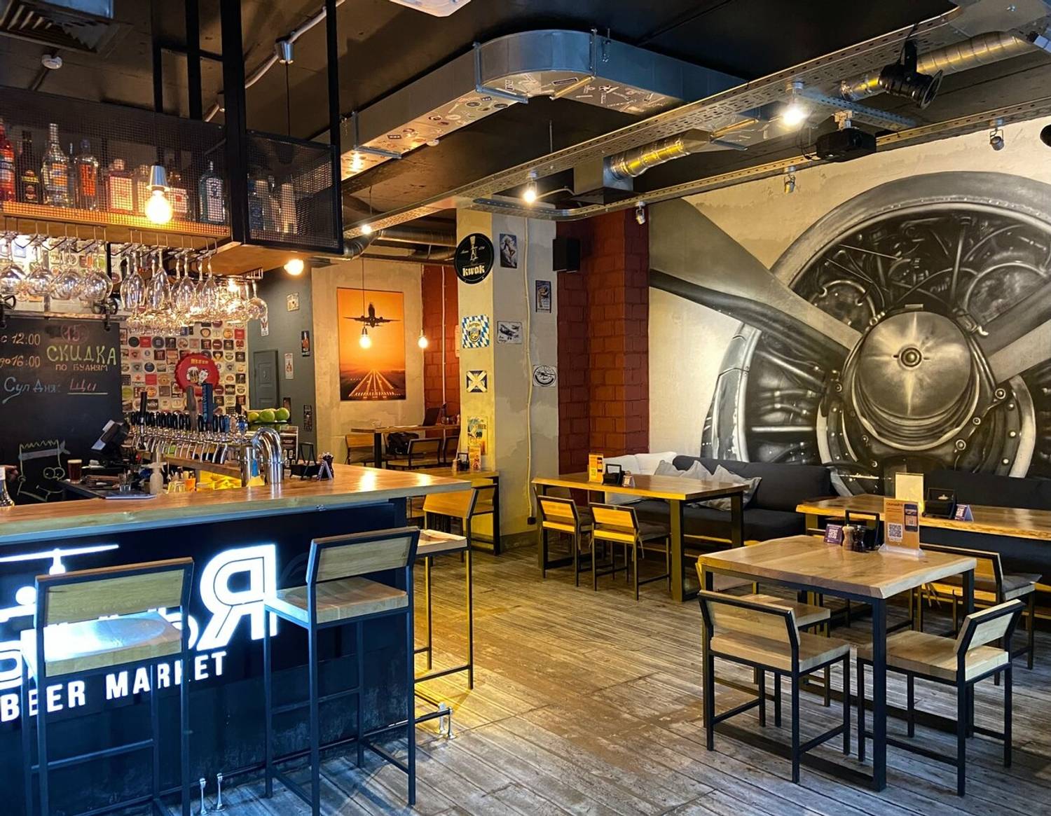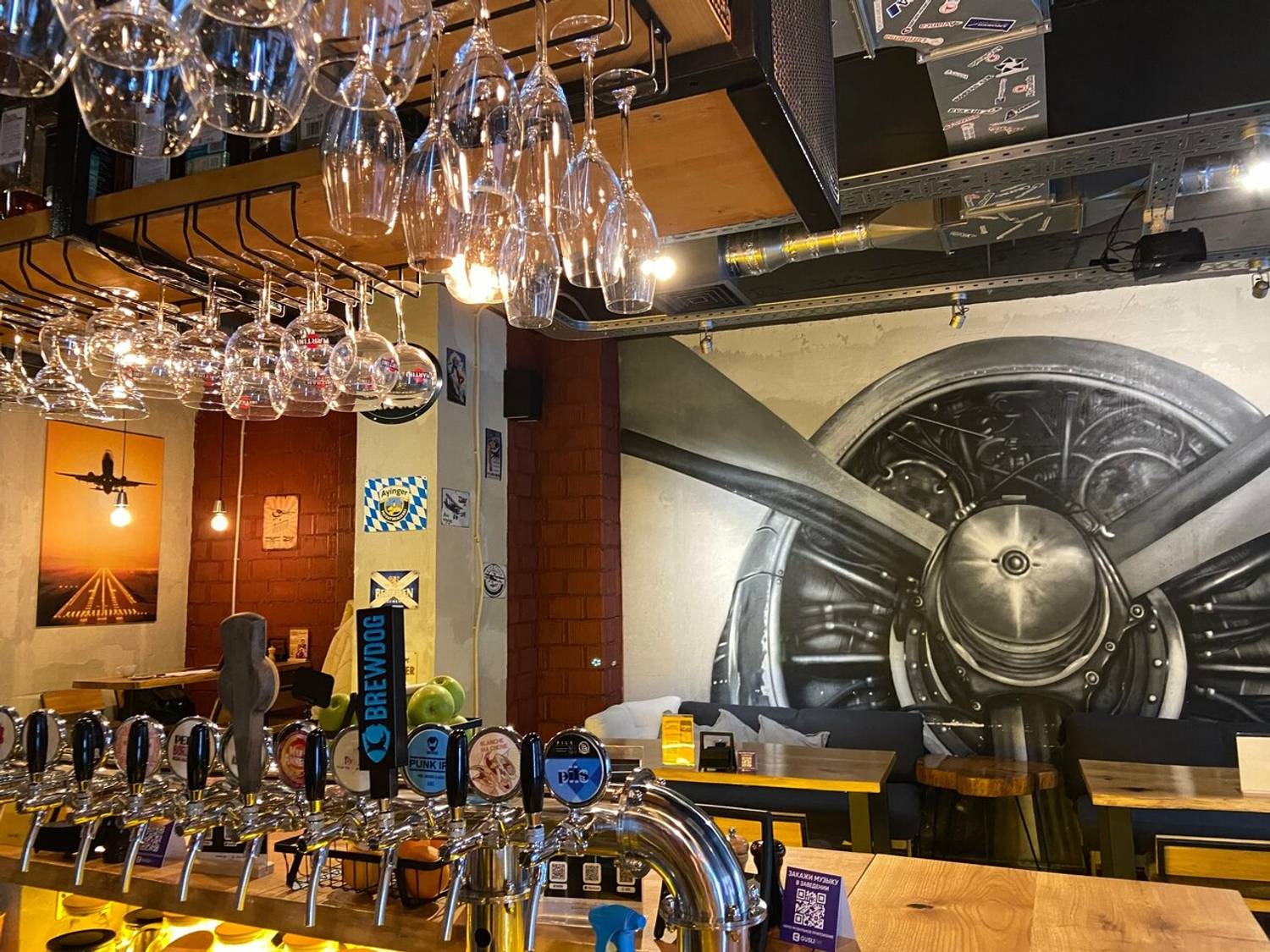 Атмосфера. Светлый зал с тематическими росписями на стенах — от схем пивных сортов до масштабного изображения самолета — создает динамичную и в то же время уютную обстановку. Большие экраны для спортивных трансляций, удобная мебель и продуманное освещение делают пространство идеальным для просмотра матчей в компании единомышленников.
