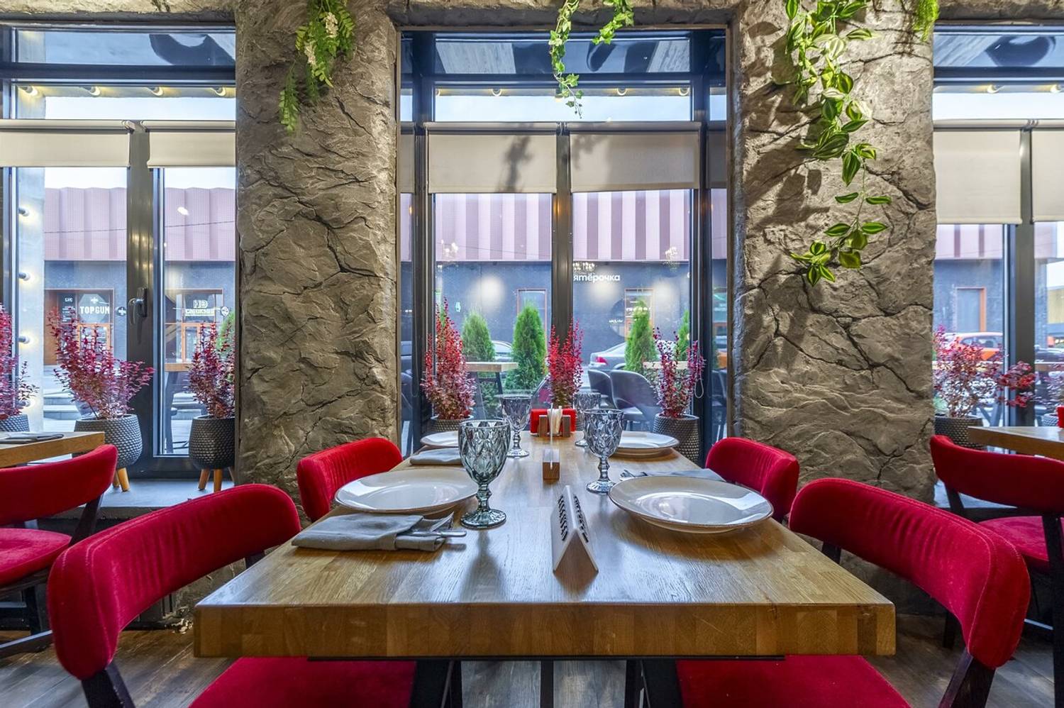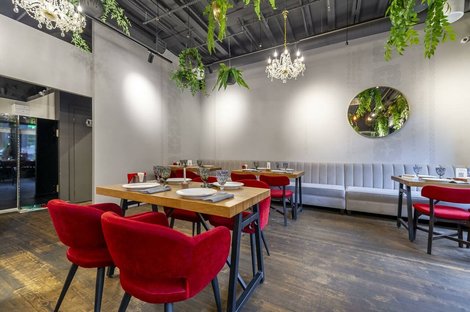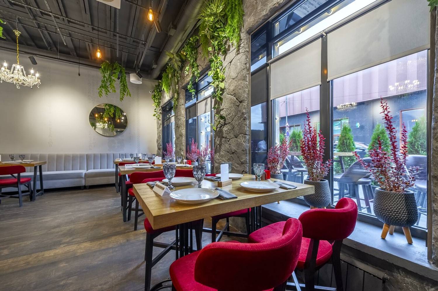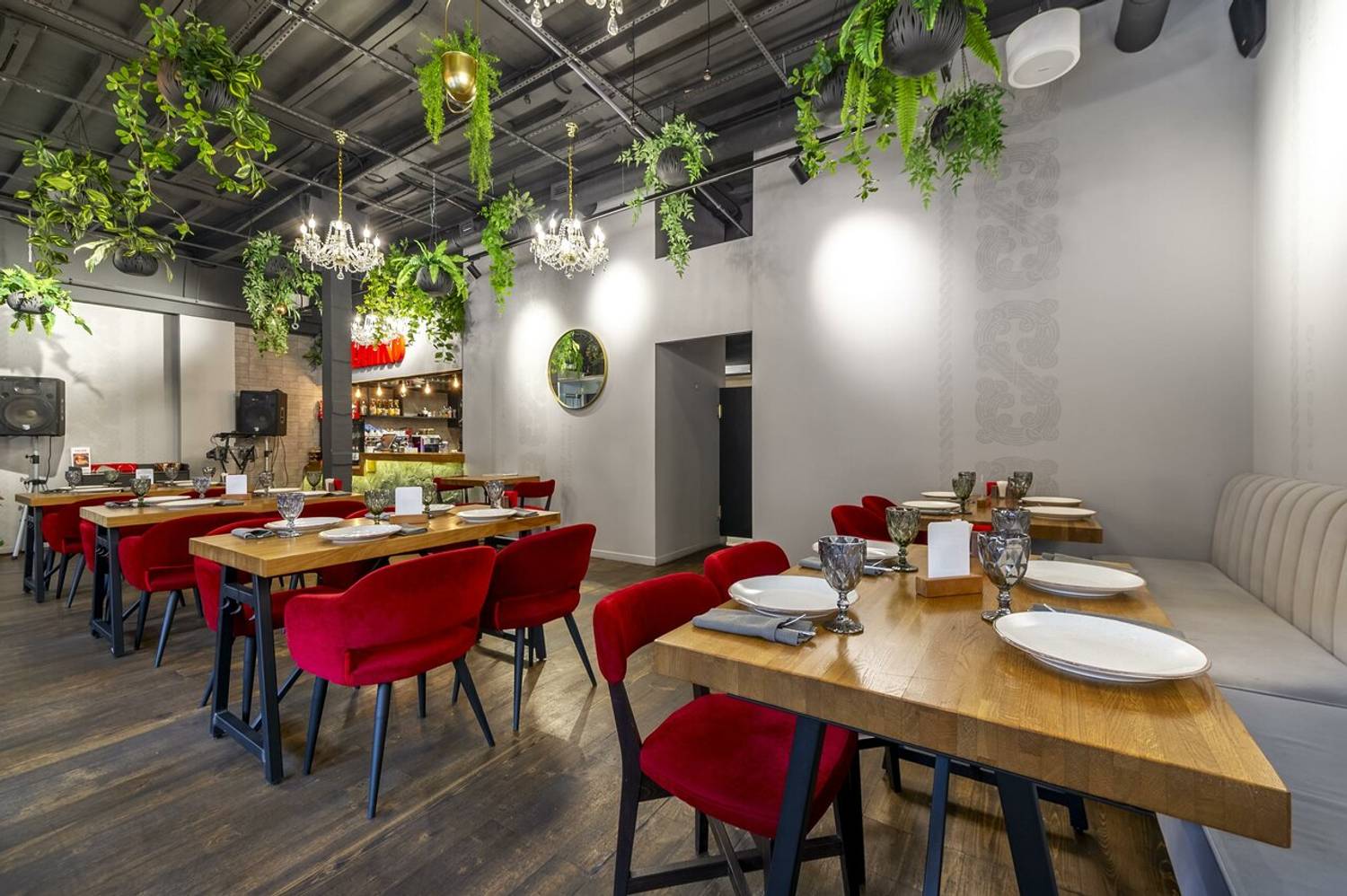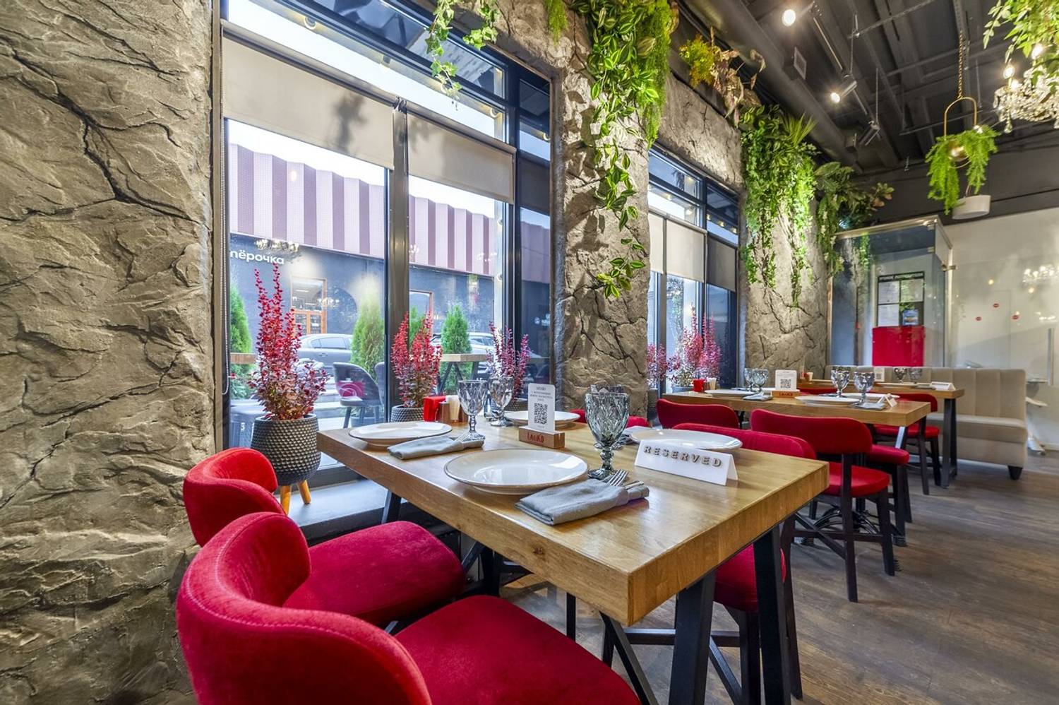 Атмосфера. Пространство с каменными стенами, виноградными лозами и тропическими растениями создает ощущение южного гостеприимства. Большие окна наполняют зал светом, а вечером мягкая подсветка и красные велюровые кресла добавляют уюта. Зеркала вдоль стен визуально расширяют пространство, создавая больше пространства и простора.