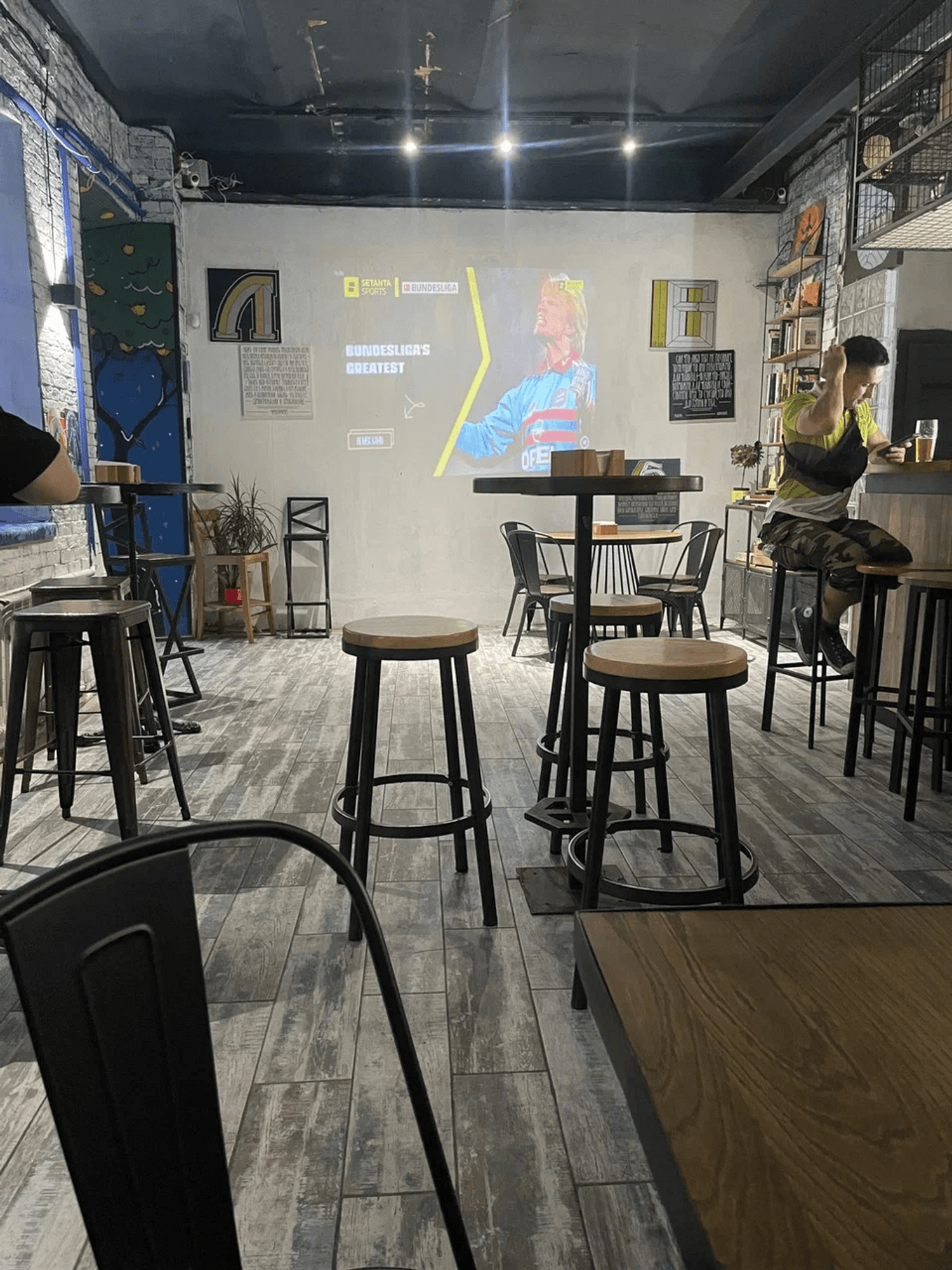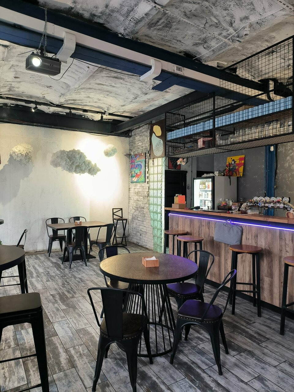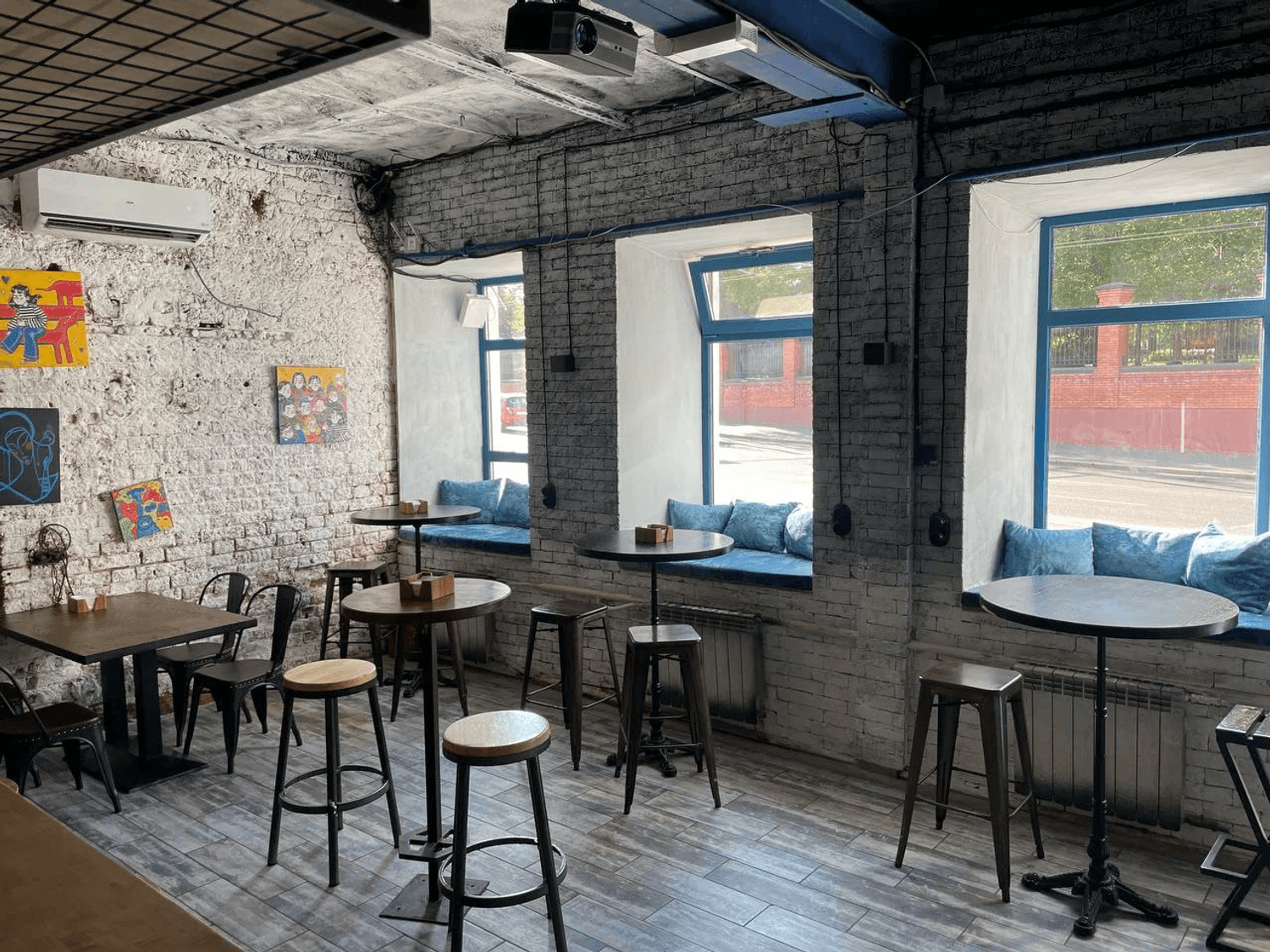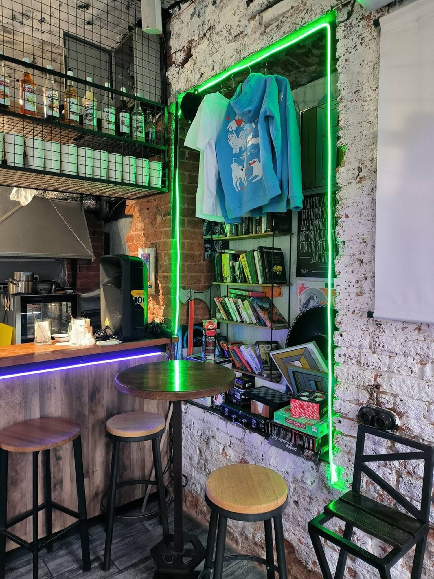 Атмосфера. Здесь гости могут разместиться за барной стойкой или на подоконниках с подушками. Спокойный интерьер со стенами, которые украсили советскими плакатами и стикерами.