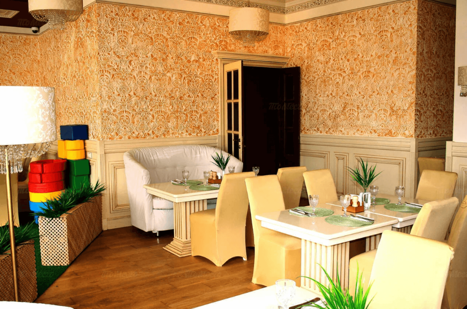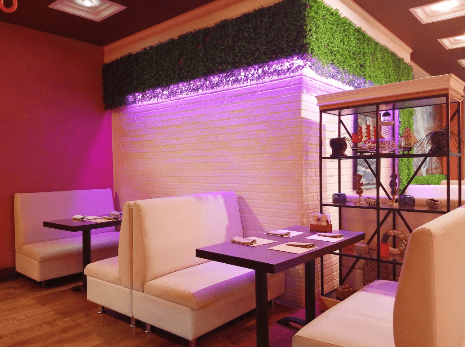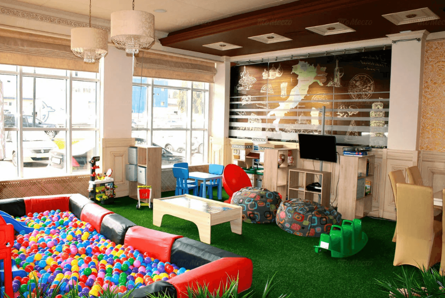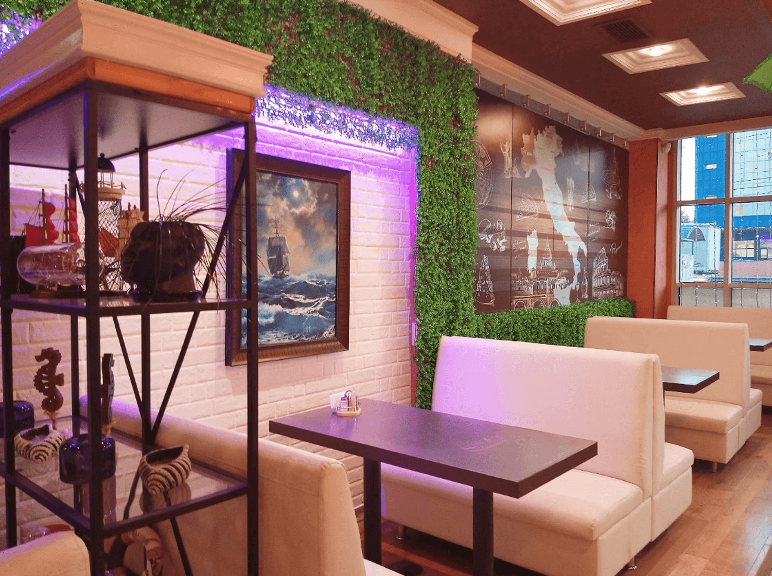 Атмосфера. Светлое пространство в кремово-пудровой гамме с белыми диванами. Стены оформлены искусственной травой и морской тематикой в декоре: графическая карта на стене, картина с кораблем, подвесным зеленым зонтом и полками с морскими гребешками. Для детей работает игровая с телевизором, креслами-подушками и различными игрушками.