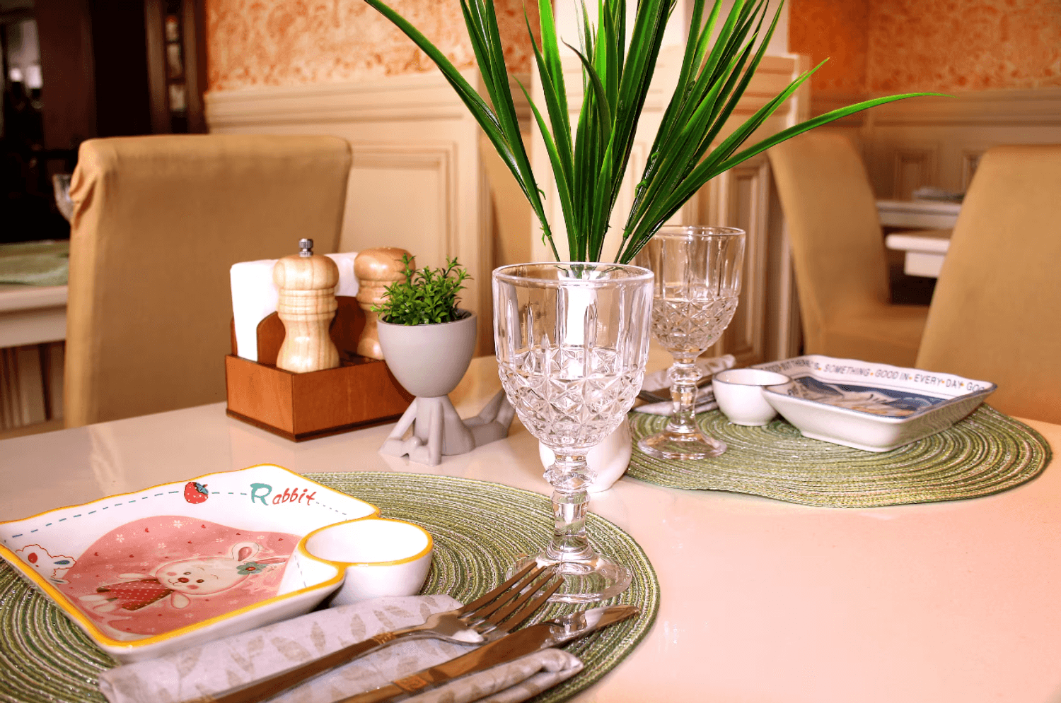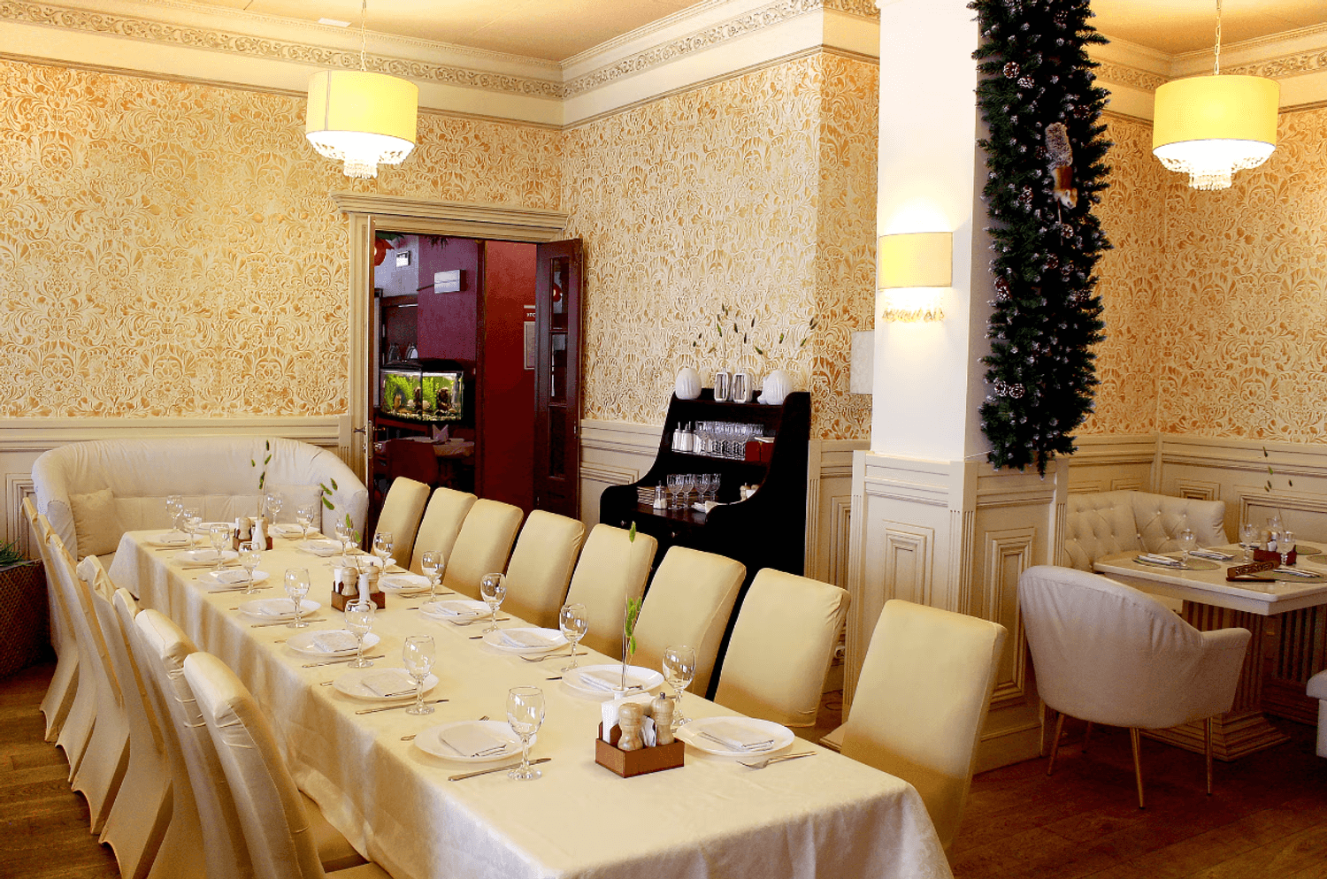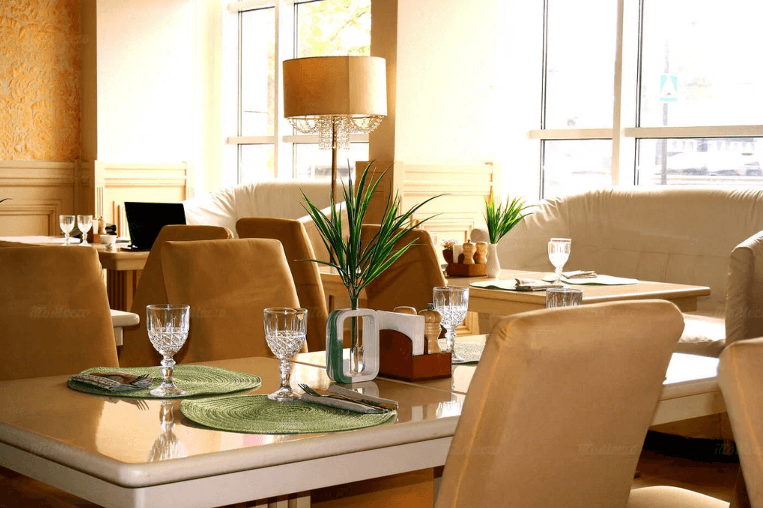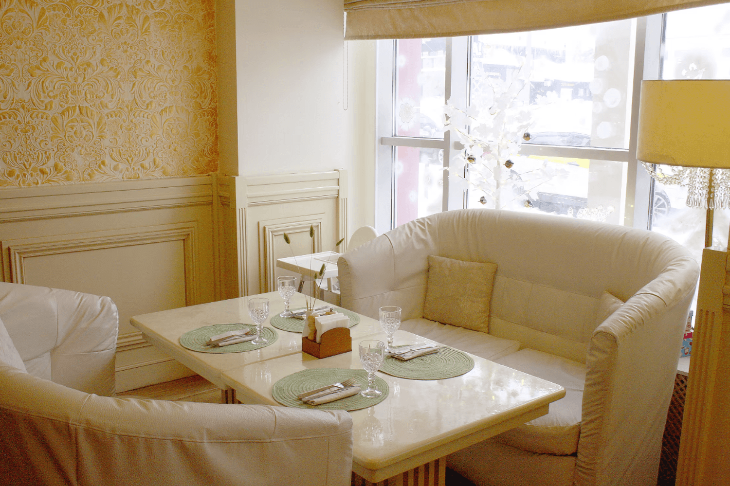 Атмосфера. Светлое пространство в кремово-пудровой гамме с белыми диванами. Стены оформлены искусственной травой и морской тематикой в декоре: графическая карта на стене, картина с кораблем, подвесным зеленым зонтом и полками с морскими гребешками. Для детей работает игровая с телевизором, креслами-подушками и различными игрушками.