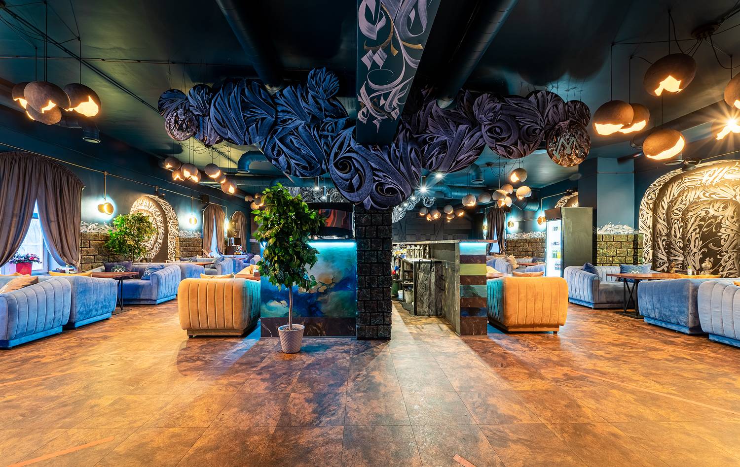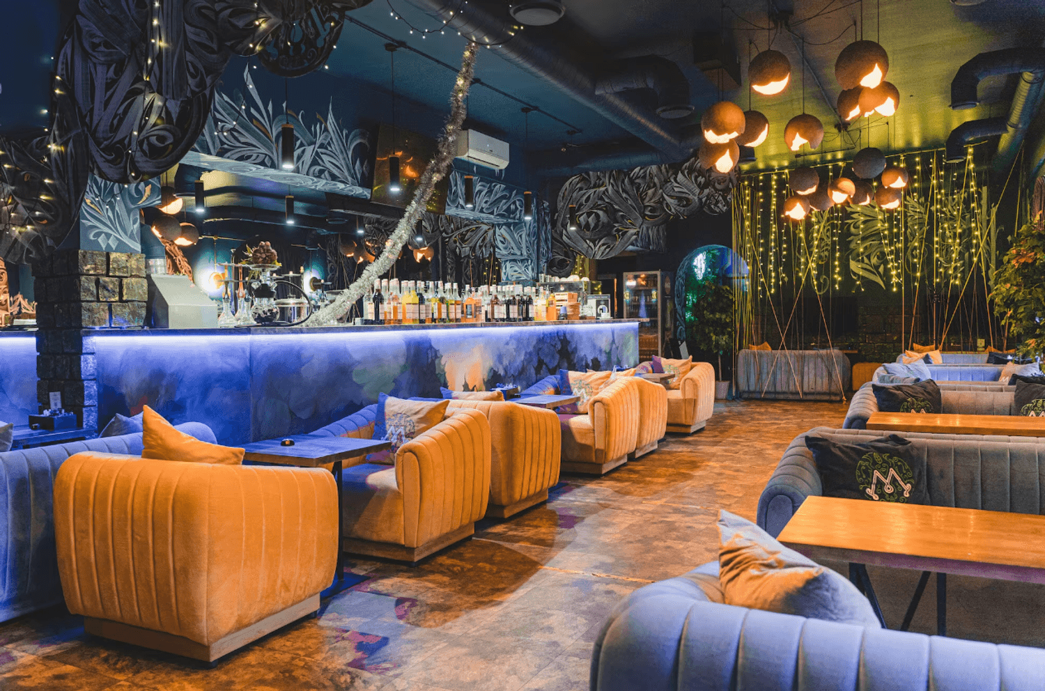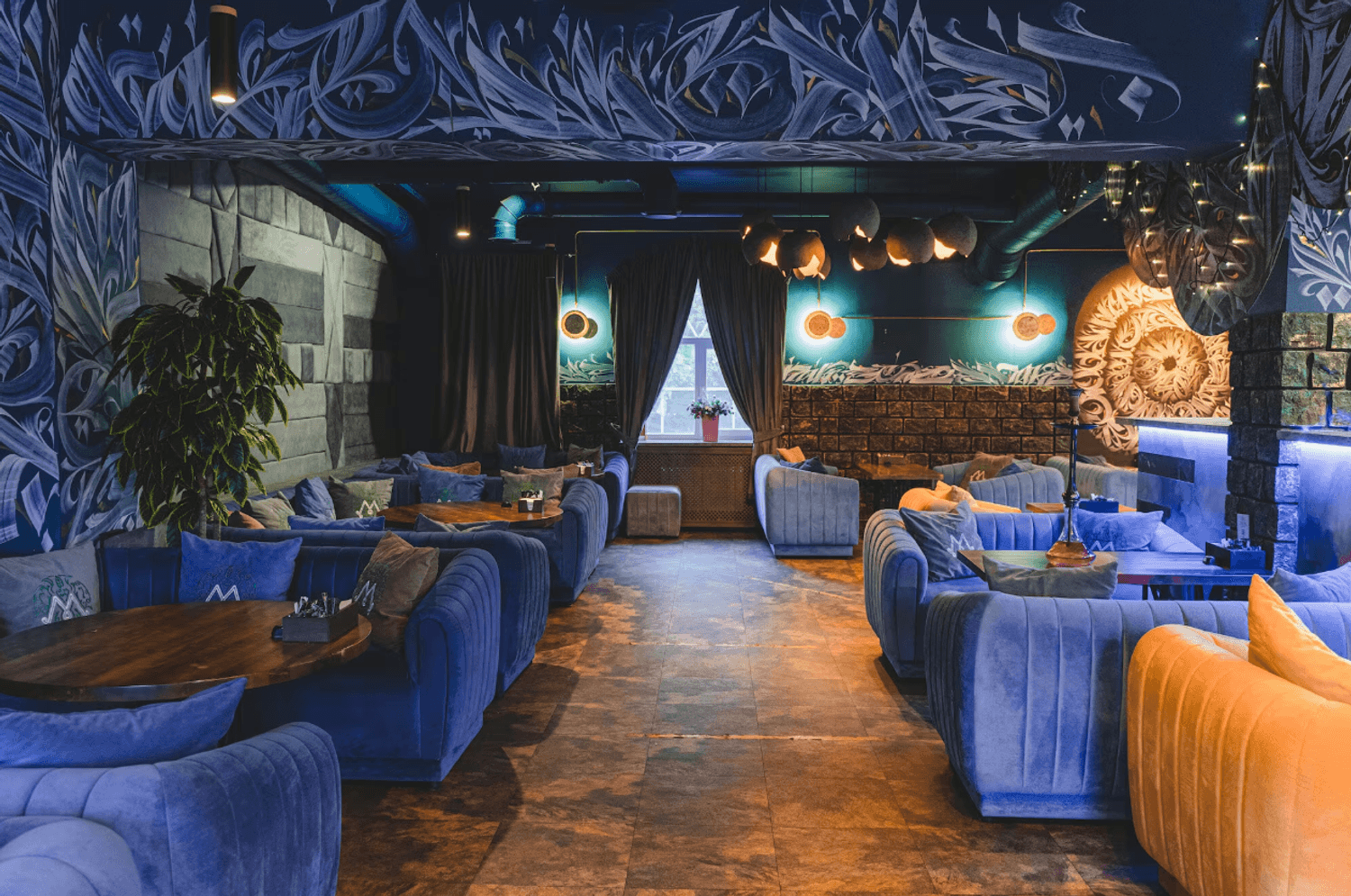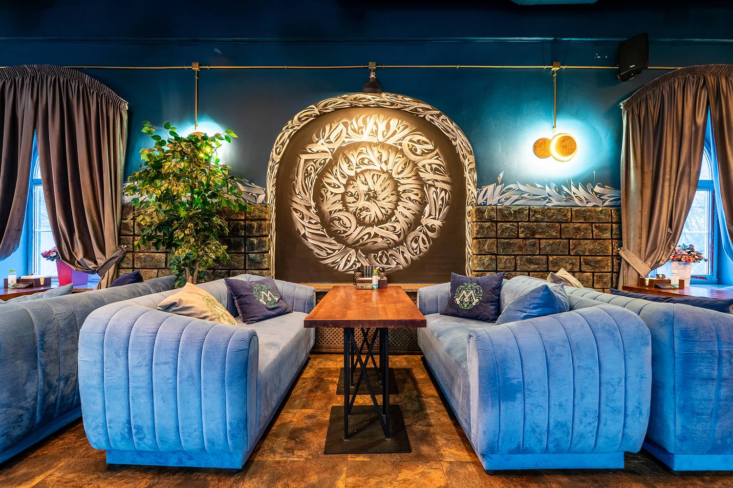 Атмосфера. Интерьер с мягкими синими диванами, дизайнерскими люстрами и декоративной росписью создает расслабленную и уютную обстановку, которая дополняется сотнями теплых огоньков гирлянд. В зале оборудована зеленая фотозона с необычной стеной из растений и логотипом заведения, отлично подходящая для селфи.