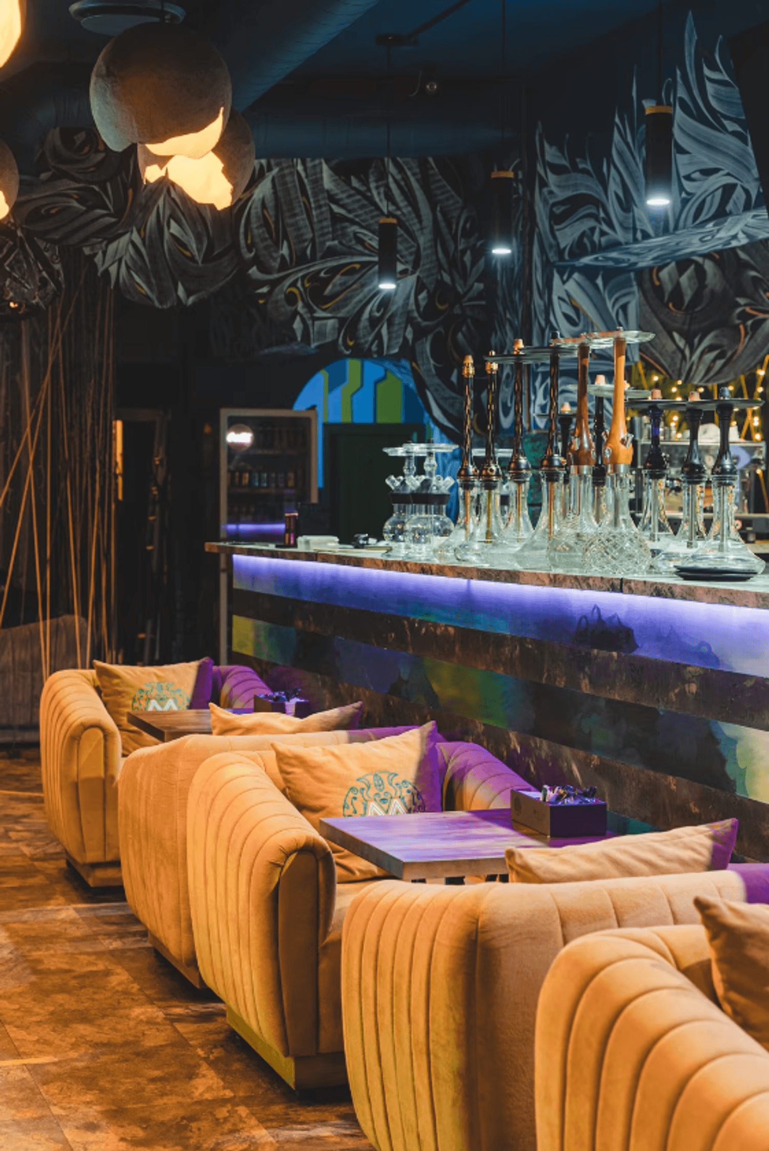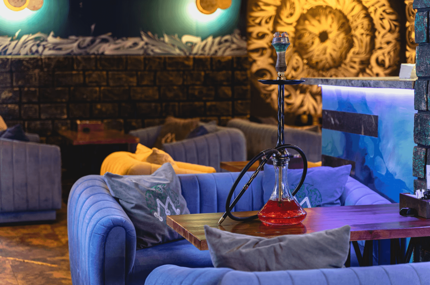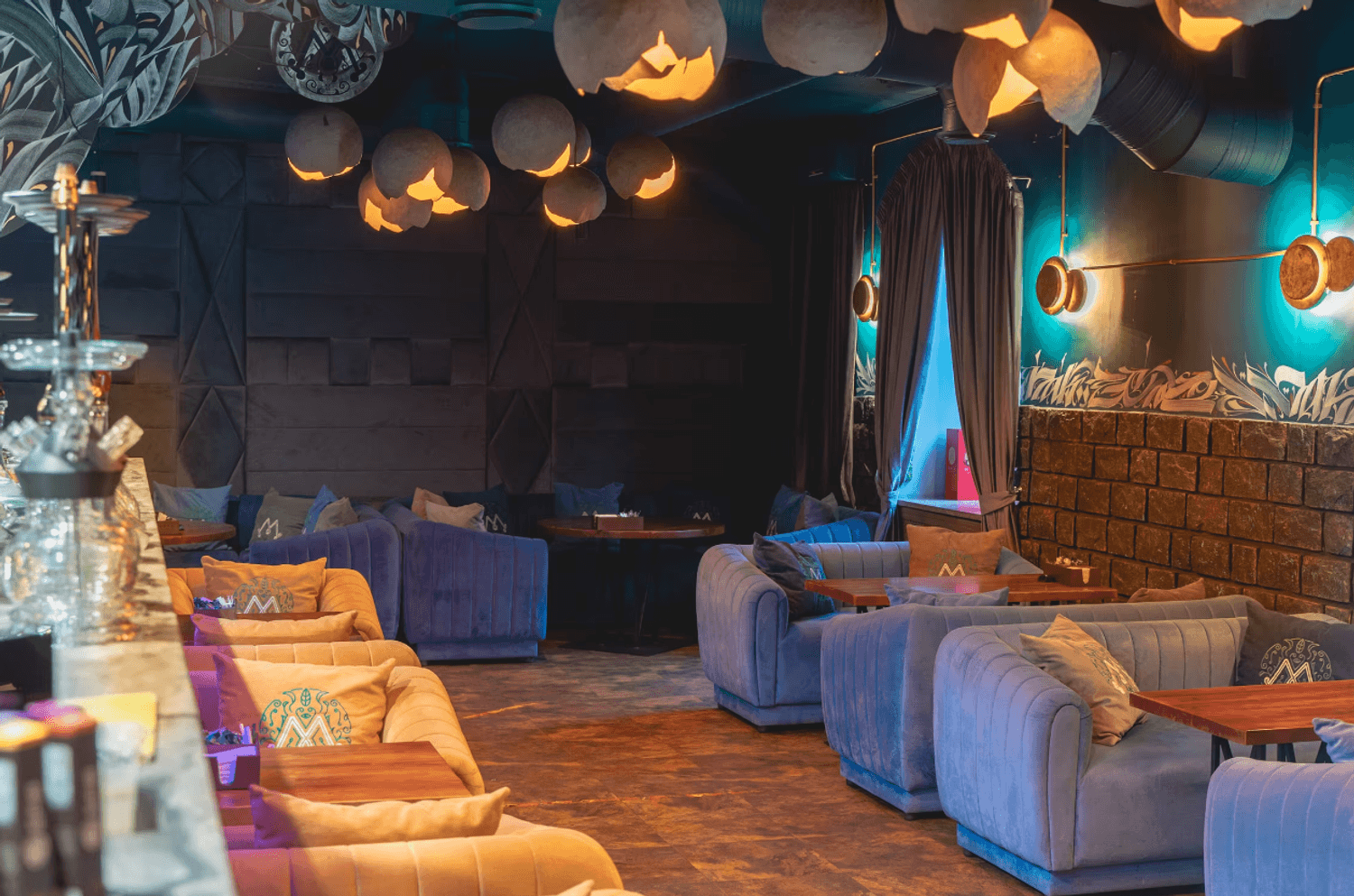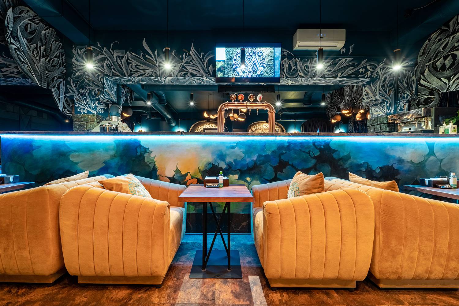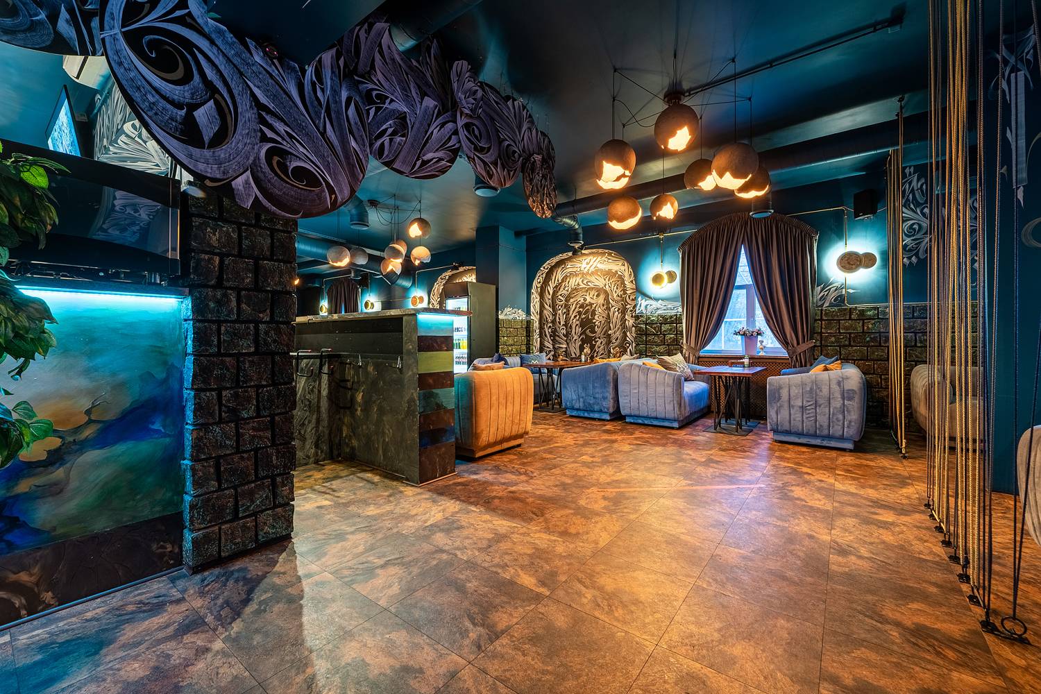 Атмосфера. Интерьер с мягкими синими диванами, дизайнерскими люстрами и декоративной росписью создает расслабленную и уютную обстановку, которая дополняется сотнями теплых огоньков гирлянд. В зале оборудована зеленая фотозона с необычной стеной из растений и логотипом заведения, отлично подходящая для селфи.