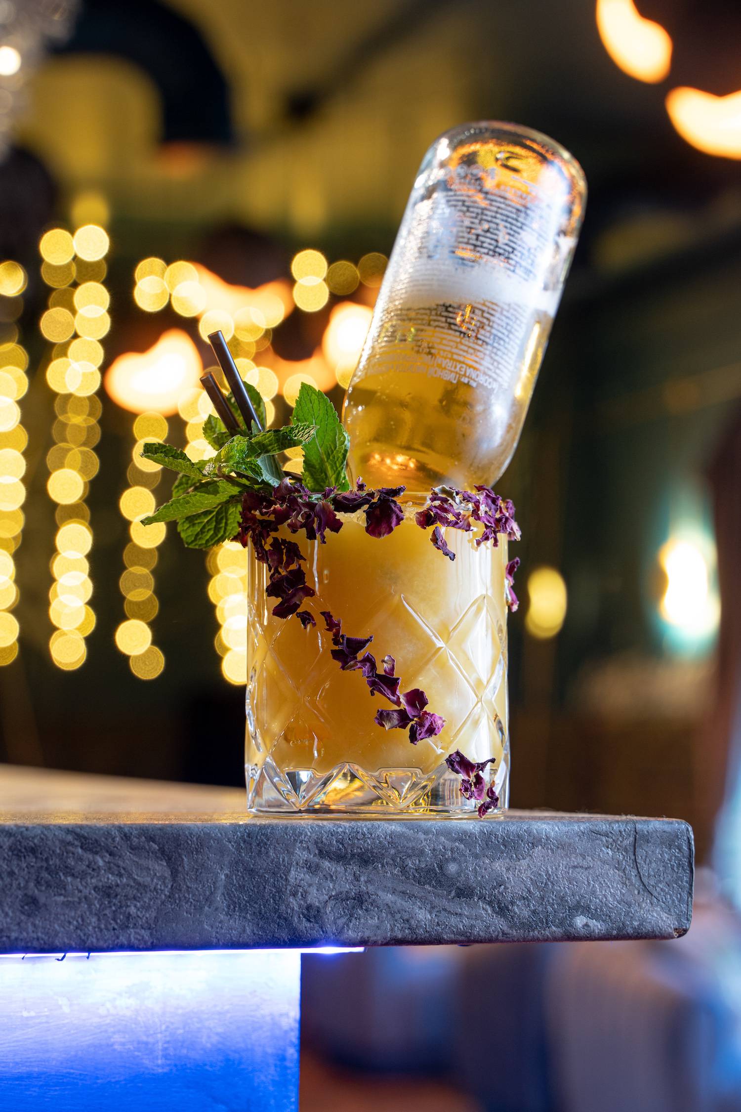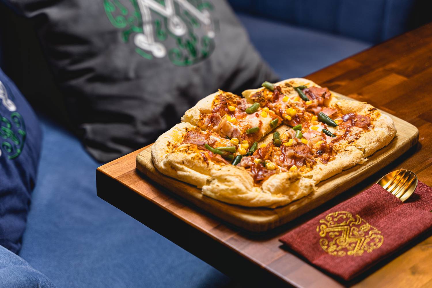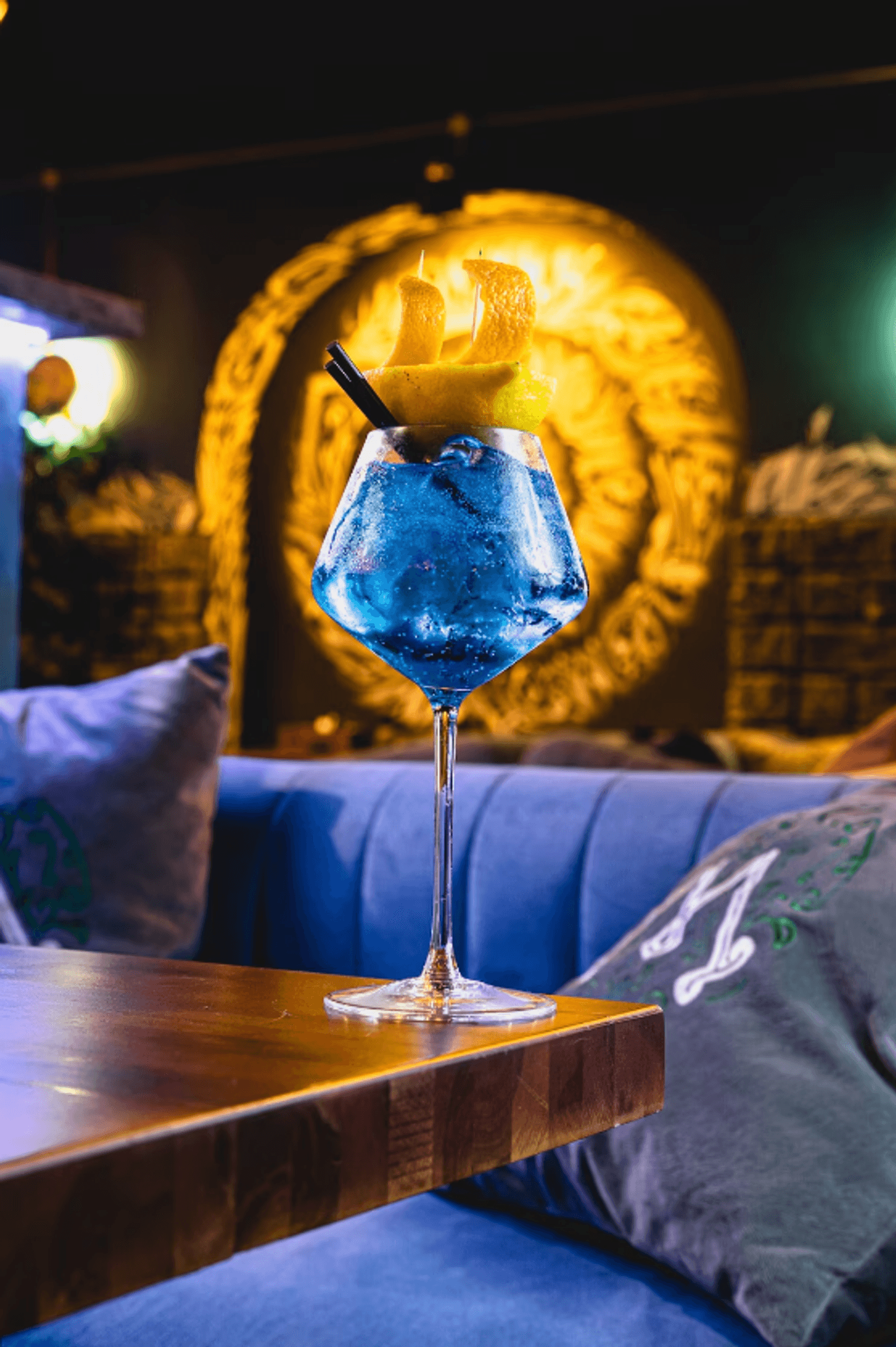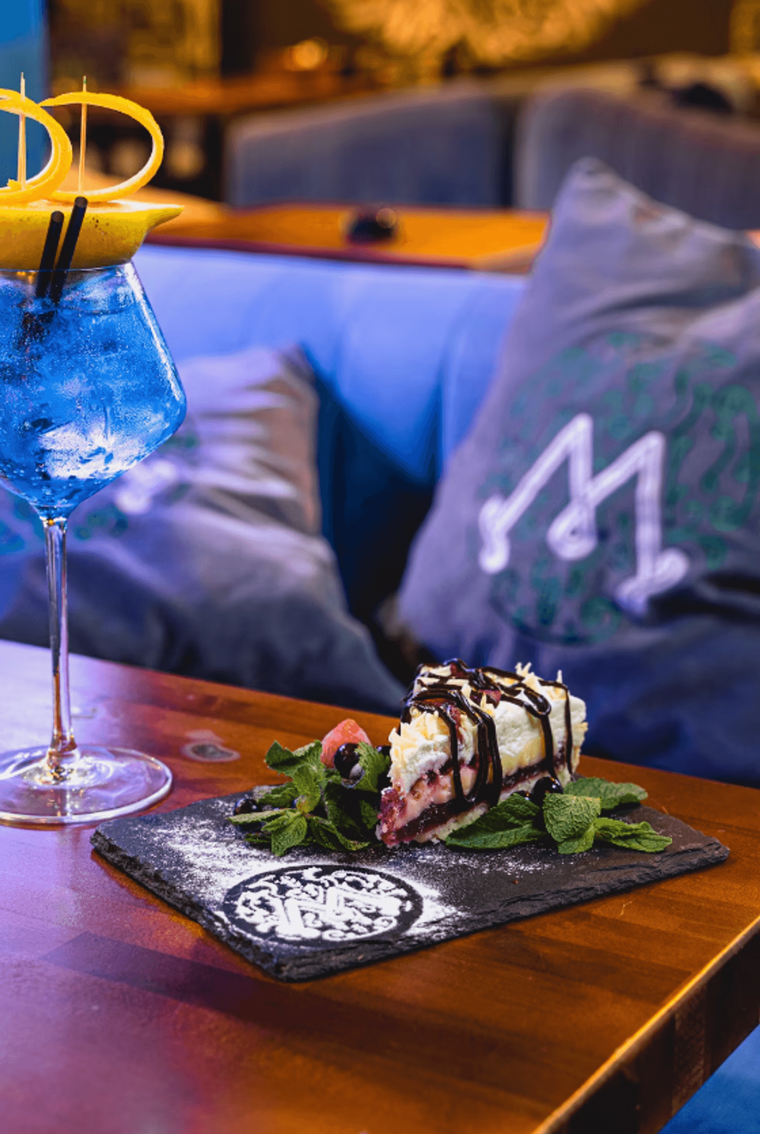 Атмосфера. Интерьер с мягкими синими диванами, дизайнерскими люстрами и декоративной росписью создает расслабленную и уютную обстановку, которая дополняется сотнями теплых огоньков гирлянд. В зале оборудована зеленая фотозона с необычной стеной из растений и логотипом заведения, отлично подходящая для селфи.