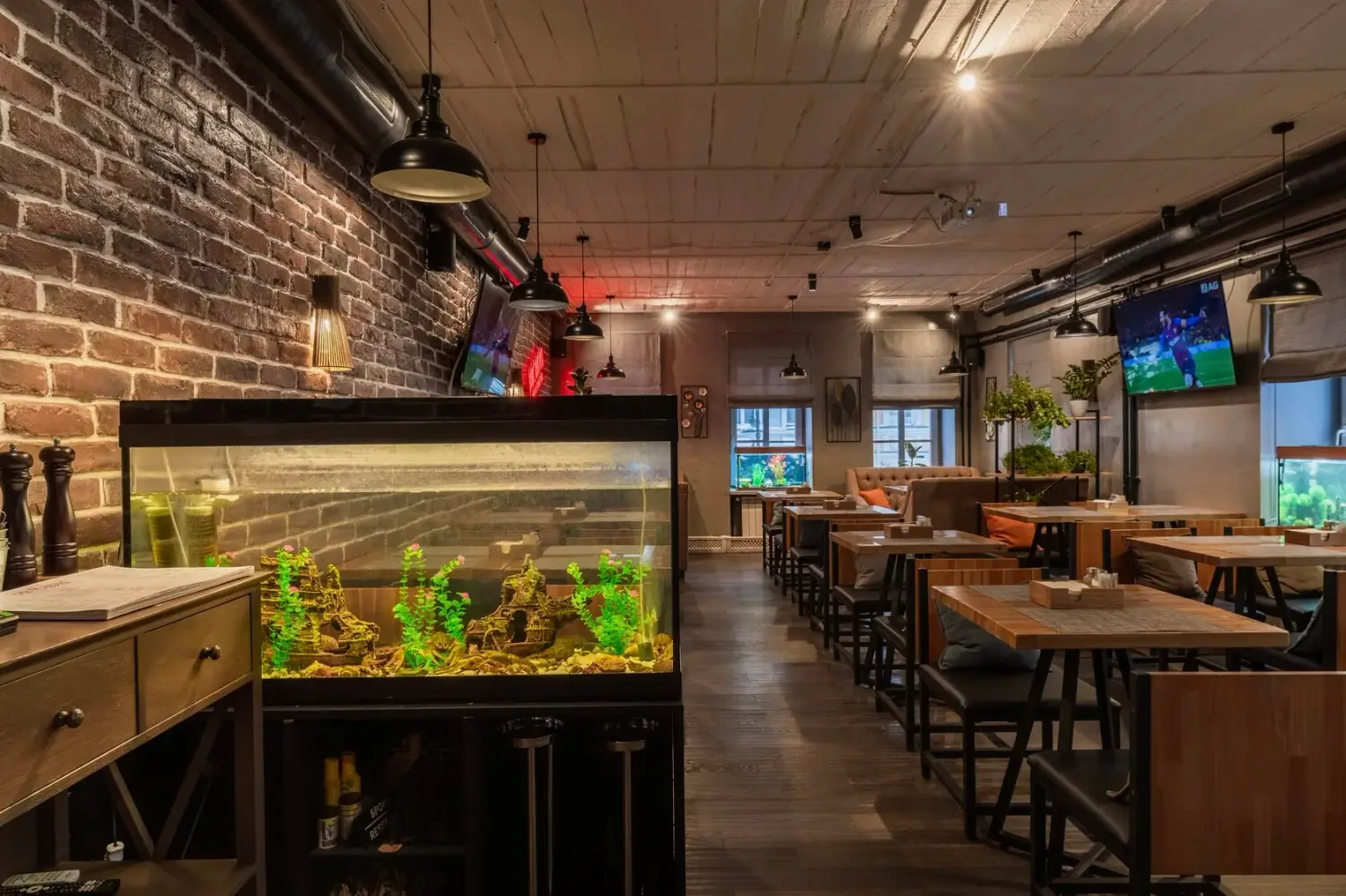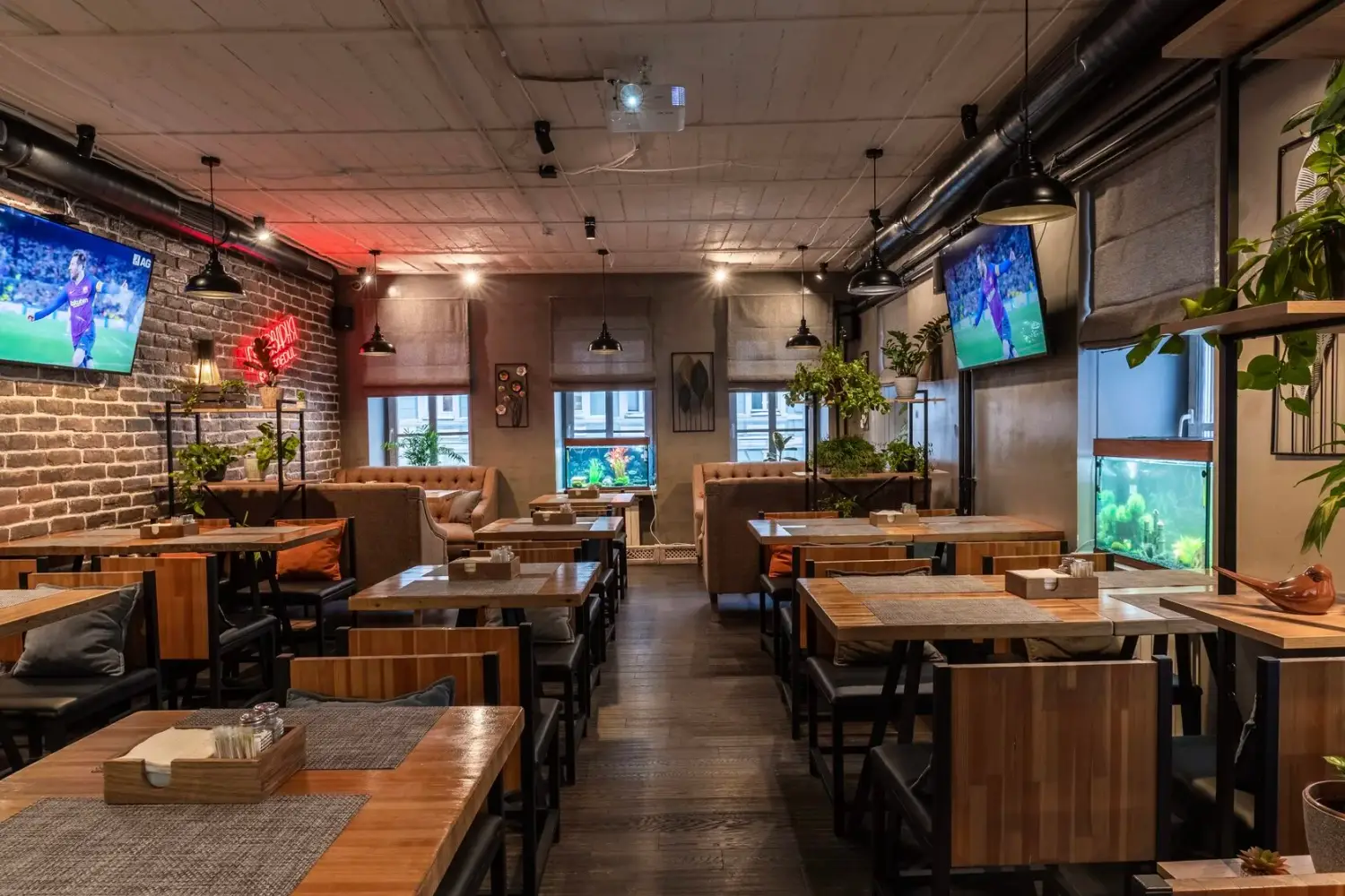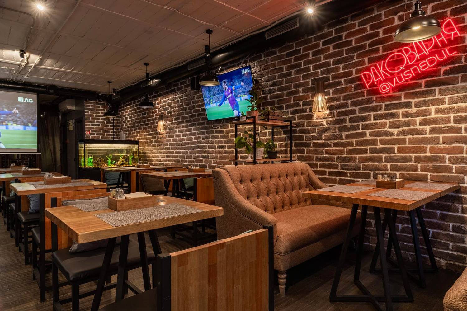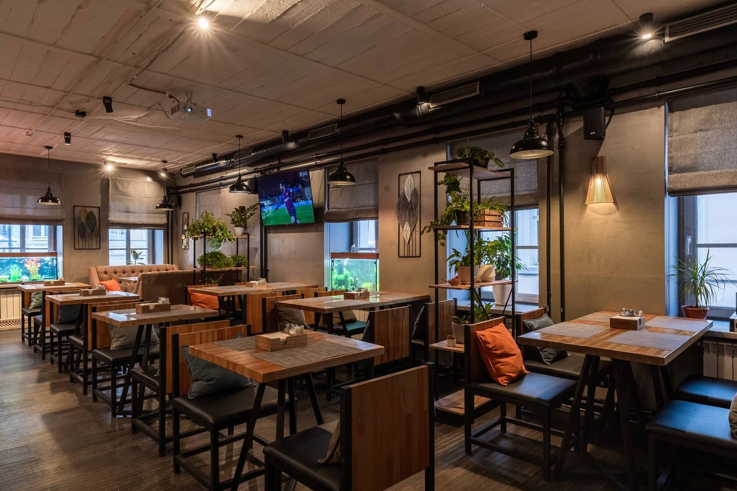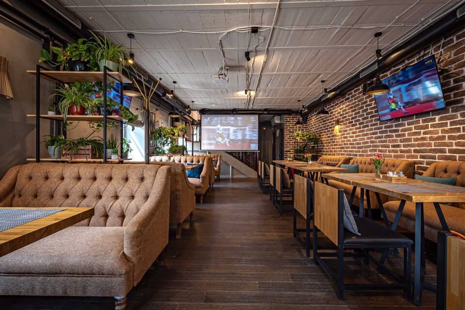 Атмосфера. Дизайн в минималистичном стиле: кирпичные стены, деревянная отделка и римские шторы создают, разноцветные подушки, зелень в кадках. Также можно арендовать банкетный зал для праздника — тем более, здесь разрешено веселиться после 23:00. Внутри работает караоке, экран и показывают трансляции спортивных трансляций.