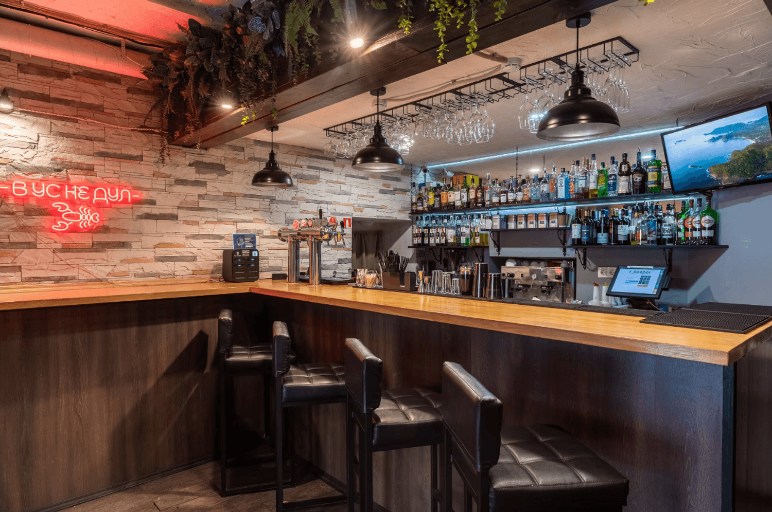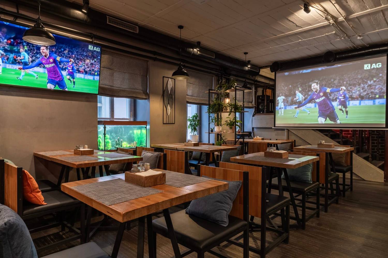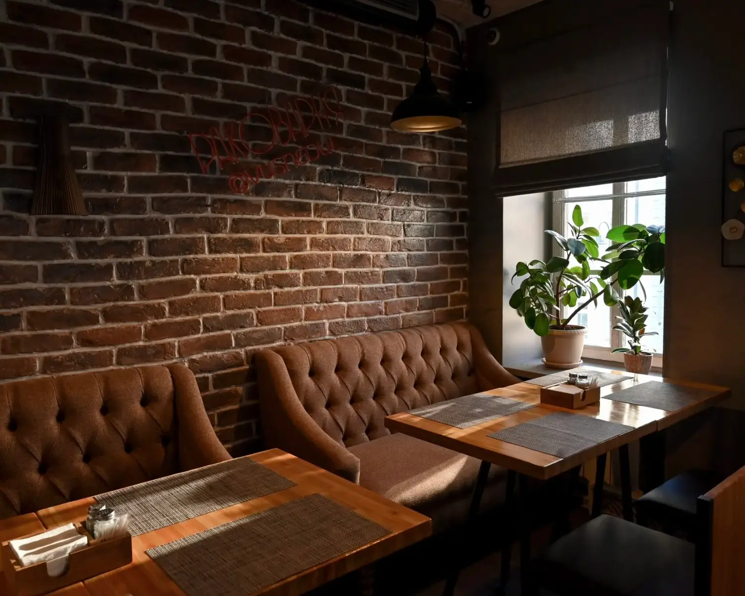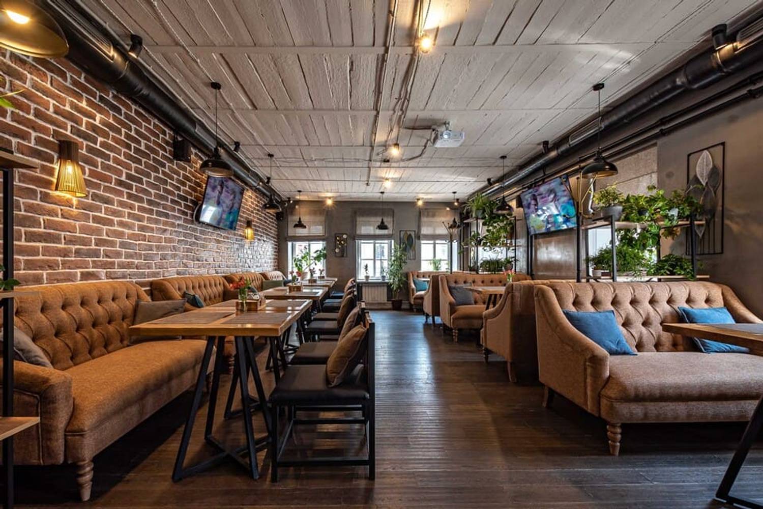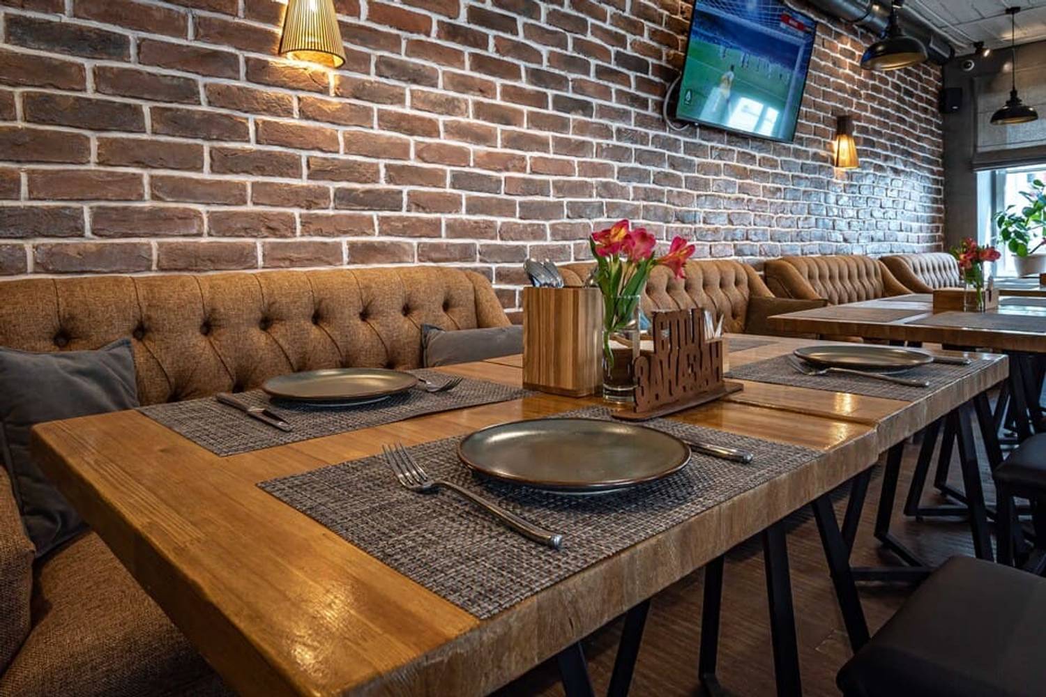 Атмосфера. Дизайн в минималистичном стиле: кирпичные стены, деревянная отделка и римские шторы создают, разноцветные подушки, зелень в кадках. Также можно арендовать банкетный зал для праздника — тем более, здесь разрешено веселиться после 23:00. Внутри работает караоке, экран и показывают трансляции спортивных трансляций.