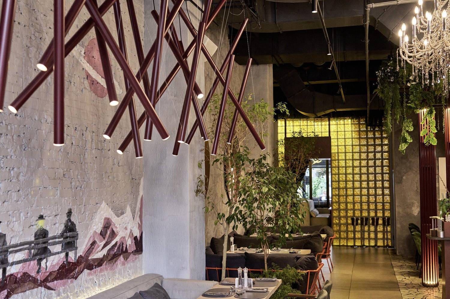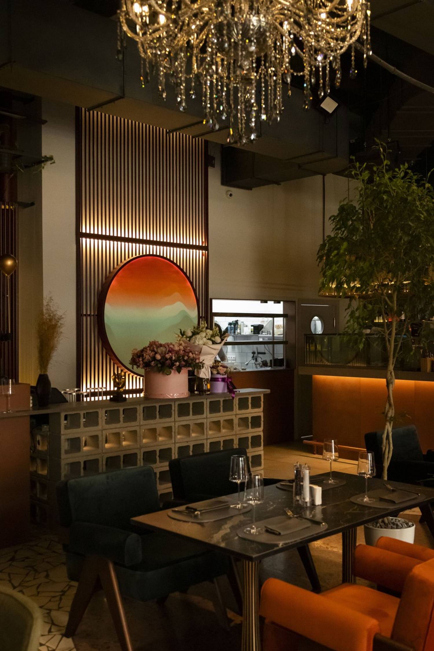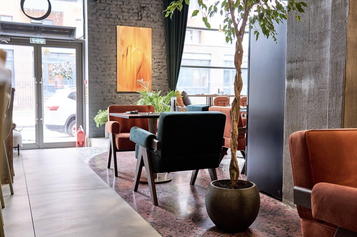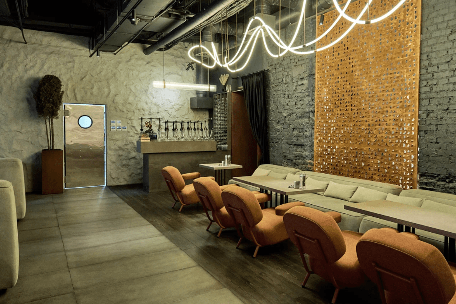 Атмосфера. Современный интерьер с панорамными окнами, зонированием под разные сценарии: светлый зал для завтраков, лаунж-зона с низкими диванами и отдельный кальянный зал. По вечерам мягкое освещение сменяется неоновыми акцентами для вечеринок.