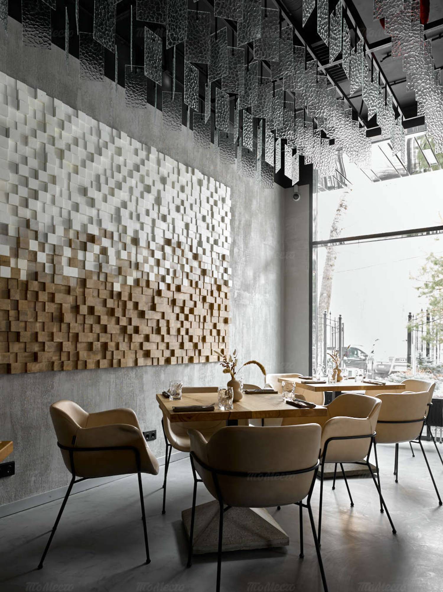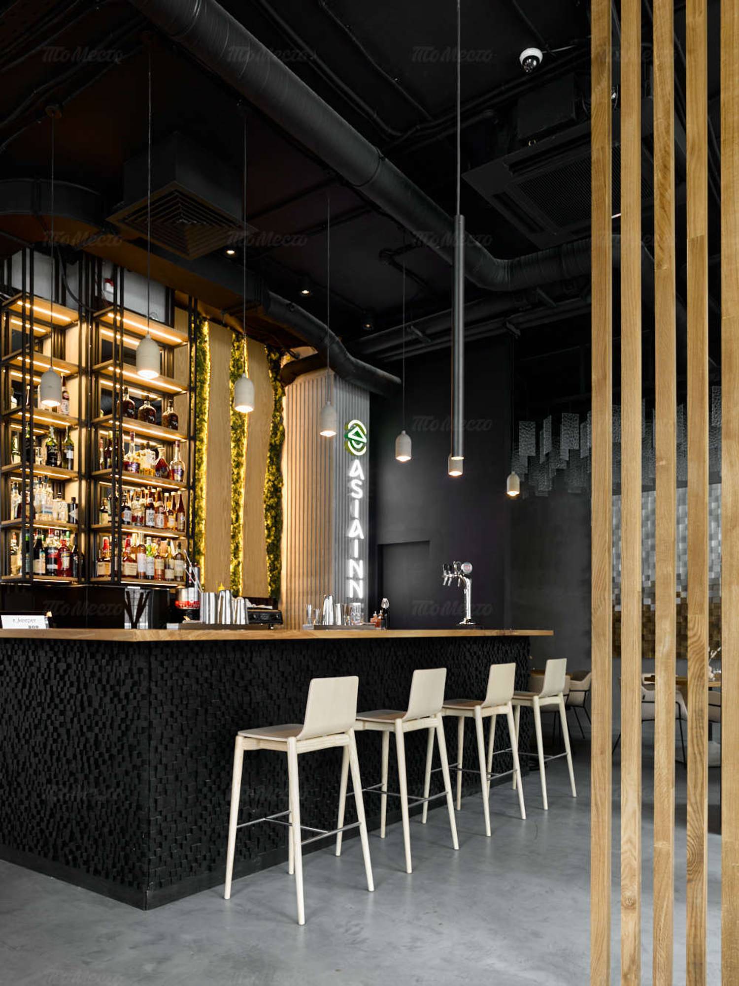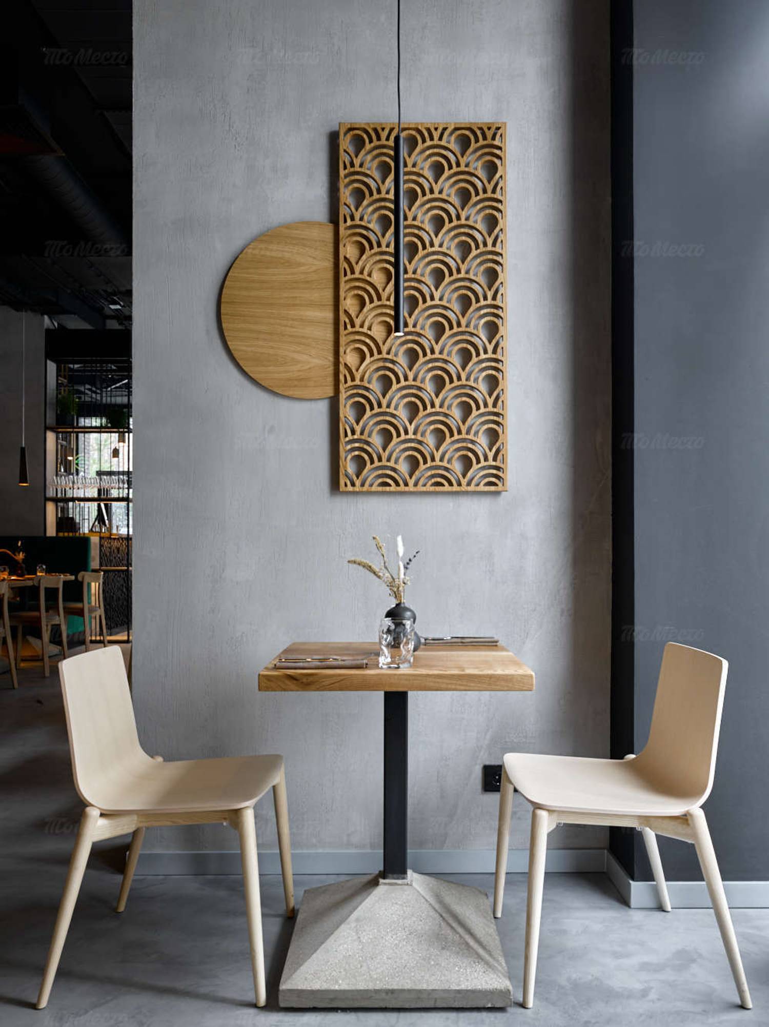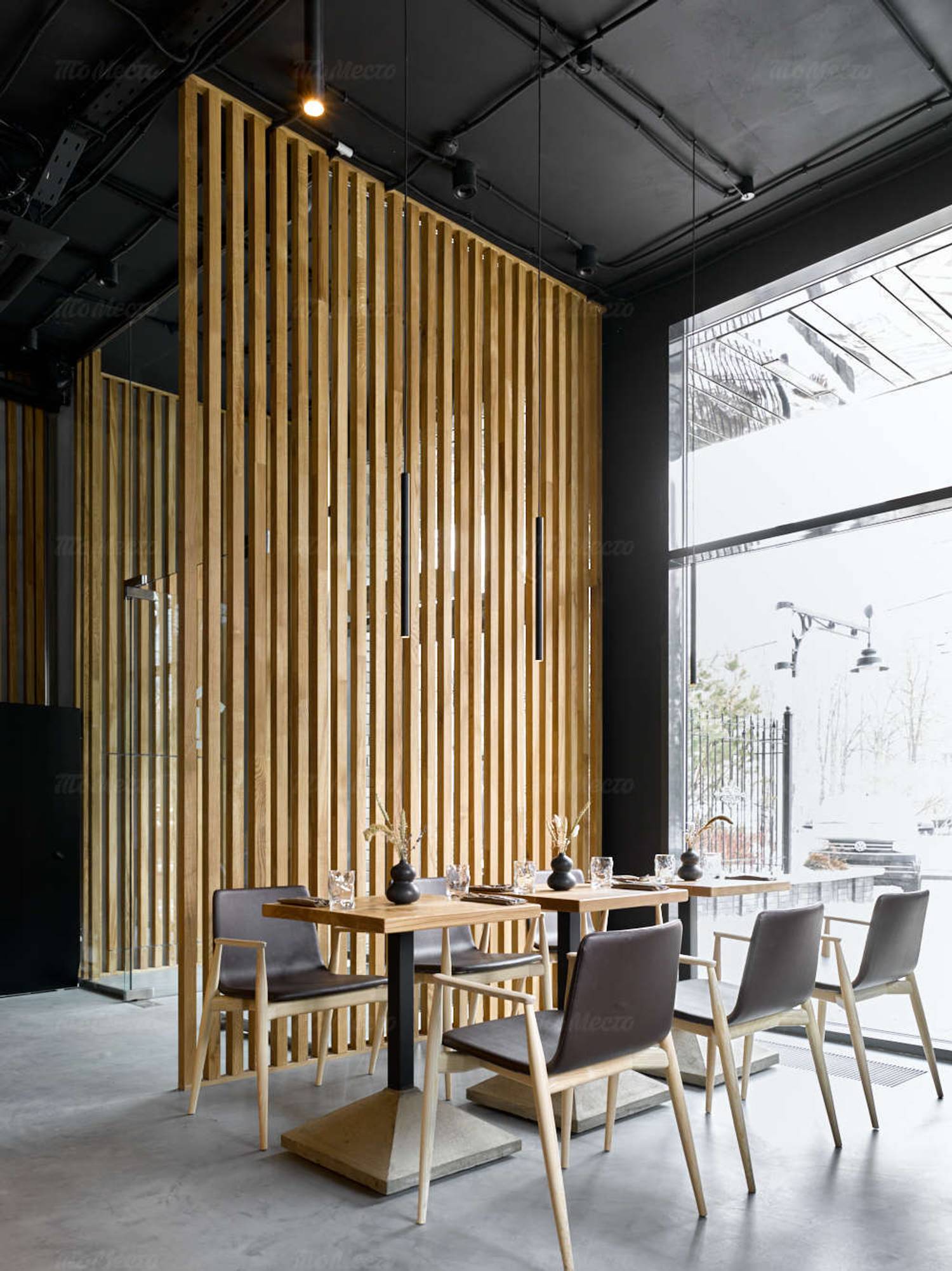 Атмосфера. Пространство с высокими потолками и серо-деревянной палитрой напоминает современные рестораны Сингапура. Изумрудные акценты, стабилизированный мох за стойкой и живые растения создают контраст между урбанистическим минимализмом и природной свежестью. Большие расстояния между столиками обеспечивают зонирование, а летом открывается терраса, которая становится дополнительной локацией для неформальных встреч.