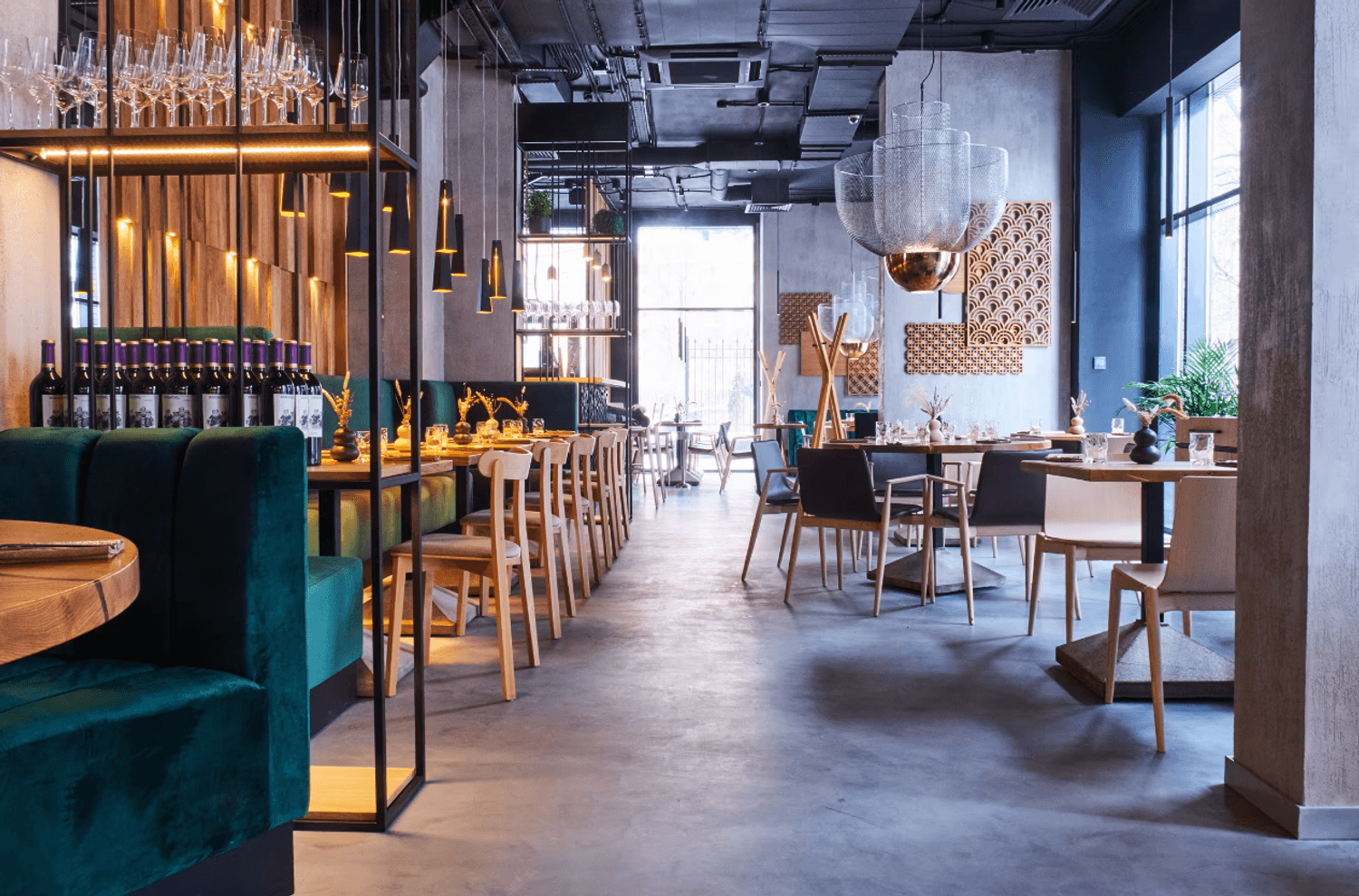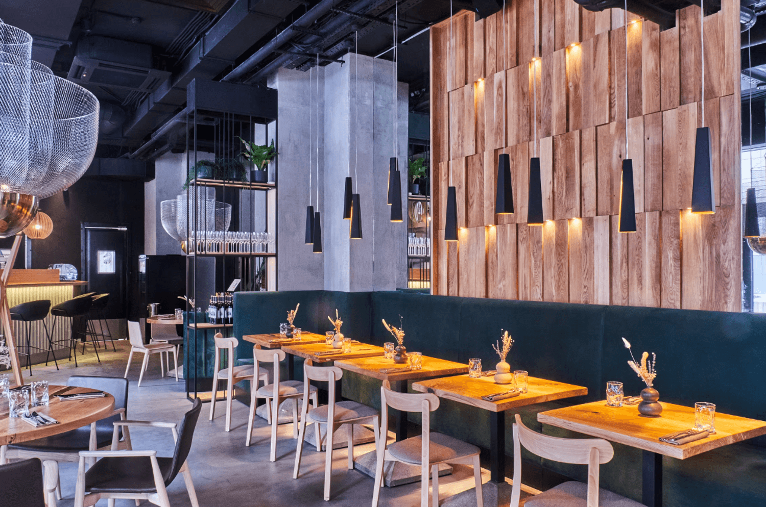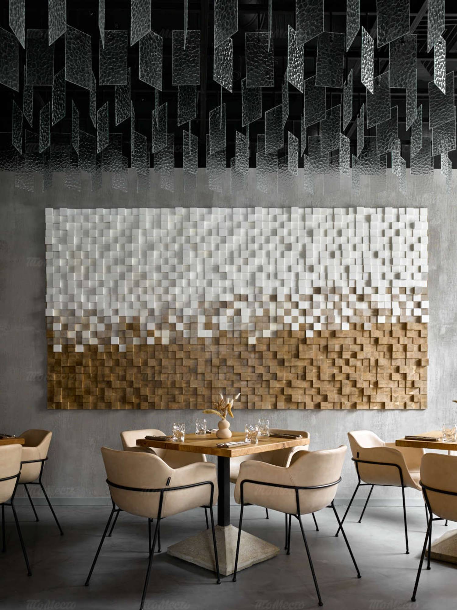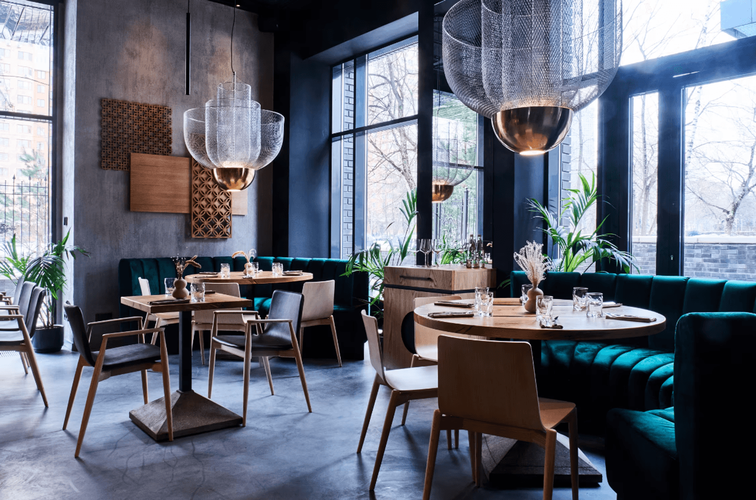Атмосфера. Пространство с высокими потолками и серо-деревянной палитрой напоминает современные рестораны Сингапура. Изумрудные акценты, стабилизированный мох за стойкой и живые растения создают контраст между урбанистическим минимализмом и природной свежестью. Большие расстояния между столиками обеспечивают зонирование, а летом открывается терраса, которая становится дополнительной локацией для неформальных встреч.