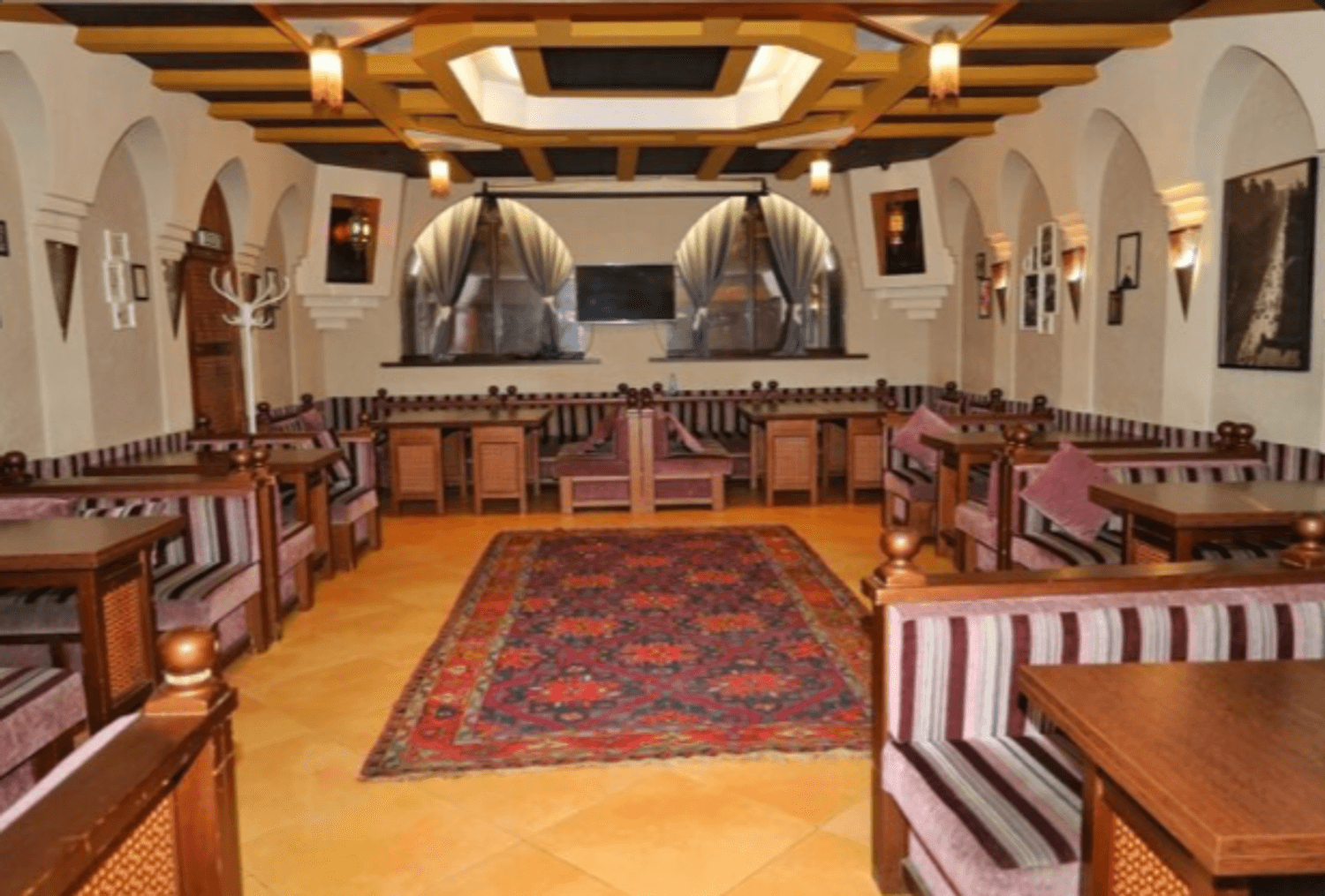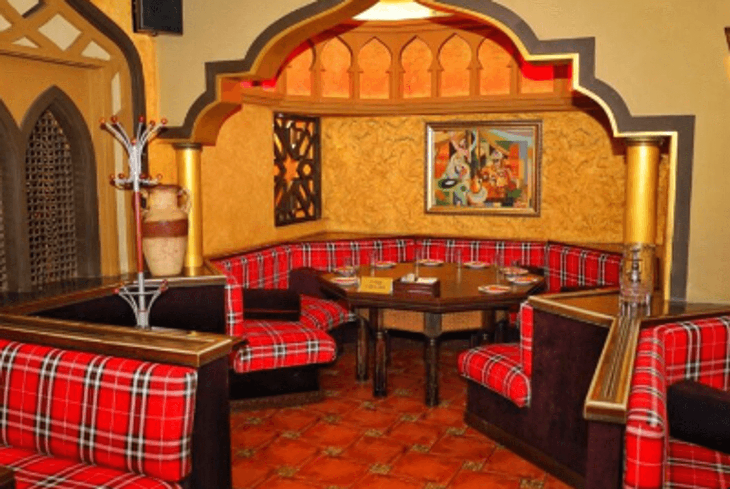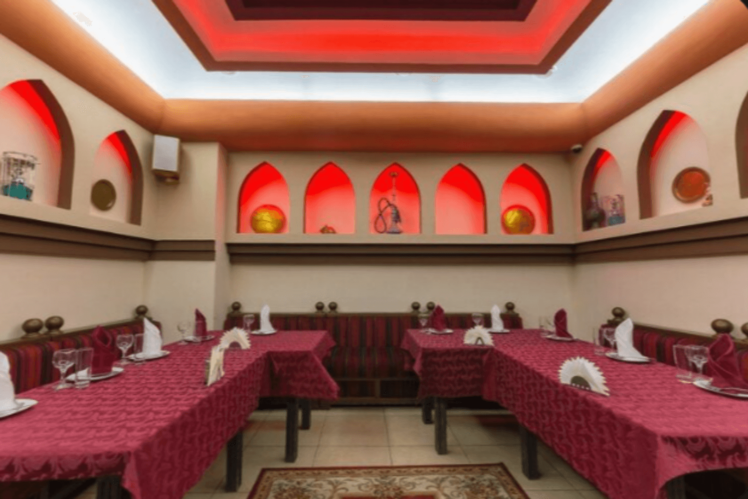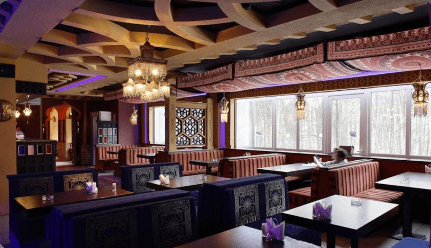 Атмосфера. Пространство оформлено в восточном стиле: высокие арочные своды, расписные ковры, латунные лампы с бисерной отделкой и живые растения создают уют и ощущение погружения в атмосферу Ливана. Основной зал рассчитан на 150 гостей, для небольших компаний есть комнаты на 12–25 человек, VIP-залы и зал с проектором на 50 человек.