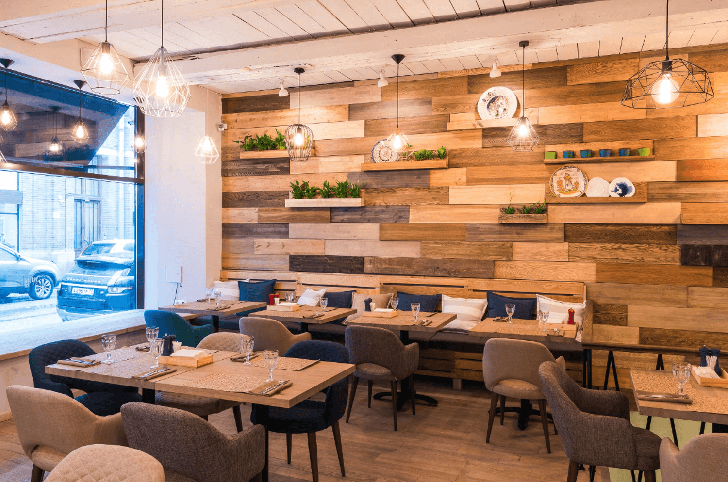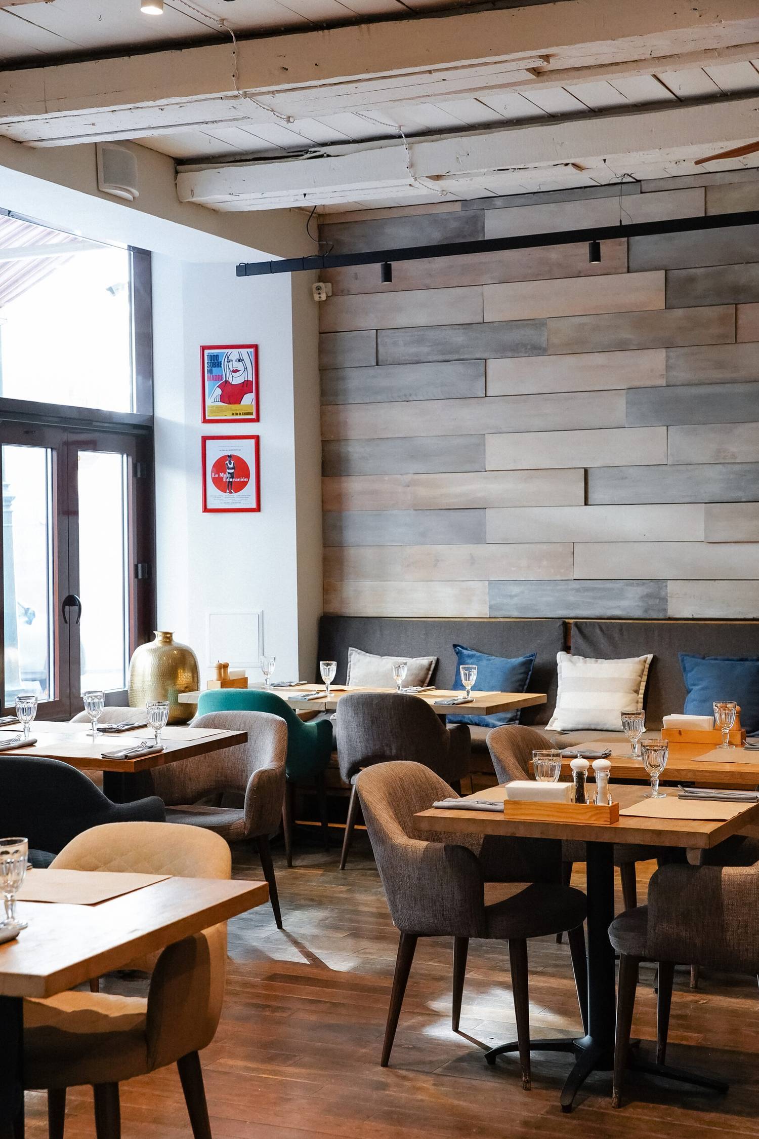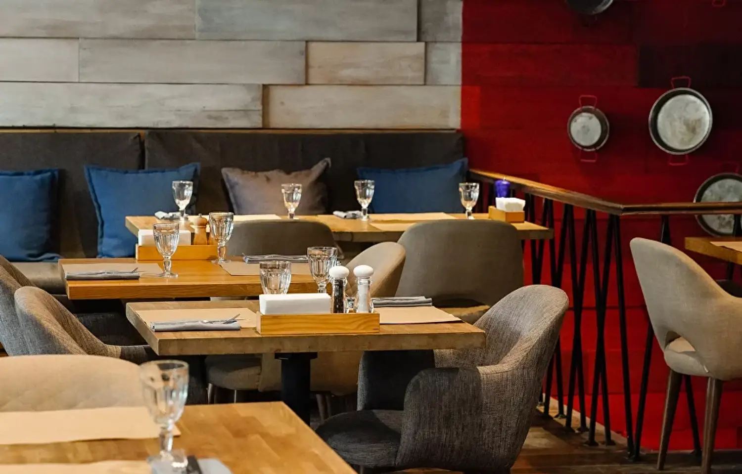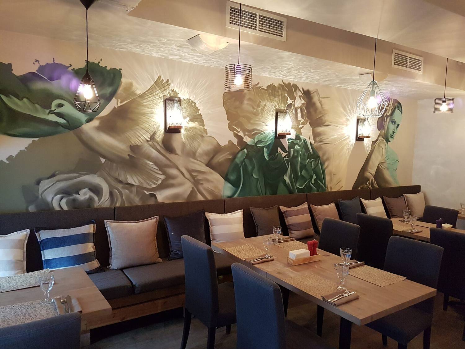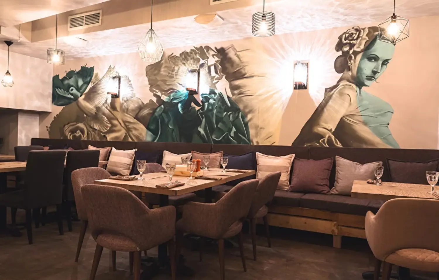 Атмосфера. Интерьер сочетает светлые тона с деревянными панелями и яркими элементами в стиле фламенко. Дизайнерские светильники, диваны шоколадного оттенка и декоративные детали вроде полигональной головы быка создают уютное и одновременно выразительное пространство, напоминающее гостеприимный и современный испанский дом.