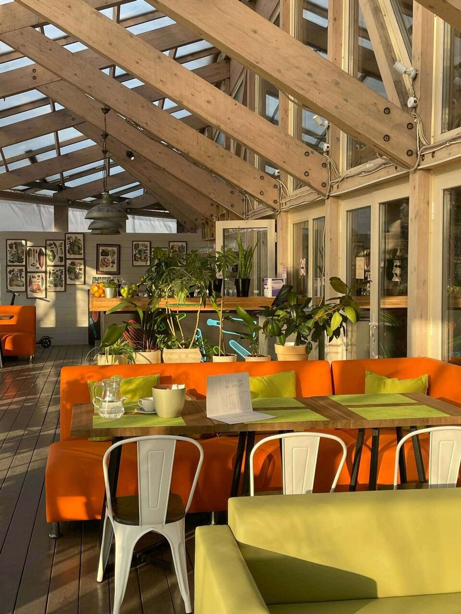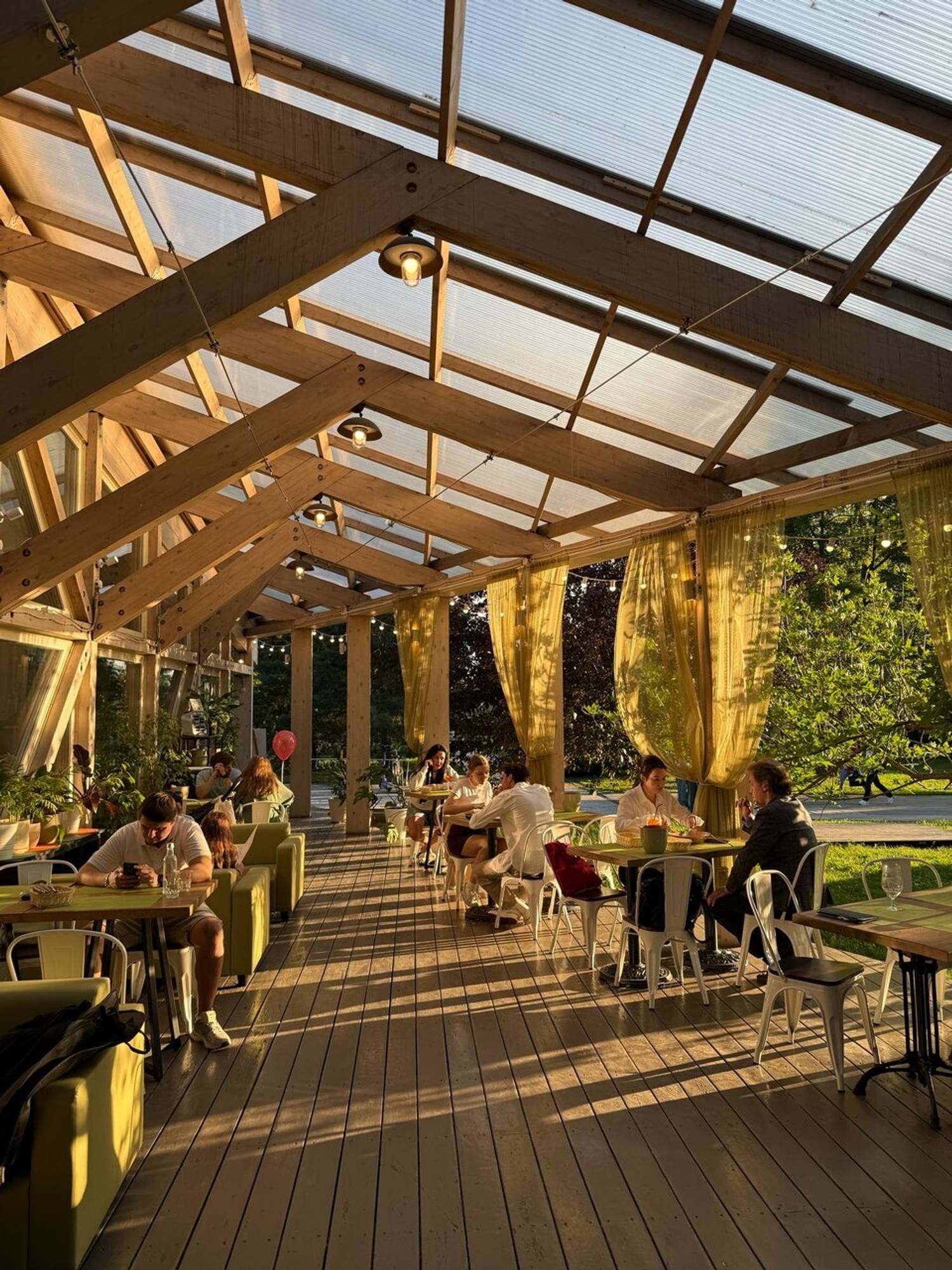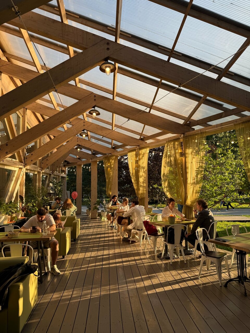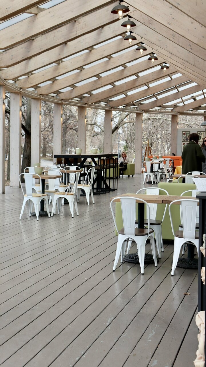 Атмосфера. Пространство с прозрачной крышей, деревянной мебелью, клетчатыми скатертями и живыми растениями создает атмосферу отдыха на террасе где-то в загородном доме. Вид на набережную и парк становится главным преимуществом в теплое время года: наслаждаясь трапезой гости могут одновременно наслаждаться живописными пейзажами и хорошей погодой. А если на улице дождь или снег, то здесь становится вдвойне уютнее!