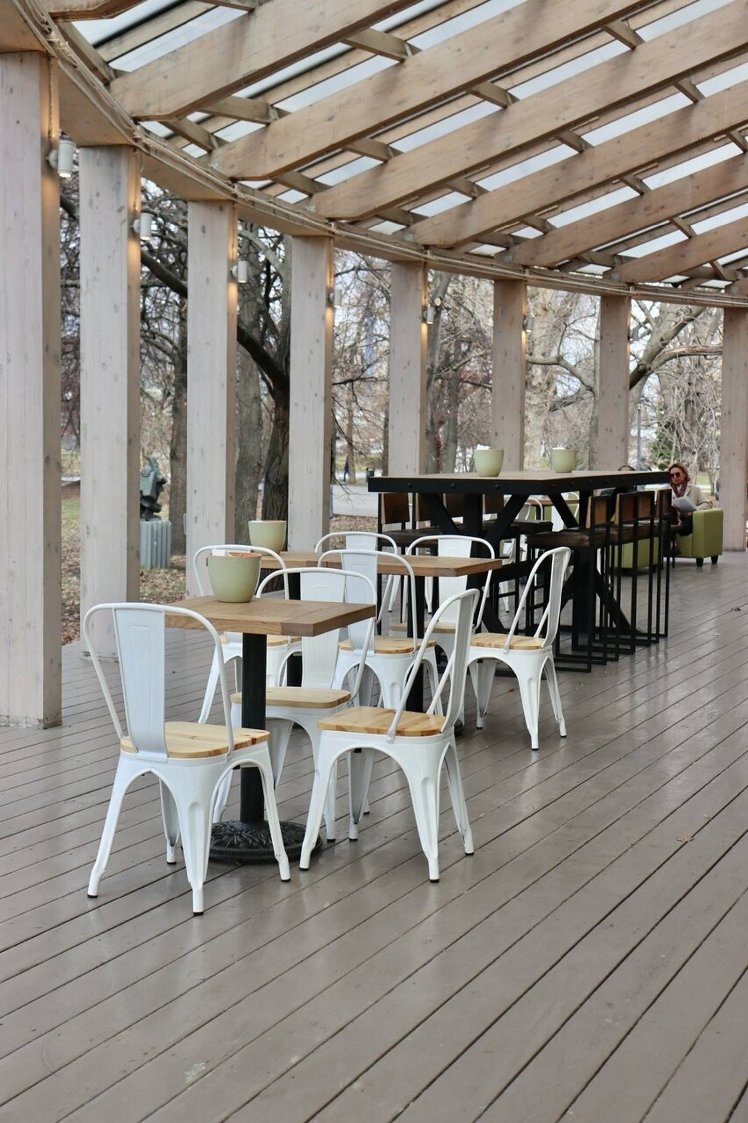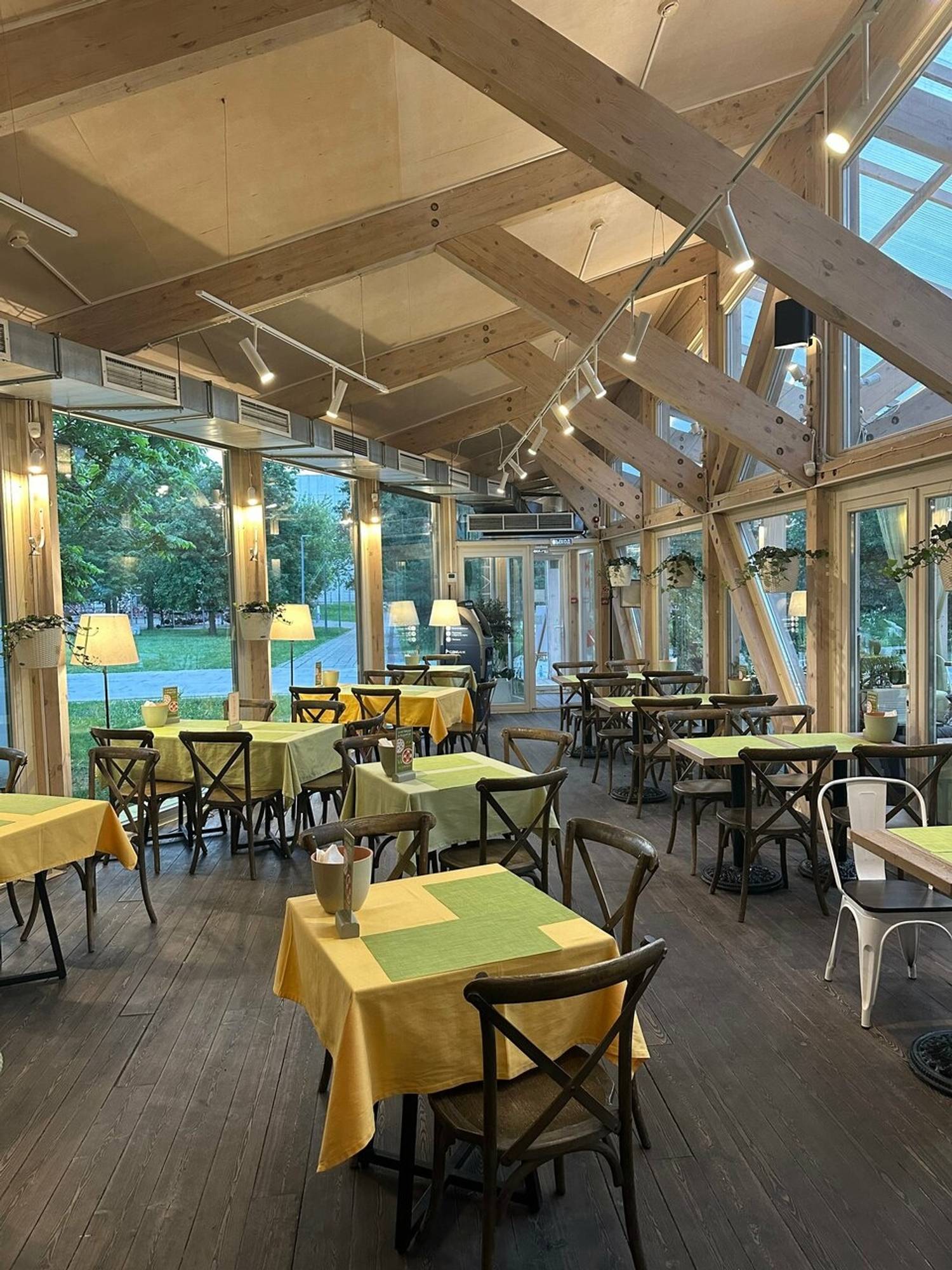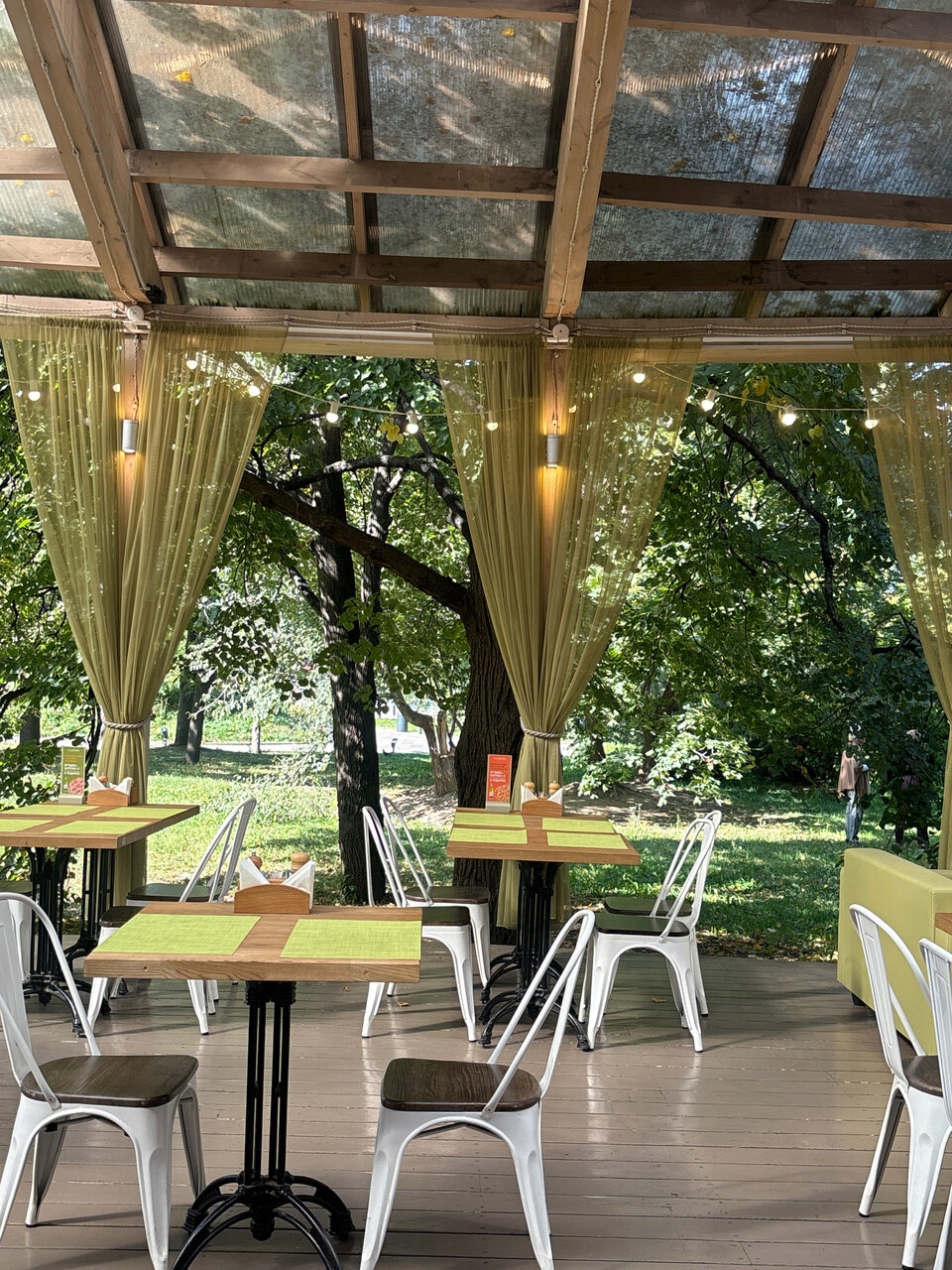 Атмосфера. Пространство с прозрачной крышей, деревянной мебелью, клетчатыми скатертями и живыми растениями создает атмосферу отдыха на террасе где-то в загородном доме. Вид на набережную и парк становится главным преимуществом в теплое время года: наслаждаясь трапезой гости могут одновременно наслаждаться живописными пейзажами и хорошей погодой. А если на улице дождь или снег, то здесь становится вдвойне уютнее!