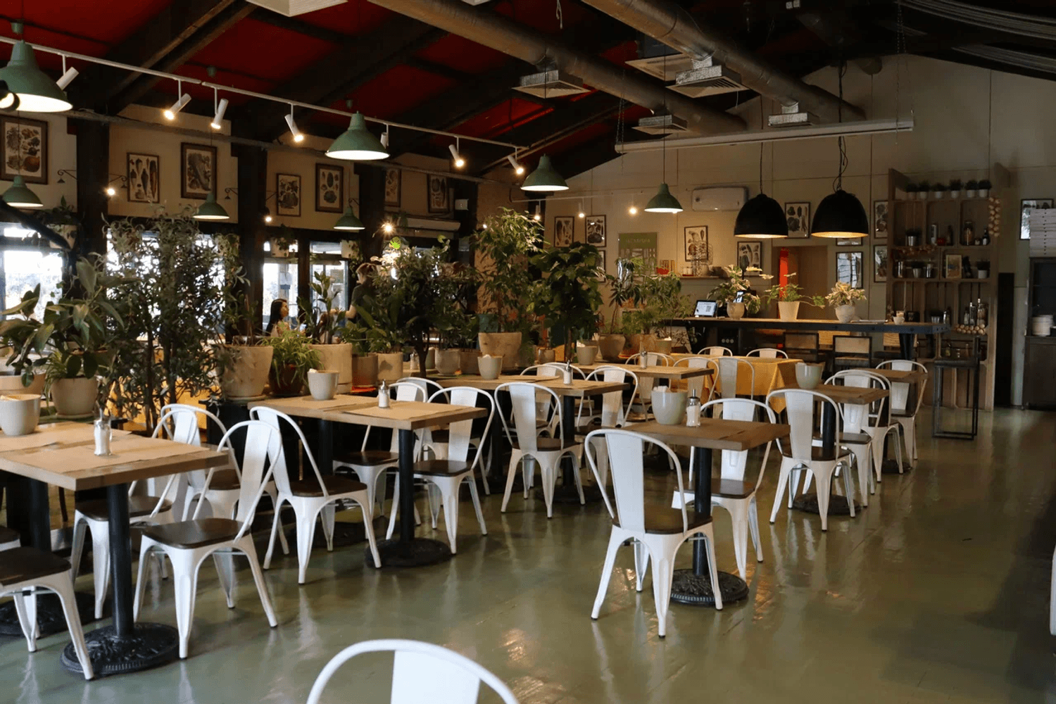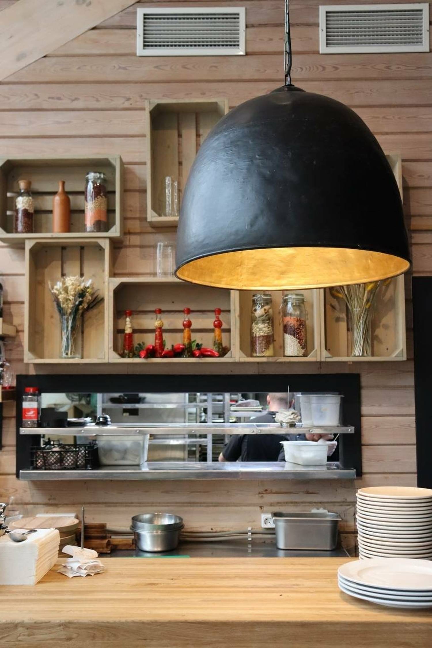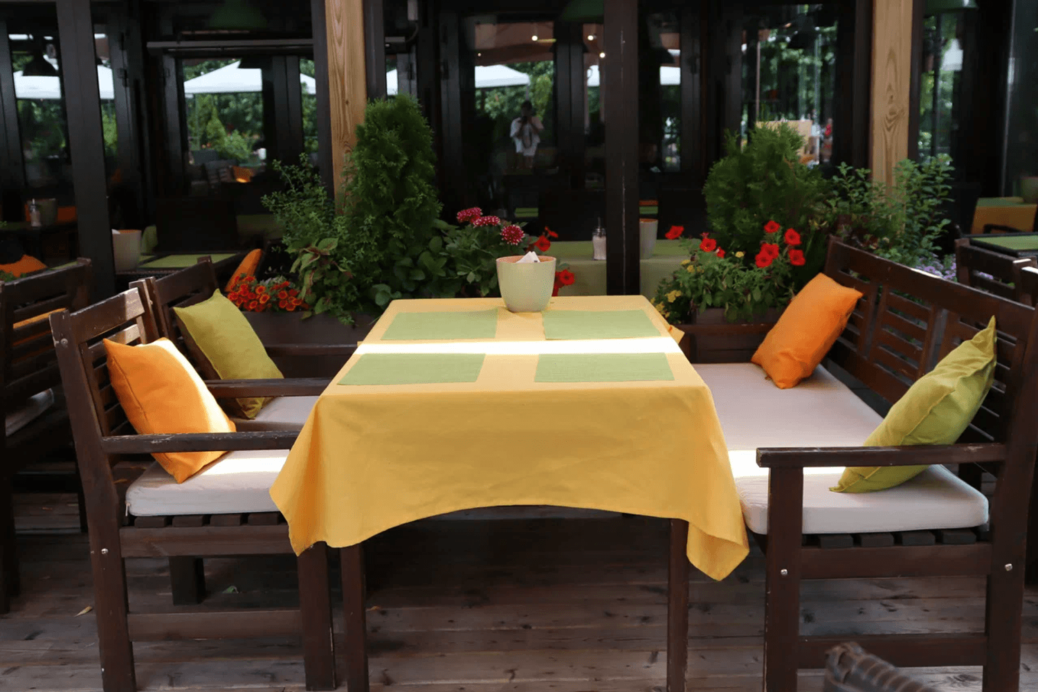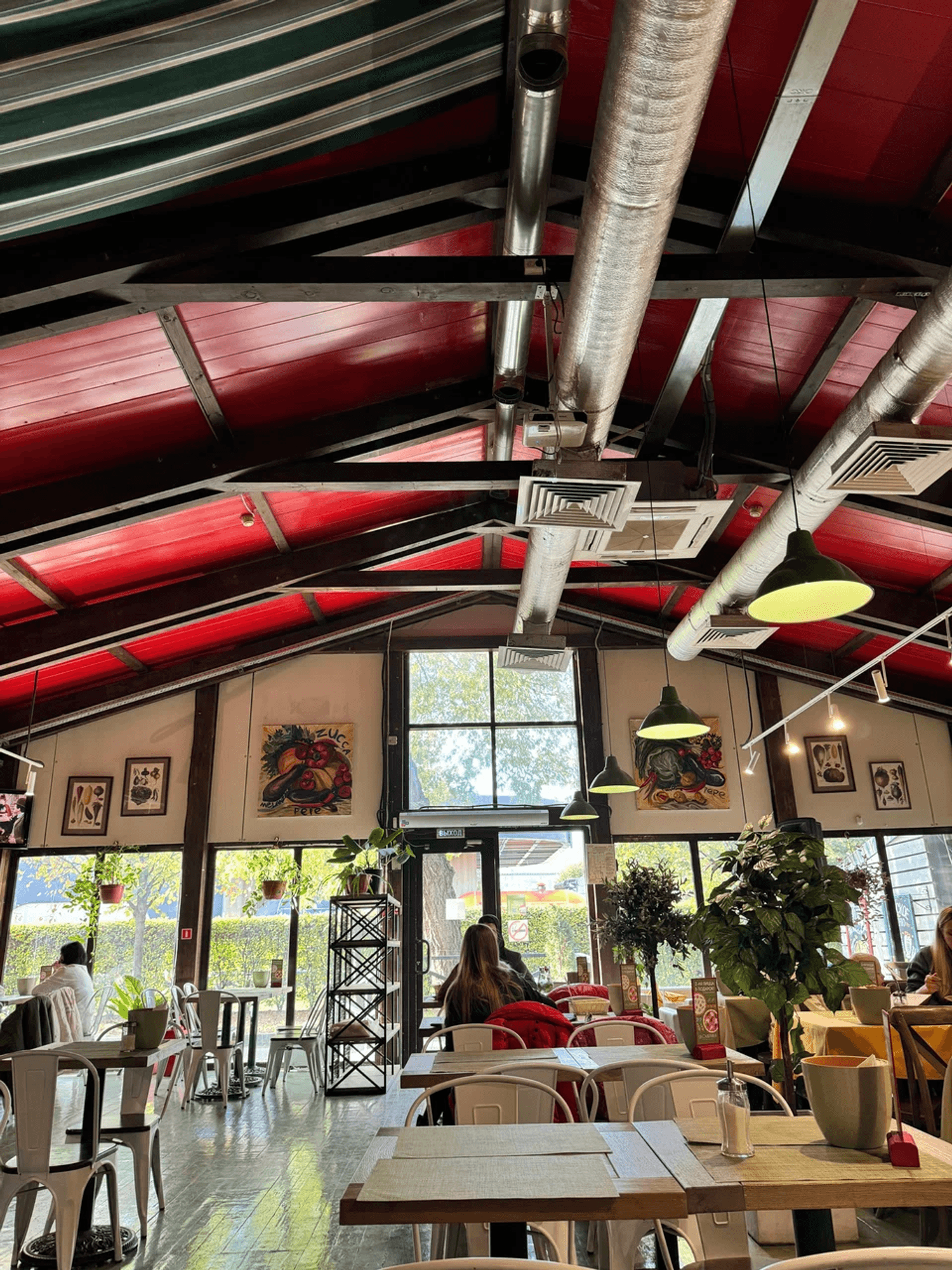 Атмосфера. Пространство с прозрачной крышей, деревянной мебелью, клетчатыми скатертями и живыми растениями создает атмосферу отдыха на террасе где-то в загородном доме. Вид на набережную и парк становится главным преимуществом в теплое время года: наслаждаясь трапезой гости могут одновременно наслаждаться живописными пейзажами и хорошей погодой. А если на улице дождь или снег, то здесь становится вдвойне уютнее!