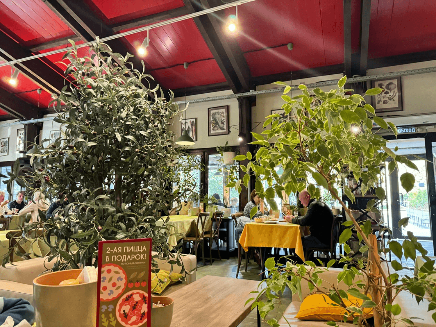 Еда и напитки. В меню — пицца на тонком тесте, паста, ризотто с морепродуктами и салаты. На десерт можно взять тирамису или домашние трюфельные конфеты. В баре представлены авторские лимонады, ягодные чаи, глинтвейн и сангрия.