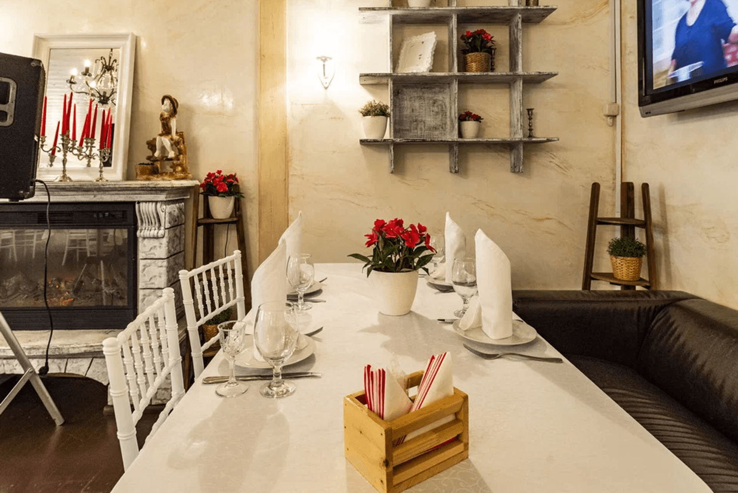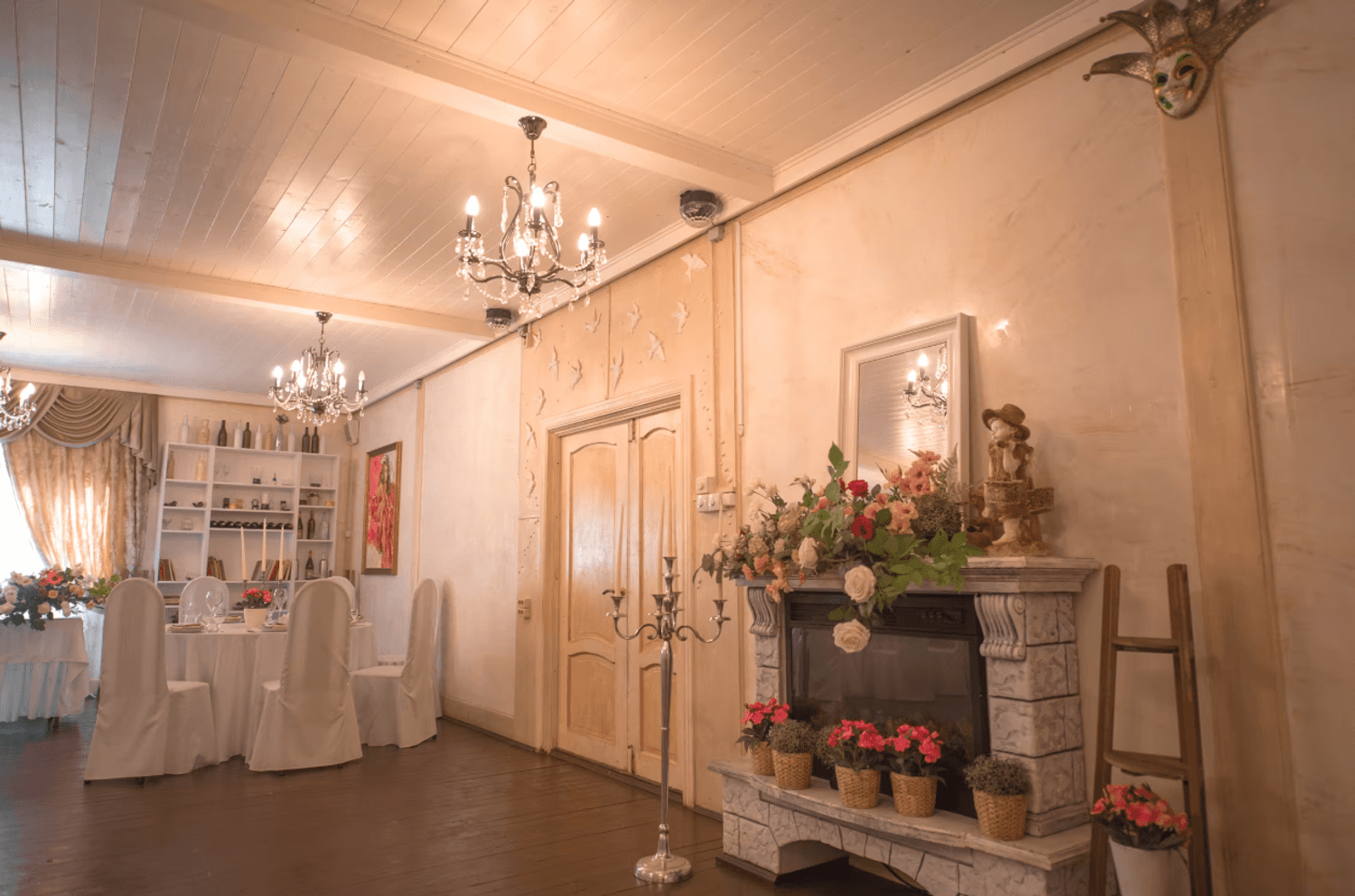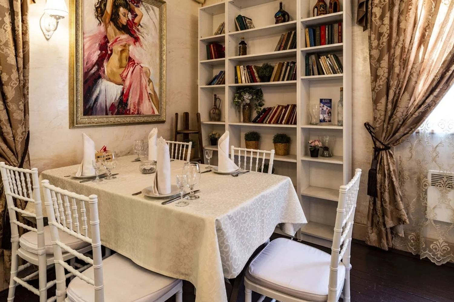 Атмосфера. Ресторан занимает несколько деревянных домиков и основной зал, оформленные в духе прованса и европейской элегантности. Столы накрыты кремовыми скатертями и украшены цветочными композициями, на полках книги и комнатные растения. В теплое время года открыта веранда, где приятно проводить время на свежем воздухе.