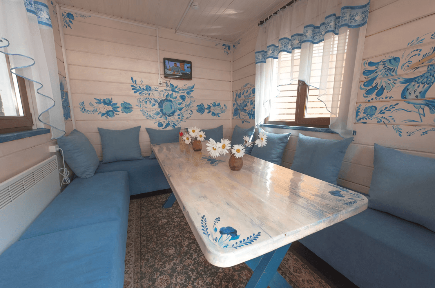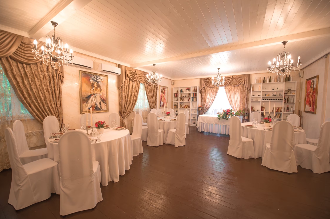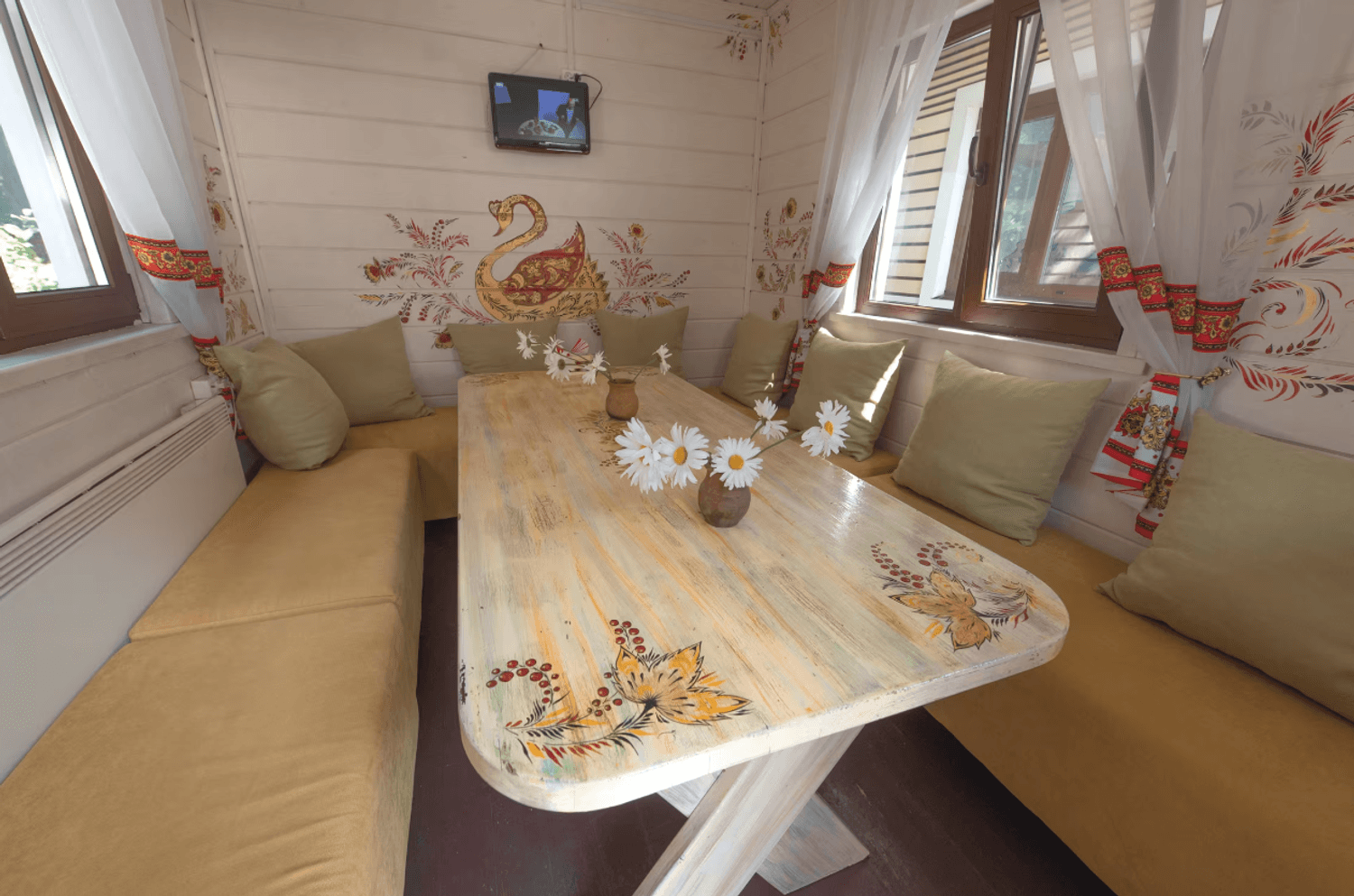 Атмосфера. Ресторан занимает несколько деревянных домиков и основной зал, оформленные в духе прованса и европейской элегантности. Столы накрыты кремовыми скатертями и украшены цветочными композициями, на полках книги и комнатные растения. В теплое время года открыта веранда, где приятно проводить время на свежем воздухе.