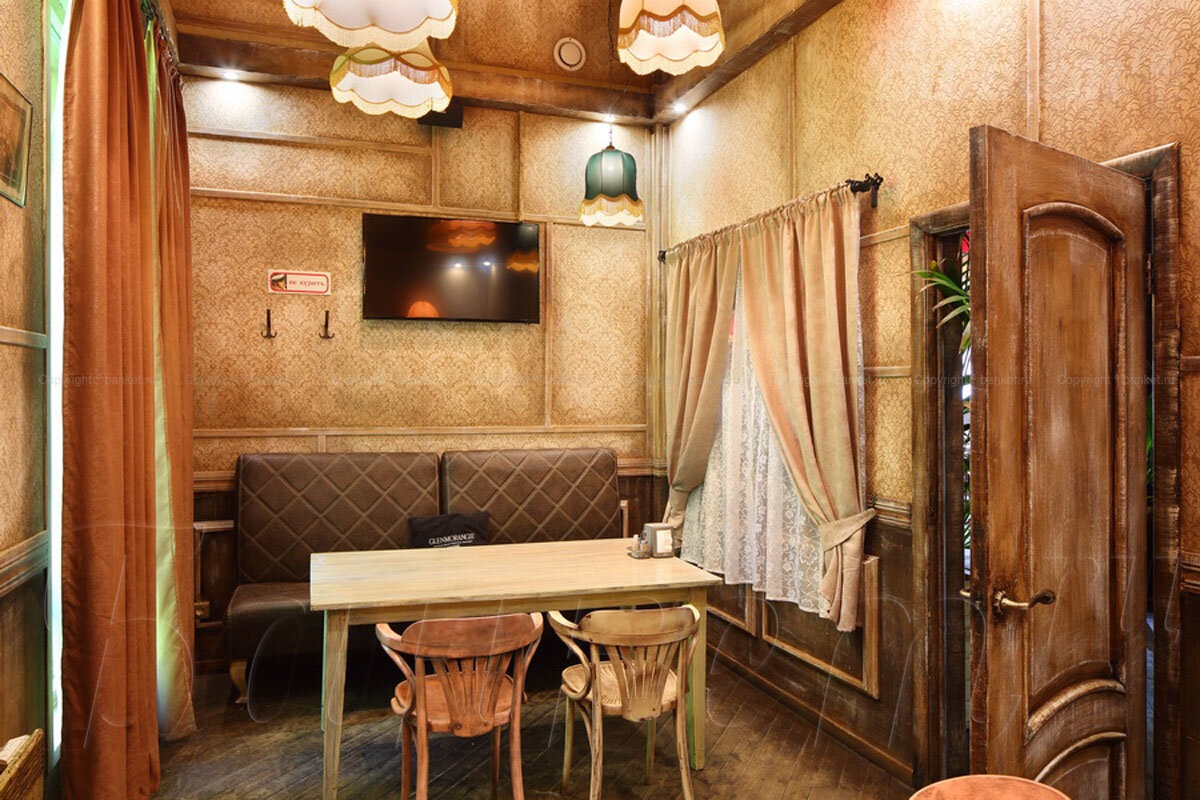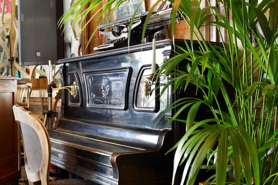 Атмосфера. Люстры-торшеры, винтажные картины, ажурное зеркало в золоченой раме и черное фортепиано — все это стилизация прошлой эпохи. Здесь помимо основного зала, есть веранда с березами и два отдельных кабинета для частных мероприятий до 20 человек каждый.