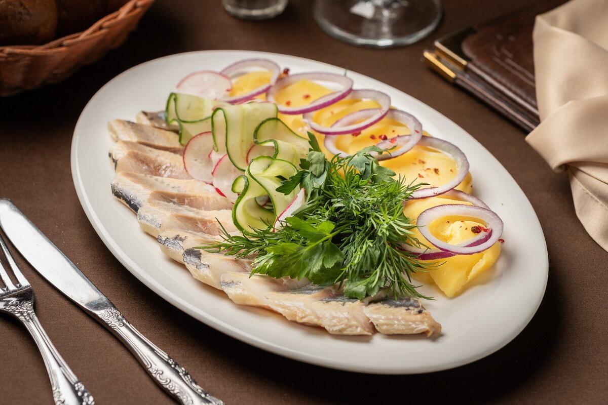Еда и напитки. В меню — русская классика и европейские блюда: салат 12 стульев, мидии под сырной шапкой и соусом песто, уха из судака с лососем, куриные котлетки под сливочным соусом, утиная грудка. На десерт можно попробовать вишневый штрудель и шоколадный торт.