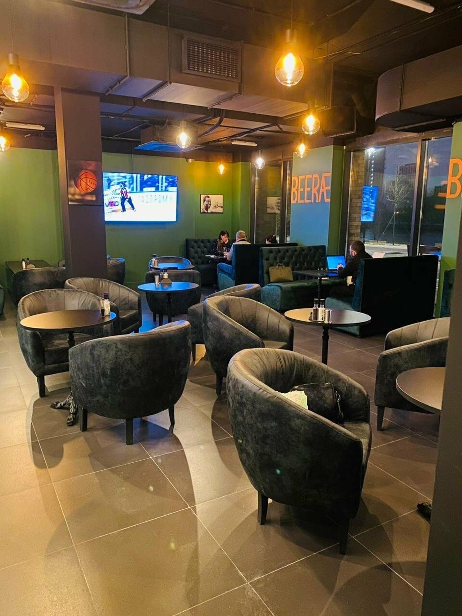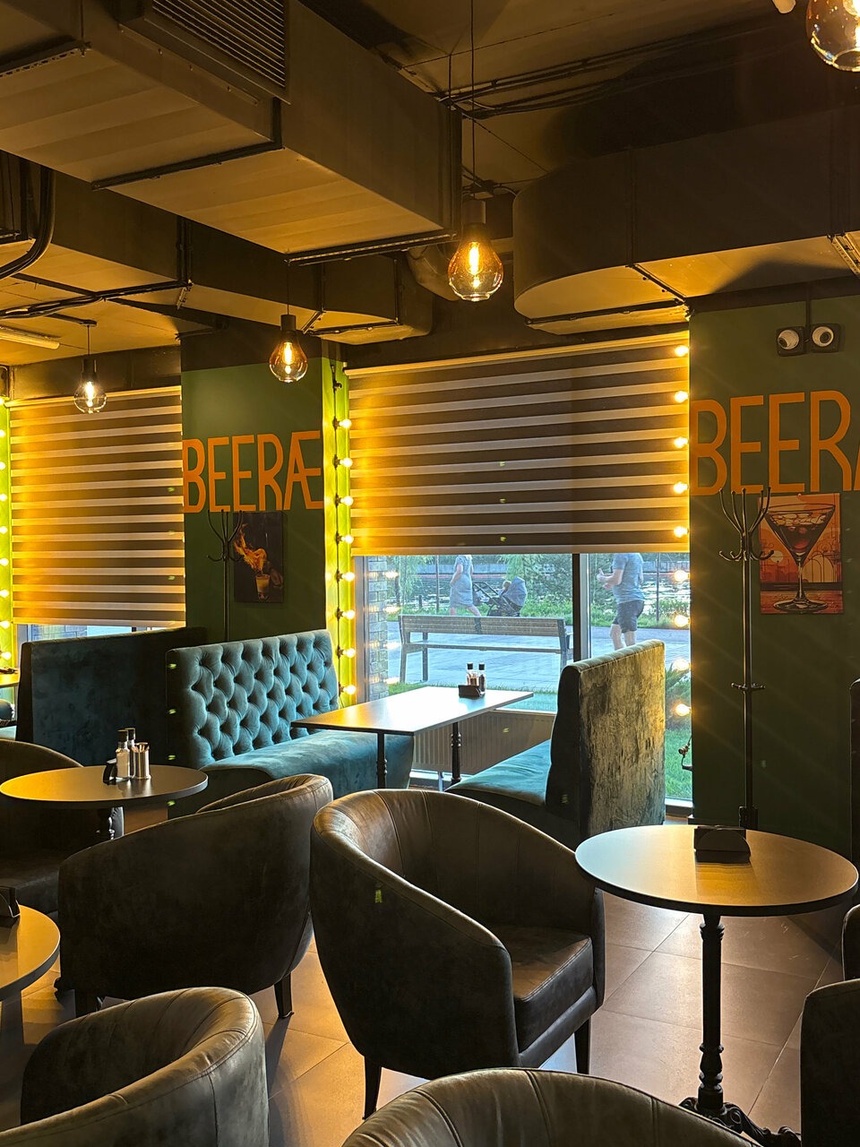 Атмосфера. В зале изумрудные стены с постерами, черные велюровые кресла, синие диваны и графитовые акценты. Есть сцена, на которо выступают музыканты и стендап-комики.